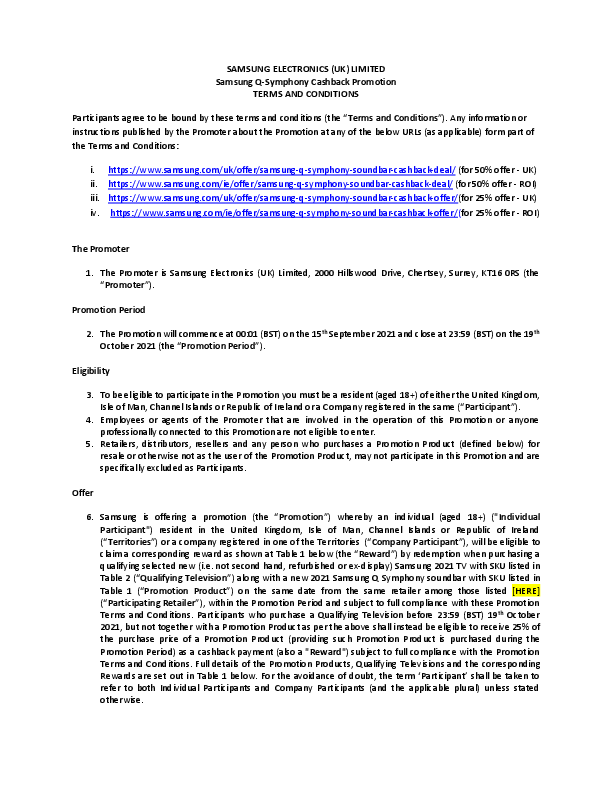 6. Samsung is offering a promotion (the "Promotion") whereby an individual (aged 18+) ("Individual Participant") resident in the United Kingdom, Isle of Man, Channel Islands or Republic of Ireland ("Territories") or a company registered in one of the Territories ("Company Participant"), will be eligible to claim a corresponding reward as shown at Table 1 below (the "Reward") by redemption when purchasing a qualifying selected new (i.e. not second hand, refurbished or ex-display) Samsung 2021 TV with SKU listed in Table 2 ("Qualifying Television") along with a new 2021 Samsung Q Symphony soundbar with SKU listed in Table 1 ("Promotion Product") on the same date from the same retailer among those listed [HERE] ("Participating Retailer"), within the Promotion Period and subject to full compliance with these Promotion Terms and Conditions. Participants who purchase a Qualifying Television before 23:59 (BST) 19th October 2021, but not together with a Promotion Product as per the above shall instead be eligible to receive 25% of the purchase price of a Promotion Product (providing such Promotion Product is purchased during the Promotion Period) as a cashback payment (also a "Reward") subject to full compliance with the Promotion Terms and Conditions. Full details of the Promotion Products, Qualifying Televisions and the corresponding Rewards are set out in Table 1 below. For the avoidance of doubt, the term `Participant' shall be taken to refer to both Individual Participants and Company Participants (and the applicable plural) unless stated otherwise.