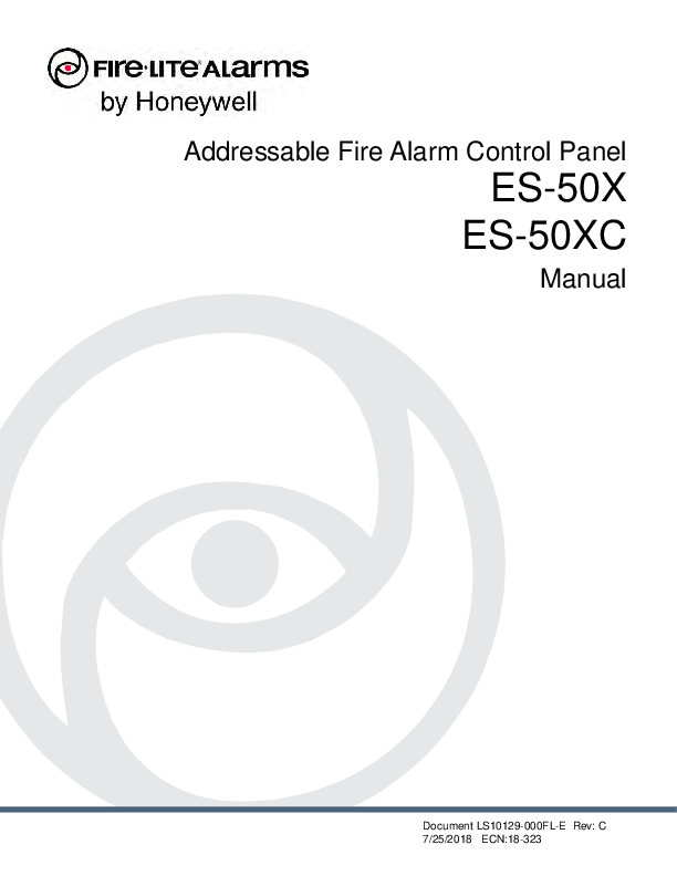 Addressable Fire Alarm Control Panel ES-50X ES-50XC Manual Document LS10129-000FL-E Rev: C 7/25/2018 ECN:18-323 Fire Alarm & Emergency Communication System Limitations While a life safety system may lower insurance rates, it is not a substitute for life and property insurance! An automatic fire alarm system--typically made up of smoke detectors, heat detectors, manual pull stations, audible warning devices, and a fire alarm control panel (FACP) with remote notification capability--can provide early warning of a developing fire. Such a system, however, does not assure protection against property damage or loss of life resulting from a fire. An emergency communication system--typically made up of an automatic fire alarm system (as described above) and a life safety communication system that may include an autonomous control unit (ACU), local operating console (LOC), voice communication, and other various interoperable communication methods--can broadcast a mass notification message. Such a system, however, does not assure protection against property damage or loss of life Heat detectors do not sense particles of combustion and alarm only when heat on their sensors increases at a predetermined rate or reaches a predetermined level. Rate-of-rise heat detectors may be subject to reduced sensitivity over time. For this reason, the rateof-rise feature of each detector should be tested at least once per year by a qualified fire protection specialist. Heat detectors are designed to protect property, not life. IMPORTANT! Smoke detectors must be installed in the same room as the control panel and in rooms used by the system for the connection of alarm transmission wiring, communications, signaling, and/or power. If detectors are not so located, a developing fire may damage the alarm system, compromising its ability to report a fire. resulting from a fire or life safety event. The Manufacturer recommends that smoke and/or heat detectors be located throughout a protected premises following the recommendations of the current edition of the National Fire Protection Association Standard 72 (NFPA 72), manufacturer's recommendations, State and local codes, and the recommendations contained in the Guide for Proper Use of System Smoke Detectors, which is made available at no charge to all installing dealers. This document can be found at http:// www.systemsensor.com/appguides/. A study by the Federal Emergency Management Agency (an agency of the United States government) indicated that smoke detectors may not go off in as many as 35% of all fires. While fire alarm systems are designed to provide early warning against fire, they do not guarantee warning or protection against fire. A fire alarm system may not provide timely or adequate warning, or simply may not function, for a variety of reasons: Smoke detectors may not sense fire where smoke cannot reach the detectors such as in chimneys, in or behind walls, on roofs, or on the other side of closed doors. Smoke detectors also may not sense a fire on another level or floor of a building. A second-floor detector, for example, may not sense a first-floor or basement fire. Particles of combustion or "smoke" from a developing fire may not reach the sensing chambers of smoke detectors because: · Barriers such as closed or partially closed doors, walls, chimneys, even wet or humid areas may inhibit particle or smoke flow. · Smoke particles may become "cold," stratify, and not reach the ceiling or upper walls where detectors are located. · Smoke particles may be blown away from detectors by air outlets, such as air conditioning vents. · Smoke particles may be drawn into air returns before reaching the detector. The amount of "smoke" present may be insufficient to alarm smoke detectors. Smoke detectors are designed to alarm at various levels of smoke density. If such density levels are not created by a developing fire at the location of detectors, the detectors will not go into alarm. Smoke detectors, even when working properly, have sensing limitations. Detectors that have photoelectronic sensing chambers tend to detect smoldering fires better than flaming fires, which have little visible smoke. Detectors that have ionizing-type sensing chambers tend to detect fast-flaming fires better than smoldering fires. Because fires develop in different ways and are often unpredictable in their growth, neither type of detector is necessarily best and a given type of detector may not provide adequate warning of a fire. Smoke detectors cannot be expected to provide adequate warning of fires caused by arson, children playing with matches (especially in bedrooms), smoking in bed, and violent explosions (caused by escaping gas, improper storage of flammable materials, etc.). Audible warning devices such as bells, horns, strobes, speakers and displays may not alert people if these devices are located on the other side of closed or partly open doors or are located on another floor of a building. Any warning device may fail to alert people with a disability or those who have recently consumed drugs, alcohol, or medication. Please note that: · An emergency communication system may take priority over a fire alarm system in the event of a life safety emergency. · Voice messaging systems must be designed to meet intelligibility requirements as defined by NFPA, local codes, and Authorities Having Jurisdiction (AHJ). · Language and instructional requirements must be clearly disseminated on any local displays. · Strobes can, under certain circumstances, cause seizures in people with conditions such as epilepsy. · Studies have shown that certain people, even when they hear a fire alarm signal, do not respond to or comprehend the meaning of the signal. Audible devices, such as horns and bells, can have different tonal patterns and frequencies. It is the property owner's responsibility to conduct fire drills and other training exercises to make people aware of fire alarm signals and i
