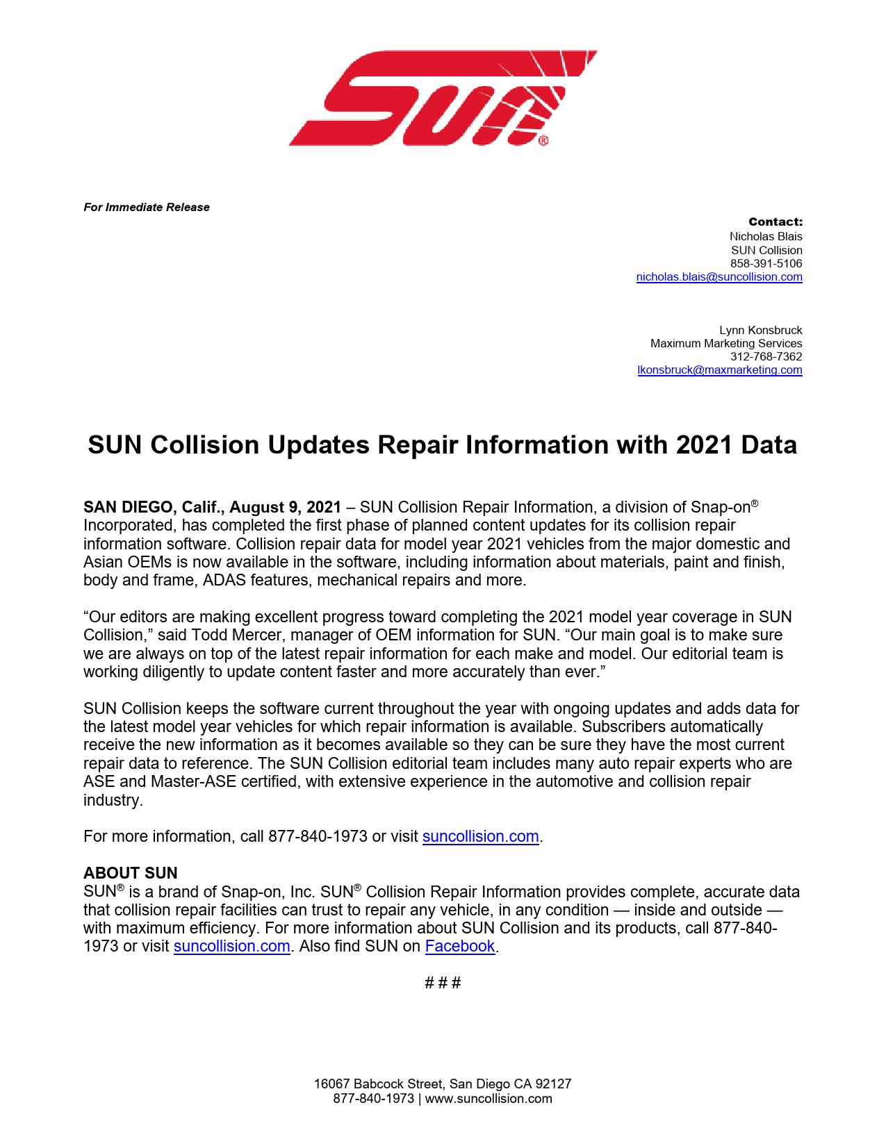 For Immediate Release Contact: Nicholas Blais SUN Collision 858-391-5106 nicholas.blais@suncollision.com Lynn Konsbruck Maximum Marketing Services 312-768-7362 lkonsbruck@maxmarketing.com SUN Collision Updates Repair Information with 2021 Data SAN DIEGO, Calif., August 9, 2021 SUN Collision Repair Information, a division of Snap-on® Incorporated, has completed the first phase of planned content updates for its collision repair information software. Collision repair data for model year 2021 vehicles from the major domestic and Asian OEMs is now available in the software, including information about materials, paint and finish, body and frame, ADAS features, mechanical repairs and more. "Our editors are making excellent progress toward completing the 2021 model year coverage in SUN Collision," said Todd Mercer, manager of OEM information for SUN. "Our main goal is to make sure we are always on top of the latest repair information for each make and model. Our editorial team is working diligently to update content faster and more accurately than ever." SUN Collision keeps the software current throughout the year with ongoing updates and adds data for the latest model year vehicles for which repair information is available. Subscribers automatically receive the new information as it becomes available so they can be sure they have the most current repair data to reference. The SUN Collision editorial team includes many auto repair experts who are ASE and Master-ASE certified, with extensive experience in the automotive and collision repair industry. For more information, call 877-840-1973 or visit suncollision.com. ABOUT SUN SUN® is a brand of Snap-on, Inc. SUN® Collision Repair Information provides complete, accurate data that collision repair facilities can trust to repair any vehicle, in any condition -- inside and outside -- with maximum efficiency. For more information about SUN Collision and its products, call 877-8401973 or visit suncollision.com. Also find SUN on Facebook. # # # 16067 Babcock Street, San Diego CA 92127 877-840-1973 | www.suncollision.comLynn Konsbruck Adobe PDF Library 21.5.92