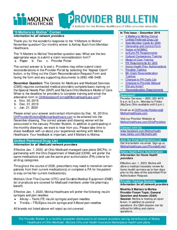 "It Matters to Molina" Corner Information for all network providers Thank you for the wonderful response to the "It Matters to Molina" November question! Our monthly winner is Ashley Bush from Meridian Healthcare. The "It Matters to Molina" November question was: What are the two appropriate ways to submit a claim reconsideration form? a. Paper b. Fax c. Provider Portal The correct answer is: b and c. Providers may either submit claim reconsiderations in the Provider Portal by selecting the "Appeal Claim" button, or by filling out the Claim Reconsideration Request Form and faxing the form and any supporting documents to (800) 499-3406. December Question: The Centers for Medicare and Medicaid Services (CMS) requires contracted medical providers complete basic training on the Special Needs Plan (SNP) and MyCare Ohio Medicare Model of Care. When is the deadline for providers to complete training and email the attestation form to OHAttestationForms@MolinaHeathcare.com? a. Nov. 30, 2019 b. Dec. 31, 2019 c. Jan. 21, 2020 Please email your answer and contact information by Dec. 16, 2019 to OHProviderBulletin@MolinaHealthcare.com to be entered into the December drawing. The correct answer and drawing winner will be announced in the January Provider Bulletin. In addition to participating in the monthly drawings, we want to hear from you. Please take time to share feedback with us about your experience working with Molina Healthcare. Your feedback is important, and It Matters to Molina. Unified Preferred Drug List Information for all Medicaid network providers Effective Jan. 1, 2020, all Ohio Medicaid managed care plans (MCPs), in partnership with the Ohio Department of Medicaid (ODM), will prefer the same medications and use the same prior authorization (PA) criteria for all drug categories. Throughout the course of 2020, prescribers may need to transition certain patients from their current medication(s) or complete a PA for the patient to stay on his/her current medication(s). Molina's Over-The-Counter (OTC) and Durable Medical Equipment (DME) list of products are covered for Medicaid members under the pharmacy benefit. Effective Jan. 1, 2020, Molina Healthcare will prefer the following insulin syringes and pen needles: · Arkray TechLITE insulin syringes and pen needles · Trividia TRUEplus insulin syringe and 5-Bevel pen needles All brands not listed above will reject as not covered. In This Issue December 2019 It Matters to Molina Corner Unified Preferred Drug List New Member Cards for 2020 Ownership and Control Form Notice of NOMNC eviCore PA Requirements Cultural Competency Training Model of Care Training PA Requirements for UDS Home Health Prior Authorizations Provider Training BH Claim Reconsideration Training Changes to PA Code List Changes to Provider Manual Did you know? Reconsideration Requirements Questions? Provider Services (855) 322-4079 8 a.m. to 5 p.m., Monday to Friday (MyCare Ohio available until 6 p.m.) Email us at OHProviderRelations@ MolinaHealthcare.com Visit our Provider Website at MolinaHealthcare.com/OhioProviders Connect with Us www.facebook.com/MolinaHealth www.twitter.com/MolinaHealth Join Our Email Distribution List Get this bulletin via email. Sign up at MolinaHealthcare.com/ProviderEmail. Home Health Prior Authorization Information for Home Health providers Effective Jan. 1, 2020, Molina will allow a medical necessity review for home health services up to four days prior to the date of the submitted Prior Authorization Request. Provider Training Sessions Information for all network providers Monthly It Matters to Molina Provider Forum Topic: General Question and Answer (Q&A) Session: Molina is hosting an open forum. In addition to general questions, the Q&A session can be utilized for billing and claims questions. The Provider Bulletin is a monthly newsletter distributed to all network providers serving beneficiaries of Molina Healthcare of Ohio Medicaid, MyCare Ohio and Health Insurance Marketplace health care plans. PROVIDER BULLETIN MOLINA HEALTHCARE OF OHIO New Member Cards for 2020 Information for all network providers Starting in 2020, Molina member identification (ID) cards will have a new design. The differences include: · ID Card will be plastic instead of paper · ID Card will be in color instead of black and white Existing Molina members will continue to use the member ID card that issued at the time of enrollment. Providers may see the current paper, black and white ID cards in addition to the new plastic, color ID cards issued as new members enroll with Molina or lost ID cards are reissued. Ownership and Control Disclosure Form Requirements Information for providers in the Medicaid and MyCare Ohio networks As a reminder, providers are required to complete the Ownership and Control Disclosure Form during the initial contracting process and reattest every 36 months during the recredentialing process, or at any time disclosure needs to be made to the managed care plan. The form is available on the Molina website, under the "Forms" tab, under "Other Forms and Resources." Notice of Medicare Non-Coverage (NOMNC) Reminder Information for all network providers After the last covered date on a Molina-issued Notice of Medicare NonCoverage (NOMNC), providers must: · Issue a complete NOMNC on the correct CMS form · Deliver the NOMNC to the member and receive a valid signature dated at least two calendar days before the "Services Will End" date · Fax the signed NOMNC to Molina at (877) 708-2116 within 48 hours Important Note: Requesting a copy of a NOMNC or missing the patient signature will not extend the coverage period of the authorization. If requesting an appeal after the last covered date on a Molina-issued NOMNC, providers must: · Send the request for appeal no later than 12 p.m. on the day before the effective date indicated on the NOMNC to the Quality Improvement Organization (QIO) Livanta. All medical records requested by the QIO must be faxed with