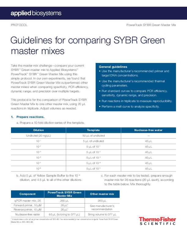 PROTOCOL PowerTrack SYBR Green Master Mix Guidelines for comparing SYBR Green master mixes Take the master mix challenge--compare your current SYBRTM Green master mix to Applied BiosystemsTM PowerTrackTM SYBRTM Green Master Mix using this simple protocol. In our own experiments, we found that PowerTrack SYBR Green Master Mix outperformed other master mixes when comparing specificity, PCR efficiency, dynamic range, and precision over multiple targets. This protocol is for the comparison of PowerTrack SYBR Green Master Mix to one other master mix, using 20 L reactions in triplicate. Adjust volumes as needed. General guidelines · Use the manufacturer's recommended primer and target DNA concentrations. · Use the manufacturer's recommended thermal cycling parameters. · Run standard curves to compare PCR efficiency, sensitivity, dynamic range, and precision. · Run reactions in triplicate to measure reproducibility. · Perform a melt curve to analyze specificity. 1. Prepare reactions. a. Prepare a 10-fold dilution series of the template. Dilution Undiluted (20 ng/µL) 10 1 10 2 10 3 10 4 10 5 10 6 Template 50 µL of undiluted 5 µL of undiluted 5 µL of 101 5 µL of 102 5 µL of 103 5 µL of 104 5 µL of 105 Nuclease-free water -- 45 µL 45 µL 45 µL 45 µL 45 µL 45 µL b. Add 5 µL of Yellow Sample Buffer to the 106 dilution, and 4.5 µL to all of the other dilutions. c. For each master mix to be tested, prepare enough master mix for 26 reactions (20 µL each), according to the table below. Mix thoroughly. Component PowerTrack SYBR Green Master Mix Other master mix qPCR master mix, 2X 260 µL 260 µL Forward primer, 10 µM Reverse primer, 10 µM 26 µL* 26 µL* See manufacturer's recommendation Nuclease-free water 65 µL (to bring to 377 µL) Bring volume to 377 µL * Amount shown is for a final primer concentration of 500 nM. The recommended primer concentration range for PowerTrack SYBR Green Master Mix is 300800 nM. d. Pipet 14.5 L of the PowerTrack SYBR Green Master Mix prepared in step c to wells of a 96-well optical plate, according to the plate map below. 1 2 3 4 5 6 A 1x 1x B 10 1x 10 1x C 10 2x 10 2x D 10 3x 10 3x E 10 4x 10 4x F 10 5x 10 5x G 10 6x 10 6x H NTC NTC e. Pipet 5.5 L of each template dilution from step a into the wells used in step d according to the plate map below. For no-template control (NTC) reactions, use 5.5 L of nuclease-free water. 7 8 1x 10 1x 10 2x 10 3x 10 4x 10 5x 10 6x NTC 9 10 11 12 f. Repeat steps ce for the other master mix to be compared, using a new plate. Note: Reactions for both master mixes can be loaded on the same plate if the thermal protocols are identical. g. Mix the components thoroughly. Seal the plates, and briefly centrifuge to remove any bubbles. 2. Run the real-time PCR. a. Place the 96-well plate in the instrument. c. Run the plate. b. Set the thermal cycling conditions. For PowerTrack SYBR Green Master Mix, use one of the following: Standard cycling conditions (for most instruments, and primer Tm 60°C)* Step Temperature Duration Polymerase activation 95°C 2 min Denaturation 95°C 15 sec Annealing/extension 60°C 1 min * For primers with Tm <60°C, please refer to the PowerTrack SYBR Green Master Mix instruction manual. Cycles Hold 40 Fast cycling conditions (for Applied BiosystemsTM ViiATM 7, QuantStudioTM, 7500 Fast, StepOneTM, and StepOnePlusTM instruments, and primer Tm 60°C)* Step Temperature Duration Cycles Polymerase activation 95°C 2 min Hold Denaturation 95°C 5 sec 40 Annealing/extension 60°C 30 sec * For primers with Tm <60°C, please refer to the PowerTrack SYBR Green Master Mix instruction manual. For Applied Biosystems instruments, use the following settings: Experiment type Reagent Reporter Quencher Passive reference dye Ramp speed Standard curve SYBR Green SYBR Green dye None ROX Standard or Fast (see thermal cycler profiles above) See instrument instruction manual for more information or if using a different instrument. 3. Run the melt curve. For Applied Biosystems instruments, use settings and conditions as noted in these two tables: Experiment type Reagent Reporter Quencher Passive reference dye Ramp speed Melt curve ramp increment Melt curve SYBR Green SYBR Green dye None ROX Standard Continuous (default) Stage Melt curve Step Step 1 Step 2 Step 3 (dissociation) Ramp rate 1.6°C/sec 1.6°C/sec 0.05°C/sec Temperature 95°C 60°C 95°C TIme 15 sec 1 min 15 sec 4. Repeat steps 23 for the other master mix. Use the other manufacturer's recommended thermal cycling profile. 5. Analyze the data. On most qPCR systems, the data can be analyzed for the following parameters by the qPCR system software. a. Slope and amplification efficiency c. Standard deviation (precision) The amplification efficiency is calculated using the For each dilution, the standard deviation of the slope of the regression line in the standard curve. A slope of -3.3 indicates optimal, 100% PCR Ct values is calculated. To be able to quantify a 2-fold dilution with 95% confidence, the standard amplification efficiency. Reactions with efficiencies deviation of a dilution should be 0.250. of 100% ± 10% over a broad dynamic range are d. Melt curve (specificity) needed to reliably use the Ct method for gene expression analysis. A melt curve is viewed using a derivative reporter plot (derivative reporter (Rn) vs. temperature). A b. R2 values (correlation coefficient) single peak indicates specific amplification, whereas The R2 value is a measure of the closeness of fit multiple peaks or shoulders indicate nonspecific between the regression line and the individual Ct data points of the standard curve reactions. An R2 amplification or primer-dimer formation. value of 1.00 indicates a perfect fit between the regression line and the data points; a value of >0.99 is desirable. Caution: Don't be fooled by lower Ct values when comparing master mixes. The only way to compare the sensitivity and performance of two master mixes is to perform a dilution series a