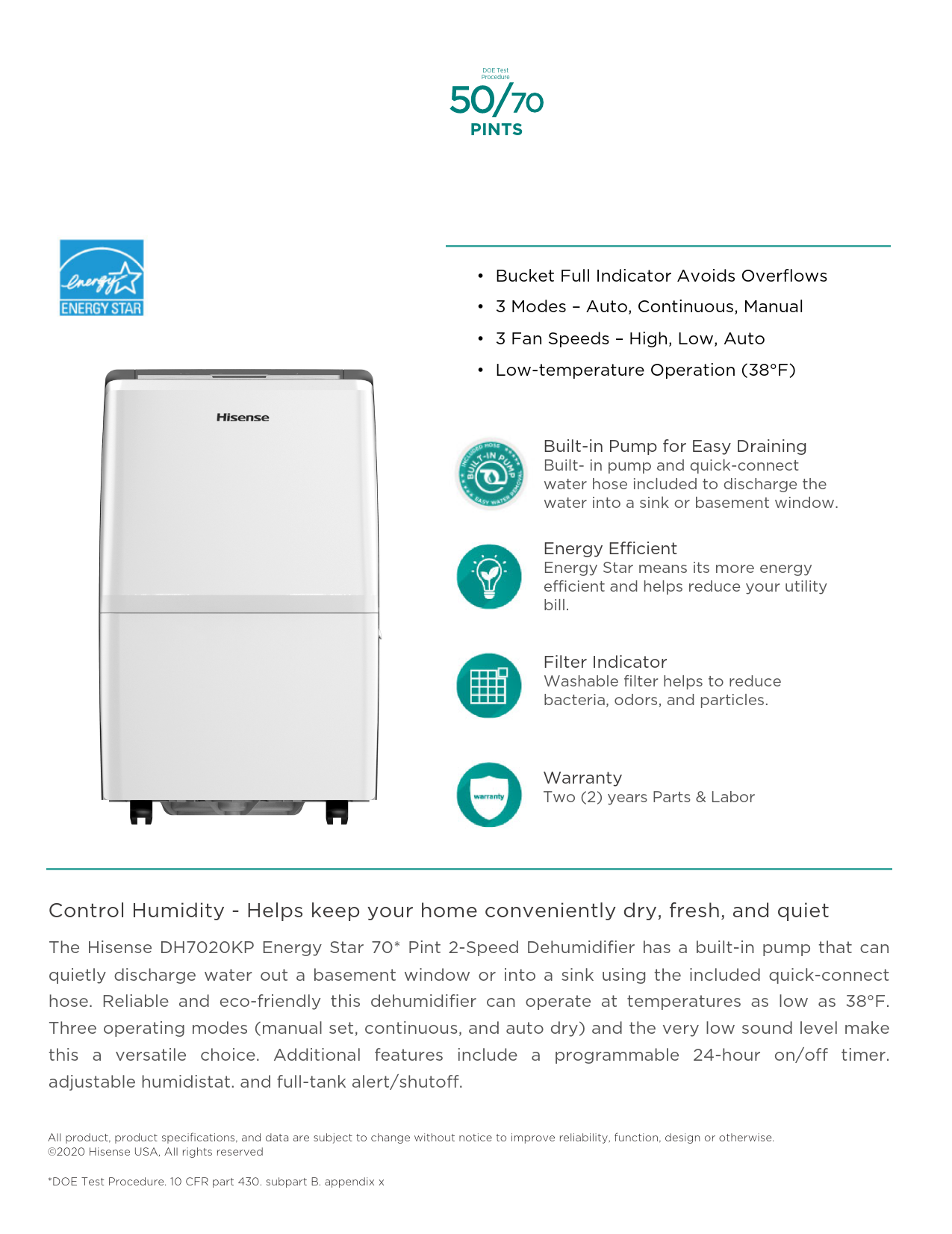 Control Humidity - Helps keep your home conveniently dry, fresh, and quiet. The Hisense DH7020KP Energy Star 70-Pint 2-Speed Dehumidifier features a built-in pump that can quietly discharge water out a basement window or into a sink using the included quick-connect hose. Reliable and eco-friendly, this dehumidifier can operate at temperatures as low as 38°F. Three operating modes (manual set, continuous, and auto dry) and a very low sound level make this a versatile choice. Additional features include a programmable 24-hour on/off timer, adjustable humidistat, and full-tank alert/shutoff.