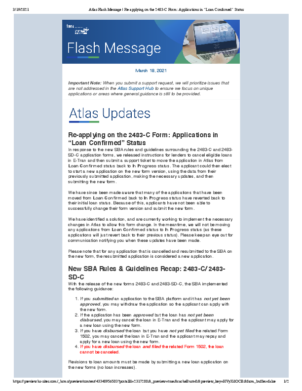 3/19/2021 Atlas Flash Message | Re-applying on the 2483-C Form: Applications in "Loan Confirmed" Status March 18, 2021 Important Note: When you submit a support request, we will prioritize issues that are not addressed in the Atlas Support Hub to ensure we focus on unique applications or areas where general guidance is still to be provided. Re-applying on the 2483-C Form: Applications in "Loan Confirmed" Status In response to the new SBA rules and guidelines surrounding the 2483-C and 2483SD-C application forms, we released instructions for lenders to cancel eligible loans in E-Tran and then submit a support ticket to move the application in Atlas from Loan Confirmed status back to In Progress status. The applicant could then elect to start a new application on the new form version, using the data from their previously submitted application, making the necessary updates, and then submitting the new form. We have since been made aware that many of the applications that have been moved from Loan Confirmed back to In Progress status have reverted back to their initial loan status. Because of this, applicants have not been able to successfully change their form version and submit the new form. We have identified a solution, and are currently working to implement the necessary changes in Atlas to allow this form change. In the meantime, we will not be moving any applications from Loan Confirmed status to In Progress status (as these applications will just revert back to their previous status). Please keep an eye out for communication notifying you when these updates have been made. Please note that for any application that is cancelled and resubmitted to the SBA on the new form, the resubmitted application is considered a new application. New SBA Rules & Guidelines Recap: 2483-C/ 2483SD-C With the release of the new forms 2483-C and 2483-SD-C, the SBA implemented the following guidance: 1. If you submitted an application to the SBA platform and it has not yet been approved, you may withdraw the application so the applicant can apply with the new form. 2. If the application has been approved but the loan has not yet been disbursed, you may cancel the loan in E-Tran and the applicant may apply for a new loan using the new form. 3. If you have disbursed the loan but you have not yet filed the related Form 1502, you may cancel the loan in E-Tran and the applicant may repay and apply for a new loan using the new form. 4. If you have disbursed the loan and filed the related Form 1502, the loan cannot be canceled. Revisions to loan amounts must be made by submitting a new loan application on the new forms (no loan increases). https://preview.hs-sites.com/_hcms/preview/content/43348956503?portalId=2317280&_preview=true&cacheBust=0&preview_key=HVyXdOCB&from_buffer=false 1/2 3/19/2021 Atlas Flash Message | Re-applying on the 2483-C Form: Applications in "Loan Confirmed" Status Atlas Support Hub SBA PPP lending guidance and forms (as of 3/8/21) SBA PPP forgiveness guidance and forms (as of 2/12/21) © 2021 StreetShares, Inc. StreetShares Inc., 1900 Campus Commons Drive, Suite 200, Reston, VA 20191 Unsubscribe Manage preferences https://preview.hs-sites.com/_hcms/preview/content/43348956503?portalId=2317280&_preview=true&cacheBust=0&preview_key=HVyXdOCB&from_buffer=false 2/2 3/19/2021 Atlas Flash Message | Second Draws & Loan Request Amount In Atlas March 17, 2021 Important Note: When you submit a support request, we will prioritize issues that are not addressed in the Atlas Support Hub to ensure we focus on unique applications or areas where general guidance is still to be provided. Second Draws for First Draw Loans Made in 2021 If you have an applicant who submitted their First Draw PPP loan application in calendar year 2021 and is now eligible for a Second Draw PPP loan, the SBA platform now accepts these applications. The applicant must create a NEW application for their Second Draw application by using a separate email address from their First Draw PPP loan application in 2021. The applicant can then follow the application process as normal. For those applicants that have Gmail, they can use this handy workaround to easily create an alias. New Location for Loan Request Amount In Atlas Due to the changes required with the new 2483-C form, the Loan Request Amount has been removed from the 'Loan Request' section in Atlas. The Loan Request Amount now only appears in the 'Application Review' tab (see image below). https://preview.hs-sites.com/_hcms/preview/content/43303342401?portalId=2317280&_preview=true&cacheBust=0&preview_key=ukXdXMAr&from_buffer=false 1/2 3/19/2021 Atlas Flash Message | Second Draws & Loan Request Amount In Atlas Atlas Support Hub SBA PPP lending guidance and forms (as of 3/8/21) SBA PPP forgiveness guidance and forms (as of 2/12/21) © 2021 StreetShares, Inc. StreetShares Inc., 1900 Campus Commons Drive, Suite 200, Reston, VA 20191 Unsubscribe Manage preferences https://preview.hs-sites.com/_hcms/preview/content/43303342401?portalId=2317280&_preview=true&cacheBust=0&preview_key=ukXdXMAr&from_buffer=false 2/2 3/19/2021 Atlas Flash Message | New Schedule C Forms Knowledge Base Article Released March 15, 2021 Important Note: When you submit a support request, we will prioritize issues that are not addressed in the Atlas Support Hub to ensure we focus on unique applications or areas where general guidance is still to be provided. New Schedule C Forms Knowledge Base Article Released A new Knowledge Base Article has arrived in the Atlas Support Hub regarding Atlas functionality accommodating the new SBA Application Forms (2483-C and 2483SD-C) that are now available for single-owner businesses that file taxes on IRS Form 1040 Schedule C. Please follow the link below to learn about this functionality: IFR Knowledge Base Article Atlas Support Hub SBA PPP lending guidance and forms (as of 3/8/21) SBA PPP forgiveness guidance and forms (as of 2/12/21) © 2021 StreetShares, Inc. StreetShares I