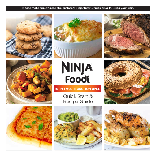 Please make sure to read the enclosed Ninja® Instructions prior to using your unit. 10-IN-1 MULTIFUNCTION OVEN Quick Start & Recipe Guide Your guide to cooking like a Foodi® Welcome to the Ninja® Foodi® 10-in-1 Multifunction Oven recipe book. From here, you're just a few pages away from recipes, tips and tricks and helpful hints that will give you the confidence to be creative in the kitchen without having to use numerous appliances. Contents Using the control panel 2 Cooking on different levels 3 Understanding each function 4 Using the racks 6 Tips & Tricks 8 Minimising smoke 9 Main Meals 10 Lemon-Herb Roast Chicken & Roasted Potatoes 10 Hunters Chicken & Herby Hasselback Potatoes 11 Mediterranean Chicken Skewers with Pitta and Tzatziki 12 Spanish Chicken Traybake with Potatoes 13 Tuscan Roast Pork (Porchetta) & Roast Vegetables 14 Greek-Style Leg of Lamb with Onions, Potatoes and Courgettes 15 Thai Salmon and Green Bean Curry with Jasmine Rice 16 Fish Pie 17 Fish and Chips 18 Ham and Pineapple Individual Pizzas 20 Goat's Cheese, Roasted Onion & Mushroom Pizza 21 Aubergine and Pesto Calzones with Roasted Tomato Sauce 22 Cheese and Spring Onion Quiche 23 Baked Gnocchi with Lemon, Sage & Parmesan 24 Spinach and Ricotta Cannelloni 25 Desserts 26 Honey and Almond Loaf Cake 26 Chocolate Chip Cookies 27 Cooking Chart 28 Complete Meals: Whole Roast 28 Complete Meals: Roast 30 Complete Meals: Air Fry 32 Air Fry Chart 34 Pizza Chart 38 Recipe Key We've tagged recipes with these icons to help find the right one for you. V Vegetarian Gluten-free K Keto Using the control panel See your Instruction Booklet for complete instructions WHOLE ROAST AB C DE 4 3 2 1 A PREHEAT will appear during 90-second preheat. B TIME and TEMP displays. C SLICES and SHADE will illuminate here when the Toast or Bagel function is selected. D 2 LEVEL will illuminate here when 2 LEVEL button is pressed. Use 2 LEVEL to enable RACK LEVEL for more even results when cooking on 2 rack positions. E RACK LEVEL recommended positions show where to place accessories for more even results. · To turn on the unit, press the (POWER) button. · Press the (LIGHT) button to turn the interior light on or off while cooking. · To select a cook function, press the FUNCTION +/- buttons. · Press the 2 LEVEL button to cook on 2 layers during convection functions. · To select a cook time, press the TIME/ SLICES +/- buttons. When using the Toast or Bagel function, these buttons will adjust the number of slices instead of the time. · To adjust temperature, press the TEMP/SHADE +/- buttons. When using the Toast or Bagel function, these buttons will adjust the shade instead of the temperature. · Press the (START/STOP) button to start or stop cooking. · Cook time will automatically start once preheat has completed. 2 Using the control panel Cooking on different levels Multiple rack positions give you the ability to cook family-sized meals on two levels. For guidance on where to place your food, refer to the digital display rack guide. Digital display rack guide Select a function and the display illuminates optimal rack position. When cooking on two levels, press the 2 LEVEL button for additional guidance. Rack levels correspond to the engraved numbers on the inside of the unit. Cook two 30cm frozen pizzas Select PIZZA function Press 2 LEVEL button Use Levels 1 and 3 Roast a whole chicken and vegetables Select WHOLE ROAST function Press 2 LEVEL button Use Levels 1 and 4 Air fry chicken goujons and French fries Select AIR FRY function Press 2 LEVEL button Use Levels 2 and 4 4 3 2 1 Questions? ninjakitchen.co.uk 3 Understanding each function Depending on which function you choose to make your next dish, the Ninja® Foodi® 10-in-1 Multifunction Oven will activate the appropriate number of heating elements and distribute the right of amount of airflow to deliver delicious, perfectly cooked results. WHOLE ROAST True Surround ConvectionTM ROAST AIR FRY PIZZA BAKE FUNCTION High fan speed Maximum fan speed Maximum fan speed Low fan speed Low fan speed BEST FOR Fast, crispy, even results in less time. Whole chicken Prime rib roast Pork fillet Crispy outside, juicy inside. Chicken thighs & vegetables Asparagus Fast, extra-crispy results with little to no oil. French fries (frozen or hand cut) Chicken wings or nuggets Breaded foods Cook frozen or fresh pizzas. Homemade pizza Frozen pizza Traditional baking with overall even cooking and light browning. Cakes Cookies See page 28 for detailed guidelines See page 30 for detailed guidelines See pages 34-37 for detailed guidelines 4 Understanding each function KEY Rear convection heat source Low fan speed Top-down heat Medium even heating High fan speed Medium and high heating Maximum fan speed High even heating NOTE: The power of higher fan speeds allows for faster cook times and crispier results. DEHYDRATE GRILL TOP & BOTTOM HEAT SOURCE TOAST BAGEL REHEAT Low fan speed Removes moisture to make jerky and dried fruit. Beef jerky Dried Fruit Top-down heat for a crispy finish. Kebabs Nachos Casseroles and gratins Quick and even browning on both sides. Bread Tea cakes, crumpets and muffins Frozen waffles Fast heating with a crunchy outside. Bagels Artisan breads Reheat meals. Leftovers Reduce below 80°C to use as a warmer until food is ready to serve. NOTE: Place bagel slices, cutside up, on the middle of the wire rack. 5 Using the Racks Use recommended accessories for each cook function and remove extras from the oven. We designed this oven to help you get meals on the table faster. FOR BEST RESULTS, KEEP AN EYE ON YOUR FOOD WHILE COOKING. 1 LEVEL COOKING DIGITAL RACK GUIDE | ACCESSORY PLACEMENT WHOLE ROAST 4 ROAST 4 3 3 2 2 1 1 4 4 3 3 2 2 1 1 AIR FRY 4 For veggies & starches * 3 OR For oiled veggies & 2 proteins PIZZA 4 3 * 2 1 1 4 4 3 3 2 2 1 1 BAKE 4 3 + Accessory 2 1 4 3 + Accessory 2 1 2 LEVEL COOKING 6 Using the racks Rack Levels KEY 4 Level in use 3 2 Levels not in use 1 Accessories Wire Rack Air Fry Ba