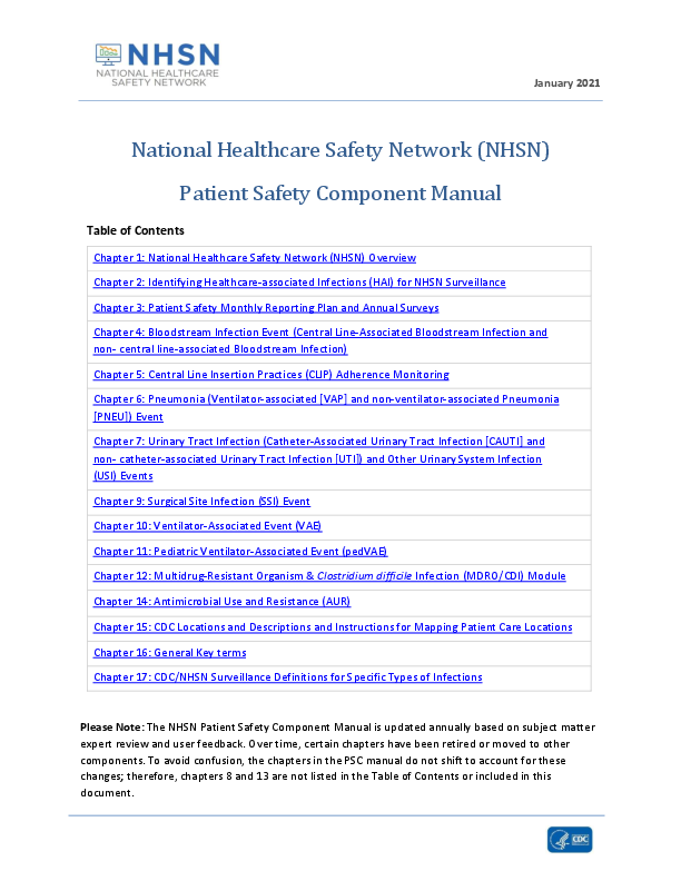 Please Note: The NHSN Patient Safety Component Manual is updated annually based on subject matter expert review and user feedback. Over time, certain chapters have been retired or moved to other components. To avoid confusion, the chapters in the PSC manual do not shift to account for...
