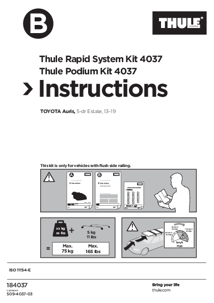 |  | Thule Rapid System Kit 4004 & Podium Kit 4004 Installation Instructions Step-by-step installation guide for Thule Rapid System Kit 4004 and Thule Podium Kit 4004 for KIA Carens (2007-2012) and KIA Rondo (2007-2012) with flush side railings. |