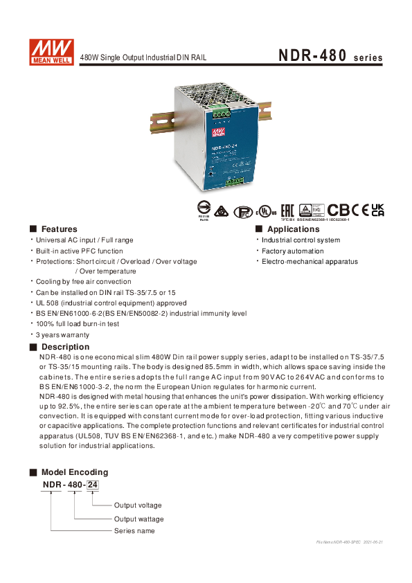 480W Single Output Industrial DIN RAIL NDR-480 series File Name:NDR-480-SPEC 2021-06-21 Bauar Sicherheit egelm a ge tgepruft od be www. ID2000000000 tuv.com wac g os