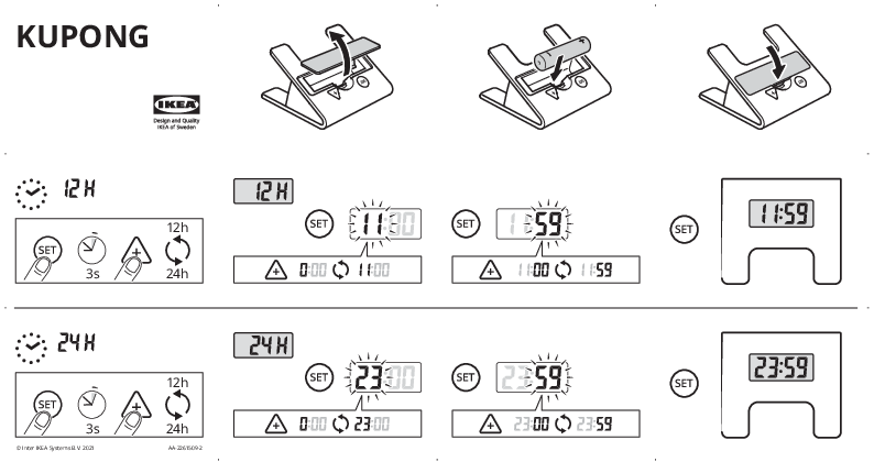 The KUPONG timer is designed for easy time management. This guide provides instructions on setting the time, switching between 12-hour and 24-hour formats, and configuring the alarm function.