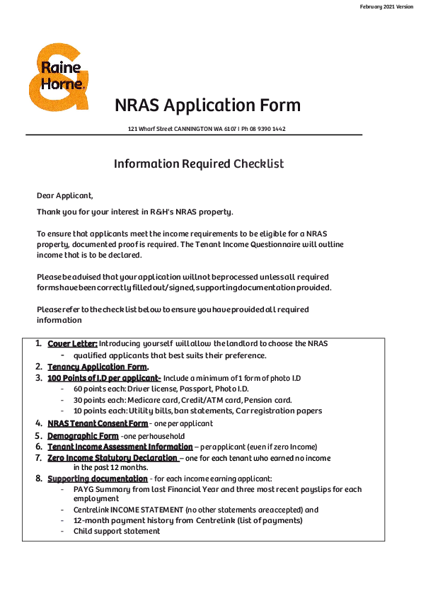 February 2021 Version NRAS Application Form 121 Wharf Street CANNINGTON WA 6107 I Ph 08 9390 1442 Information Required Checklist Dear Applicant, Thank you for your interest in R&H's NRAS property. To ensure that applicants meet the income requirements to be eligible for a NRAS property, documented proof is required. The Tenant Income Questionnaire will outline income that is to be declared. Pleasebeadvised that your application willnot beprocessed unless all required formshavebeencorrectly filledout/signed,supportingdocumentation provided. Pleaserefer tothecheck list below toensure youhaveprovidedall required information 1. Cover Letter: Introducing yourself willallow the landlord to choose the NRAS - qualified applicants that best suits their preference. 2. Tenancy Application Form. 3. 100 Points of I.D per applicant- Include a minimum of 1 form of photo I.D - 60 points each: Driver license, Passport, Photo I.D. - 30 points each: Medicare card, Credit/ATM card, Pension card. - 10 points each: Utility bills, ban statements, Car registration papers 4. NRAS Tenant Consent Form - oneper applicant 5. Demographic Form -one perhousehold 6. Tenant Income Assessment Information per applicant (even if zero Income) 7. Zero Income Statutory Declaration one for each tenant who earned no income in the past 12 months. 8. Supporting documentation - for each income earning applicant: - PAYG Summary from last Financial Year and three most recent payslips for each employment - Centrelink INCOME STATEMENT (no other statements areaccepted) and - 12-month payment history from Centrelink (list of payments) - Child support statement Raine & Horne NRAS 121 Wharf Street Cannington WA 6107 Ph: (08) 9390 1442 www.raineandhorne.com.au/nras APPLICATION TO LEASE RESIDENTIAL PROPERTY The owner of the premises is attempting to locate the most suitable tenant, a tenant who pays rent on time and takes care of the premises. To enable the owner of the premises to determine in their opinion, who is the most suitable applicant, the managing agent requires some background information regarding previous premises that you have leased, and information on how you will pay the rent. The following application and information is not the lease. Its purpose is to make you aware of conditions associated with making an application as well as special conditions that will be associated with the prospective lease. Application must be handed in to the office & completed FULLY prior to processing If your application is successful and you exercise your option to sign the lease, please note the following: When signing the lease we require all amounts payable to be paid in to our account by direct deposit. Cash rental payments are not accepted at this office. Your unique reference code will be issued once your application has been selected. These details will be matched to your account and must be used at all times. All tenants must sign the lease and pay the total ingoings before the keys are handed over. It is the TENANTS responsibility to ensure the electricity, gas and telephone are connected. It is the TENANTS responsibility to find out if there is an existing telephone connection to the property. You will be responsible for the telephone connection, and/or line connections if applicable as the outgoing tenant may or may not have had them disconnected. ALL APPLICATIONS RECEIVED ARE SUBJECT TO LANDLORD'S APPROVAL (The owner or agent is not obliged to explain in the event that your application is not accepted) Annexure A - SPECIAL CONDITIONS TO LEASE In addition to the standard conditions as set out in "The lease Agreement", all leases will be subject to the following "Special Conditions". 1. Any change to the occupancy of the property must be reported to the Property Manager. New occupants must go through the application and income reporting process before moving in. Approval may be subject to compliance requirements and landlord consent. Failure to follow this clause will result in termination of tenancy. 2. The tenant acknowledges and confirms they have viewed the said property, and accept it in its current condition. 3. Rent may be subject to review and increase every 6 months to reflect market value. 4. The Tenants shall not use the premises to cause or permit the premises to be used for any illegal purpose, or permit or cause a nuisance. The tenant shall use the premises safely for a dwelling and shall not cause or permit the premises to be used for any other purpose without the prior consent from the owner/agent. 5. The tenant agrees that they will notify Raine & Horne NRAS of any changes to their personal or work contact phone numbers and email addresses. 6. Tenant may not transfer their interest under this Tenancy Agreement, or sub-let the premises. 7. The applicants agree to pay rent one period in advance, except for the first two weeks rent. 8. Failure to pay your rent by the due date may result in termination of your lease agreement and your name being recorded on the National Tenancy Database. 9. Tenants are to use their specially assigned code when making payments. Failure to use your assigned banking code may incur a Breach Notice. 10. The tenant agrees that upon receipt of the Property Condition Report, they will thoroughly check and amend (if applicable) and return within 7 days. Failure to return the report within specified time will result in the final inspection being cross-referenced with the original Property Condition Report. 11. The tenant acknowledges and is aware that the agent, using the office key where applicable, will carry out regular inspections (in most cases, 3 monthly) on the property. First inspection will be conducted approximately 6 weeks from start of lease. The tenant further acknowledges that a reinspection fee of $50 may apply if the inspection cannot be performed for any reason attributable to the tenant, or if the inspection is found to be unacceptable and requires a follow up inspection. 12. The t