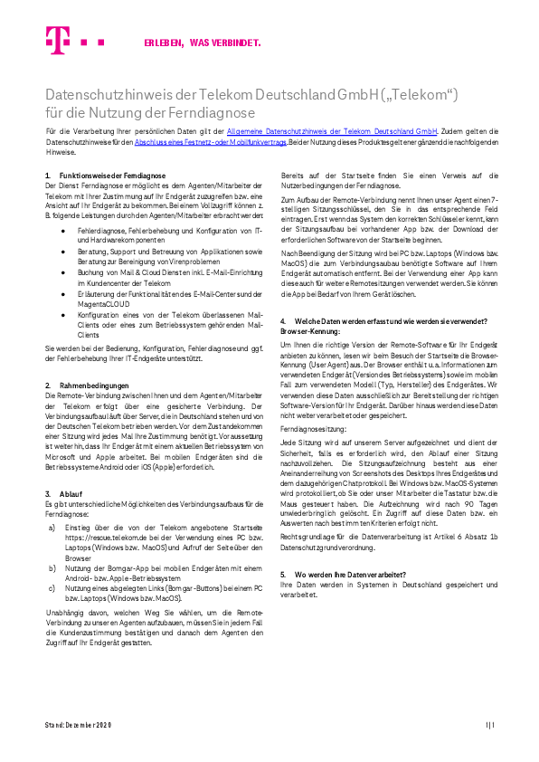 Datenschutzhinweis der Telekom Deutschland GmbH (,,Telekom") für die Nutzung der Ferndiagnose