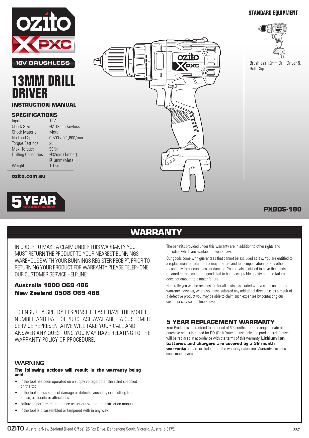 STANDARD EQUIPMENT 15 17 19 15 17 19 BRUSHLESS BRUSHLESS 13MM DRILL DRIVER INSTRUCTION MANUAL SPECIFICATIONS Input: 18V Chuck Size: Ø2-13mm Keyless Chuck Material: Metal No Load Speed: 0-500 / 0-1,800/min Torque Settings: 20 Max. Torque: 50Nm Drilling Capacities: Ø32mm (Timber) Ø13mm (Metal) Weight: 1.18kg ozito.com.au Brushless 13mm Drill Driver & Belt Clip PXBDS-180 WARRANTY IN ORDER TO MAKE A CLAIM UNDER THIS WARRANTY YOU MUST RETURN THE PRODUCT TO YOUR NEAREST BUNNINGS WAREHOUSE WITH YOUR BUNNINGS REGISTER RECEIPT. PRIOR TO RETURNING YOUR PRODUCT FOR WARRANTY PLEASE TELEPHONE OUR CUSTOMER SERVICE HELPLINE: Australia 1800 069 486 New Zealand 0508 069 486 TO ENSURE A SPEEDY RESPONSE PLEASE HAVE THE MODEL NUMBER AND DATE OF PURCHASE AVAILABLE. A CUSTOMER SERVICE REPRESENTATIVE WILL TAKE YOUR CALL AND ANSWER ANY QUESTIONS YOU MAY HAVE RELATING TO THE WARRANTY POLICY OR PROCEDURE. WARNING The following actions will result in the warranty being void. · If the tool has been operated on a supply voltage other than that specified on the tool. · If the tool shows signs of damage or defects caused by or resulting from abuse, accidents or alterations. · Failure to perform maintenance as set out within the instruction manual. · If the tool is disassembled or tampered with in any way. The benefits provided under this warranty are in addition to other rights and remedies which are available to you at law. Our goods come with guarantees that cannot be excluded at law. You are entitled to a replacement or refund for a major failure and for compensation for any other reasonably foreseeable loss or damage. You are also entitled to have the goods repaired or replaced if the goods fail to be of acceptable quality and the failure does not amount to a major failure. Generally you will be responsible for all costs associated with a claim under this warranty, however, where you have suffered any additional direct loss as a result of a defective product you may be able to claim such expenses by contacting our customer service helpline above. 5 YEAR REPLACEMENT WARRANTY Your Product is guaranteed for a period of 60 months from the original date of purchase and is intended for DIY (Do It Yourself) use only. If a product is defective it will be replaced in accordance with the terms of this warranty. Lithium Ion batteries and chargers are covered by a 36 month warranty and are excluded from the warranty extension. Warranty excludes consumable parts. OZITO Australia/New Zealand (Head Office) 25 Fox Drive, Dandenong South, Victoria, Australia 3175. 0321 BRUSHLESS BRUSHLESS KNOW YOUR PRODUCT BRUSHLESS 13MM DRILL DRIVER 1. Keyless Chuck 2. Torque Adjustment Collar 3. Gear Selector 4. Forward/Reverse Button 5. Variable Speed Trigger 6. LED Light 7. Battery Seating 8. Belt Clip 1 2 3 SETUP & PREPARATION 1. FITTING THE BATTERY Installing The Battery Pack 1. Slide the battery into the tool base until it clicks into place. 15 17 19 Removing The Battery Pack 1. Hold down the battery release button. 4 5 2. Slide the battery out. 6 7 8 BATTERY & CHARGER This tool is compatible with all batteries & chargers from the Ozito Power X Change range. ONLINE MANUAL Scan this QR Code with your mobile device to take you to the online manual. 15 17 15 BRUSHLESS 2. FITTING ACCESSORIES WARNING! ENSURE THE TOOL IS SWITCHED OFF AND THE BATTERY IS REMOVED BEFORE PERFORMING ANY OF THE FOLLOWING TASKS. Installing A Drill Bit 1. Rotate the chuck collar anti-clockwise to open the chuck. 2. Insert the drill bit, making sure it is centred in the chuck. 3. Tighten the chuck by turning the chuck collar clockwise. 4. Pull on the bit to ensure it is firmly secured. 15 17 19 15 17 19 OPERATION 3. CONTROLS Forward/Reverse Lever 1. To drill or drive screws, push the forward/reverse button towards the left of the drill. REV 2. Push the button towards the right of the tool to reverse the rotation. FWD Variable Speed Trigger 1. Squeeze the variable speed trigger to start the tool. Note: The more the variable speed trigger is depressed, the faster the drill bit will rotate. 2. Release the trigger to stop drilling. Adjusting Torque 1. Rotate the torque collar to the desired setting. BRUSHLESS 15 17 19 Removing A Drill Bit 1. Open the chuck by rotating the chuck collar and remove the drill bit. b. a. WARNING! DO NOT HANDLE ACCESSORIES WITHOUT GLOVES AS THEY ARE SHARP & CAN BECOME HOT AFTER USE, POTENTIALLY CAUSING INJURY. Note: Selecting a higher torque setting will allow the drill to use more torque to drive the screw in or out. To prevent damaging the screw head, it is recommended to start at a low torque setting and increase when necessary. Speed Control The gear selector controls the speed of the drill. First gear allows slower drilling with more torque, while second gear is suitable when less torque but higher speed is required. 1. Slide the switch forward to select first gear. 1st Gear 2nd Gear 2. Slide the switch backward to select second gear. 15 17 19 15 15 15 15 17 19 4. USAGE Drilling Before starting to drill, perform a few simple checks. 1. Depress and release the variable speed trigger to ensure it is not locked on. 2. Check the forward/reverse lever is on the desired setting. REV FWD 3. Secure the material to be drilled in a vice or clamp to stop it turning whilst drilling. 4. Hold the drill firmly and place the bit at the point to be drilled. BRUSHLESS BRUSHLESS Drilling To A Preset Depth A simple way of achieving a hole at a desired depth is to use masking tape. 1. Measure along the drill bit to the desired depth. 2. Wrap a small piece of masking tape tightly around the drill bit. 3. Drill into the material until the surface reaches the start of the tape. Torque Settings Torque settings can alter the depth to which you can drill or drive into a surface. To determine the torque setting required to drive a screw perfectly flush to the work surface, follow the below steps. 1. Set the torque collar to the lowest setting and tighten the first