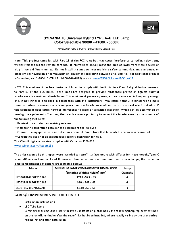 SYLVANIA T8 Universal Hybrid TYPE A+B LED Lamp Color Selectable 3000K - 4100K - 5000K "Type A+B" PLUG & PLAY or DIRECT WIRE Ballast-Free. EN Note: This product complies with Part 18 of the FCC rules but may cause interference to radios, televisions, wireless telephones and remote controls. If interference occurs, move the product away from these devices or plug it into a different outlet. Do not install this product near maritime safety communications equipment or other critical navigation or communication equipment operating between 0.45-30MHz. For additional product information, call 1-800-LIGHTBULB (1-800-544-4828) or visit: www.SYLVANIA.com/FCCpart18. NOTE: This equipment has been tested and found to comply with the limits for a Class B digital device, pursuant to Part 15 of the FCC Rules. These limits are designed to provide reasonable protection against harmful interference in a residential installation. This equipment generates, uses, and can radiate radio frequency energy and, if not installed and used in accordance with the instructions, may cause harmful interference to radio communications. However, there is no guarantee that interference will not occur in a particular installation. If this equipment does cause harmful interference to radio or television reception, which can be determined by turning the equipment off and on, the user is encouraged to try to correct the interference by one or more of the following measures: --Reorient or relocate the receiving antenna. --Increase the separation between the equipment and receiver. --Connect the equipment into an outlet on a circuit different from that to which the receiver is connected. --Consult the dealer or an experienced radio/TV technician for help. This Class B digital apparatus complies with Canadian ICES-005. www.sylvania.com/fccpart15b The units covered by this report were intended to retrofit surface mount with diffuser for these models, Type IC or non-IC recessed mount listed fluorescent luminaires that use maximum two tubular lamps, the minimum lamp compartment dimensions are tabulated below: Model LED16T8L48FGP8SC2AB MINIMUM LAMP COMPARTMENT DIMENSIONS [Length x Width x Height][mm] 1218 x573 x 65 Lamp Quantity 4 LED12T8L36FGP8SC2AB 920 x 568 x 65 4 LED8T8L24FGP8SC2AB 623 x 563 x 67 4 PARTS/COMPONENTS INCLUDED IN KIT - Installation Instructions - LED Tube Lamp - Luminaire Marking Labels. Only for Type B installation please apply the following lamp replacement label on the retrofit luminaire after the retrofit kit has been installed, where readily visible by the user during relamping, and after installation. 1 / 13 WARNINGS TYPE A Application (PLUG & PLAY, Ballast compatible) To avoid personal injury and/or possible product damage, the following cautions must be followed: · Read all safety information and instructions before installation. · RISK OF ELECTRIC SHOCK. Disconnect power at fuse or circuit breaker before installing or servicing. · Suitable for damp locations - Not for use where directly exposed to water. · Caution: Do not use with dimmers. · This device is not intended for use with emergency exits. · CAUTION - RISK OF FIRE. USE ONLY IN PLACE OF FLUORESCENT LAMPS SPECIFIED ON PRODUCT LABEL. · CAUTION RISK OF FIRE IF THE LAMP OR LUMINAIRE EXHIBITS UNDESIRABLE OPERATION (BUZZING, FLICKERING, ETC), IMMEDIATELY TURN OFF POWER, REMOVE LAMP FROM LUMINAIRE AND CONTACT MANUFACTURER. · CAUTION - RISK OF FIRE. IF LAMP DOES NOT LIGHT WHEN THE LUMINIARE IS ENERGIZED, REMOVE LAMP FROM LUMINAIRE AND CONTACT LAMP MANUFACTURER OR QUALIFIED ELECTRICIAN. · CAUTION - RISK OF FIRE OR ELECTRIC SHOCK. When working with electronics ballast, please check the compatible list first. If you do not find your ballast on the list, then please bypass the fixture as a Type B installation or contact us for support. Do not install the LED tube with the ballast which not on the ballast compatible list. · To prevent damage to lamp, lamp must not be energized when color (CCT) selector switch is changed. WARNINGS TYPE B Application (DIRECT WIRE, Ballast-Free) To avoid personal injury and/or possible product damage, the following cautions must be followed: · Read all safety information and instructions before installation. · RISK OF ELECTRIC SHOCK. Disconnect power at fuse or circuit breaker before installing or servicing. · To prevent damage to lamp, lamp must not be energized when color (CCT) selector switch is changed. · Suitable for damp locations - Not for use where directly exposed to water. · Caution: Do not use with dimmers. · This device is not intended for use with emergency exits. · To prevent early lamp failure, lamp should only be installed in operating environments ranging between: -20°C and +45°C (-4°F and +113°F). · WARNING RISK OF FIRE OR ELECTRIC SHOCK. LED Retrofit Kit installation requires knowledge of luminaires electrical systems. If not qualified, do not attempt installation. Contact a qualified electrician. · WARNING RISK OF FIRE OR ELECTRIC SHOCK. Install this kit only in the luminaires that have the construction features and dimensions shown in the photographs and/or drawings and where the input rating of the retrofit kit does not exceed the input rating of the luminaire. · Do not make or alter any open holes in an enclosure of wiring or electrical components during kit installation. · WARNING - To prevent wiring damage or abrasion, do not expose wiring to edges of sheet metal or 2 / 13 other sharp objects. · Installers should not disconnect existing wires from lamp socket terminals to make new connections at lamp socket terminals. Instead, installer should cut existing lamp socket leads away from the lamp socket and make new electrical connections to lamp socket lead wires by employing connectors suitable for the application. · THIS RETROFIT KIT IS ACCEPTED AS A COMPONENT OF A LUMINAIRE WHERE THE SUITABILITY OF THE COMBINATION SHALL BE DETERMINED BY AUTHORITIES HAVING JURISDICTION. PRODUCT MUST