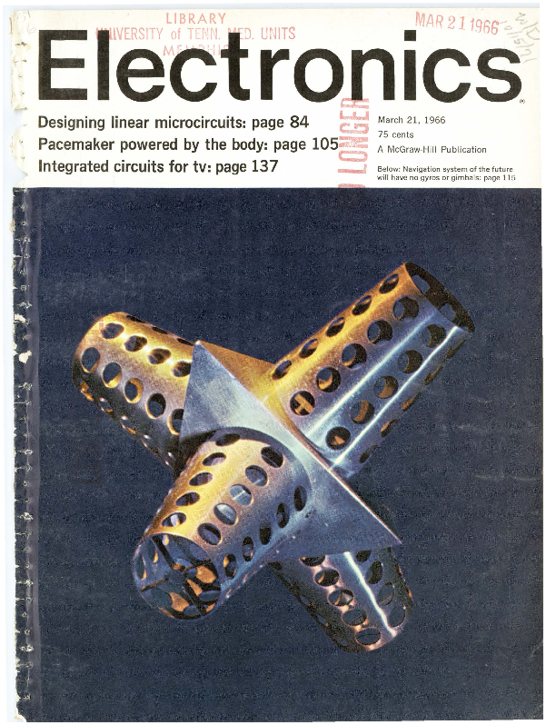 This issue of Electronics Magazine, dated March 21, 1966, delves into cutting-edge advancements in electronics. Discover articles on designing linear microcircuits, the innovative body-powered pacemaker, and the integration of circuits for television technology. Additionally, explore the future of navigation systems that aim to eliminate gyros and gimbals.