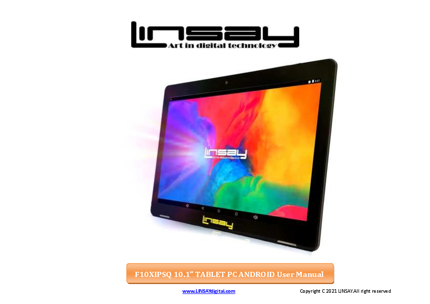 F10XIPSQ 10.1" TABLET PC ANDROID User Manual www.LINSAYdigital.com Copyright C 2021 LINSAY.All right reserved FCC Class B: Note: This equipment has been tested and found to comply with the limits for a Class B digital device, pursuant to part 15 of the FCC Rules. These limits are designed to provide reasonable protection against harmful interference in a residential installation. This equipment generates uses and can radiate radio frequency energy and, if not installed and used in accordance with the instructions, may cause harmful interference to radio communications. However, there is no guarantee that interference will not occur in a particular installation. If this equipment does cause harmful interference to radio or television reception, which can be determined by turning the equipment off and on, the user is encouraged to try to correct the interference by one or more of the following measures: - Reorient or relocate the receiving antenna. - Increase the separation between the equipment and receiver. - Connect the equipment into an outlet on a circuit different from that to which the receiver is connected. - Consult the dealer or an experienced radio/TV technician for help. NOTICE: 1. The changes or modifications not expressly approved by the party responsible for compliance could void the user's authority to operate the equipment. 2. Shielded interface cables and AC power cord, if any, must be used in order to comply with the Emission limits. 3. The manufacture is not responsible for any radio or TV interference caused by unauthorized modification to the equipment. It is the responsibilities of the user to correct such interference. This device complies with Part 15 of the FCC Rules. Operation is subject to the following two conditions: (1) this device may not cause harmful interference, and (2) this device must accept any interference received, including interference that may cause undesired operation. SAFETY PRECAUTIONS · Do not subject the device to severe impact or drop it from heights. · Do not use the device in extreme hot or cold, dusty or damp conditions. Do not expose it to direct sunlight. · Avoid using the device near strong magnetic fields. www.LINSAYdigital.com 2|Page · Normal functioning of the product may be disturbed by ESD. If so, simply reset and restart the device following the instruction manual. During file transmission, please handle with care and operate in a static-free environment. · Keep the device away from water and other liquids. In the event that water or other liquids enter the device, power off the product immediately and clean the device. · Do not use chemicals to clean the device in order to avoid corrosion. Clean it with a dry cloth. · Do not install this equipment in a confined space such as a book case or similar unit. The ventilation should not be impeded by covering the ventilation openings with items such as newspaper, table-cloths, curtains etc. · No naked flame sources, such as lighted candles, should be placed on the apparatus. · Attention should be drawn to environmental aspects of battery disposal. · Use the apparatus in moderate climates. · We are not responsible for damage or lost data caused by malfunction, misuse, modification of the device or battery replacement. · Do not attempt to disassemble, repair or modify the product. This will invalidate the warranty. · If the device will not be used for an extended period of time, please charge the battery at least once per month to maintain battery life. · Charge the battery if: a) The battery level icon displays · (An empty battery) b) The device powers off automatically when restarted. c) There is no response when pressing keys with keys unlocked and battery full. · Do not interrupt the connection when the device is being formatted or transferring files. Otherwise, data may be corrupted or lost. · When the device is used as a portable HD, please use only per the instructions. Otherwise, permanent data loss could occur. · Please use and install data using the attachments/accessories provided and only according to the manufacturer's instruction. · Please refer to the information on the bottom of the device for electrical and safety information before installing data or operating the device. · To reduce the risk of fire or electric shock, do not expose this device to rain or moisture. The device should not be exposed to dripping or splashing. Never place objects filled with liquids, such as vases, on the device. · There is danger of explosion if the battery is replaced incorrectly. Replace only with the same or equivalent type. · The battery (battery or batteries or battery pack) should not be exposed to excessive heat such as sunlight, fire or the like. · Please follow responsible procedures for battery disposal. · If the power adaptor disconnected from the device, the device will remain operable as long as the battery has sufficient charge. · The power adaptor is a CLASS II apparatus with double insulation, and no external ground is provided. · Safety Symbol Explanation: www.LINSAYdigital.com 3|Page ·-The lightning flash with arrowhead symbol within an equilateral triangle is intended to alert the user to the presence of non-insulated "dangerous voltage" within the product's enclosure that may be of sufficient magnitude to constitute a risk of electric shock. ·-To reduce the risk of electric shock, do not remove the cover (or back) as there are no user-serviceable parts inside. Refer servicing to qualified personnel. ·-The exclamation point within an equilateral triangle is intended to alert the user to the presence of important operating and maintenance instructions in the literature accompanying the device. ·-Correct Disposal of this product. This marking indicates that this product should not be disposed of with other household waste in the EU. To prevent possible harm to the environment or human health from uncontrolled waste disposal, recycle it respon