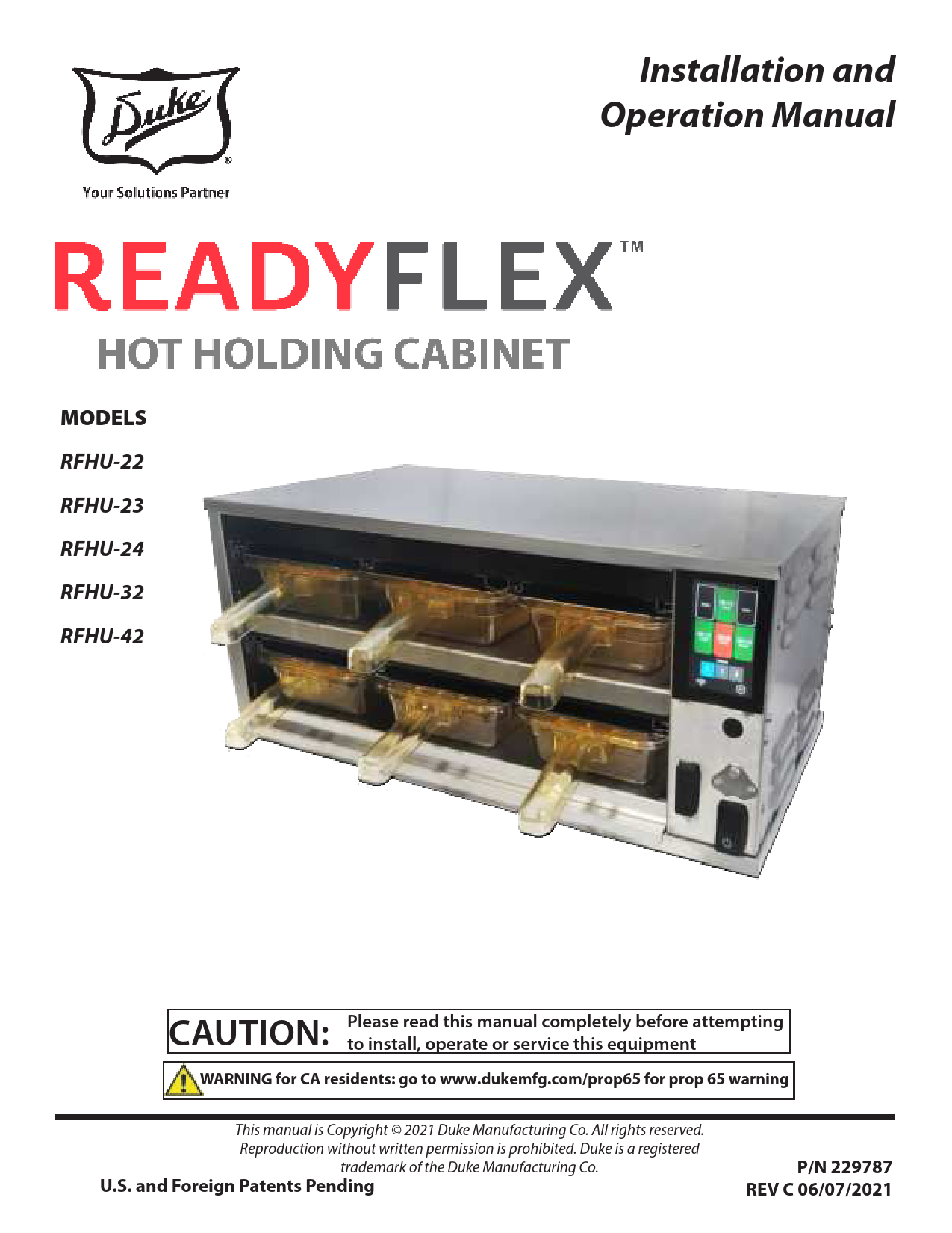 User Manual for Duke models including: RFHU-22, RFHU-23, RFHU-24, RFHU-32, RFHU-42, ReadyFlex Hot Holding Cabinet