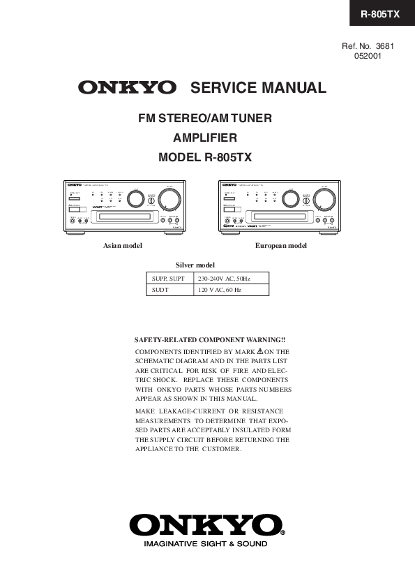 R-805TX Ref. No. 3681 052001 SERVICE MANUAL FM STEREO/AM TUNER AMPLIFIER MODEL R-805TX FM STEREO / AM TUNER AMPLIFIER ENERGY SAVE STANDBY / ON CD MD CDR/PC LINE/DVD FM AM TAPE WIDE RANGE AMPLIFIER TECHNOLOGY PHONES MEMORY FM MODE CLEAR INPUT ACOUSTIC PRESENCE OFF / 1 / 2 / 3 VOLUME DISPLAY PRESET TUNING R-805TX Asian model FM STEREO / AM TUNER AMPLIFIER ENERGY SAVE STANDBY / ON CD MD CDR LINE/DVD FM AM TAPE PHONES MEMORY FM MODE CLEAR ACCUCLOCK WIDE RANGE AMPLIFIER TECHNOLOGY INPUT ACOUSTIC PRESENCE OFF / 1 / 2 / 3 VOLUME DISPLAY PRESET TUNING R-805TX European model Silver model SUPP, SUPT SUDT 230-240V AC, 50Hz 120 V AC, 60 Hz SAFETY-RELATED COMPONENT WARNING!! COMPONENTS IDENTIFIED BY MARK ON THE SCHEMATIC DIAGRAM AND IN THE PARTS LIST ARE CRITICAL FOR RISK OF FIRE AND ELECTRIC SHOCK. REPLACE THESE COMPONENTS WITH ONKYO PARTS WHOSE PARTS NUMBERS APPEAR AS SHOWN IN THIS MANUAL. MAKE LEAKAGE-CURRENT OR RESISTANCE MEASUREMENTS TO DETERMINE THAT EXPOSED PARTS ARE ACCEPTABLY INSULATED FORM THE SUPPLY CIRCUIT BEFORE RETURNING THE APPLIANCE TO THE CUSTOMER. SPECIFICATIONS Amplier Section Power output 20 watts per channel, min RMS, at 4 ohms, both channels driven 1 kHz, with no mor e than 0.6% THD 15 watt per channel, min RMS, at 8 ohms, both channels driven 1 kHz, with no mor e than 0.6% THD 2 X 20 watts at 4 ohms, 1 kHz, DIN 2 X 17 watts at 6 ohms, 1 kHz, DIN 2 X 15 watts at 8 ohms, 1 kHz, DIN 2 X 29 watts at 4 ohms, 1 kHz, EIAJ Dynamic power output 2 X 24 watts at 4 ohms 2 X 17 watts at 8 ohms otal harmonic distortion 0.6% at rated power IM distortion 0.6% at rated power Damping factor 30 at 8 ohms Input Sensitivity and Impedance TAPE/MD PLAY: 150 mV, 50 kohms LINE IN: 150 mV, 50 kohms Frequency and r esponse 10 to 50,000 Hz +0 / 3 dB Tone contr ol ACOUSTIC PRESENCE 1 +4 dB at 82 Hz ACOUSTIC PRESENCE 2 +3 dB at 20.5 Hz, + 3 dB at 82 Hz ACOUSTIC PRESENCE 3 +3 dB at 20.5 Hz, + 6 dB at 82 Hz BASS ±8 dB at 100 Hz TREBLE ±8 dB at 10 kHz Signal to noise ratio TAPE: 100 dB (IHF-A) Muting dB Tuner Section Tuning range FM: 87.9 to 107.9 MHz (200 kHz steps) (U.S. & Canadian models) 87.5 to 108.00 MHz (50 kHz steps) (Other area models) AM: 530 to 1710 kHz (10 kHz steps) (U.S. & Canadian models) 522 to 1611 kHz (9 kHz steps) (Other area models) Usable sensitivity FM: Mono 11.2 dBf, 1.0 µV (75 ohms IHF) 0.9 µV (75 ohms DIN) Stereo 17.2 dBf, 2.0 µV (75 ohms IHF) 23.0 µV (75 ohms DIN) AM: 30 µV R-805TX 50 dB Quieting sensitivity FM: Mono 17.2 dBf, 2.0 µV (75 ohms) Stereo 37.2 dBf, 20.0 µV (75 ohms) Captur e ratio FM: 2.0 dB Image r ejection ratio FM: 40 dB (U.S. & Canadian models) 85 dB (Other area models) AM: 40 dB IF rejection ratio FM: 90 dB AM: 40 dB Signal to noise ratio FM: Mono 73 dB, IHF Stereo 67 dB, IHF AM: 40 dB Selectivity FM: 50 dB DIN (±300 kHz at 40 kHz Devi.) AM Suppr ession Ratio 50 dB Harmonic distortion FM: Mono 0.2% Stereo 0.3% AM: 0.7 % Frequency r esponse FM: 30 to 15,000 Hz (±1.5 dB) Stereo separation FM: 45 dB at 1,000 Hz 30 dB at 100 to 10,000 Hz Stereo thr eshold FM: 17.2 dBf, 2.0 µV (75 ohms) General Clock precision monthly error: +/-30 seconds (at 25 degrees Celsius) Power supply AC 120 V, 60 Hz AC 230 V, 50 Hz Power consumption 61 W (120 V, 50 Hz) 54 W (230 V, 60 Hz) Dimensions (W X H X D) 205 X 91 X 302 mm 8-1/16" X 3-9/16" X 11-7/8" Weight 3.4 kg, 7.5 lbs Specications and external appearance are subject to change without notice as a result of product improvement. R-805TX SERVICE PROCEDURES 1. Replacing the fuses This symbol located near the fuses indicates that the fuse used is fast operating type. For continued protection against fire hazard, replace with same type fuse. For fuse rating refer to the marking adjacent to the symbol. Ce symbole indique que le fusible utlise est a rapide. Pour une protection permanente, n'untiliser que fusibles de meme type. Ce darnier est la qu le present symbol est appse. CIRCUIT NO. F901 F902 PART NO. DESCRIPTION 252158 1.6A-UL/T237, Primary <D> 252083 0.4A-SE-EAWK, Primary <P/T> 252069 0.8A-SE-EAK,AC outlet <P/T> Note: <D>: 120V model only <P/T>: 230V model only 5. Changing the AM band step The tuning step selector switch is not provided in this model. When you change the band step, change the parts as shown below. R715 R716 To 10kHz 3.3k 5.6k To 9kHz 10k Open 6. Adjustment of clock frequency 1. Connect the frequency counter to the terminal TP701. 2. Press and hold down the MEMORY button, then press the DISPLAY button.(All segments on FL tube light on) 3. Adjust the trimmer capacitor C707 so that the reading of frequency counter becomes 524.288 kHz+/-1Hz. 2. To initialize the unit This device employs a microprocessor to perform various functions and operations. If interference generated by an external power supply, radio wave, or other electrical source results in accident which causes the specified operations and functions to operate abnormally. To perform a result, please follow the procedure below. 1. Press and hold down the MEMORY button, then press the DISPLAY button. 2. Press the STANDBY/ON button. After "clear" is displayed, the preset memory and each mode stored in the memory, such as surround, are initialized and will return to the factory setting. 3. Safety-check out (120V model only) After correcting the original service problem, perform the following safety check before releasing the set to the customer. Connect the insulating-resistance tester between the plug of power supply cord and screw on the back panel. Specifications: 3.3Mohm+/-10% at 500V. 4. Memory Preservation This unit does not require memory preservation batteries. A built-in memory power back-up system preserves the contents of the memory during po wer f ailures and even when the unit is unplugged.The unit must be plugged in order to char ge the back-up system. The memory preservation period after the unit has been unplugged varies depending on climate and placement of the unit. On the a v erage, memory contents are protected over a period of a few week