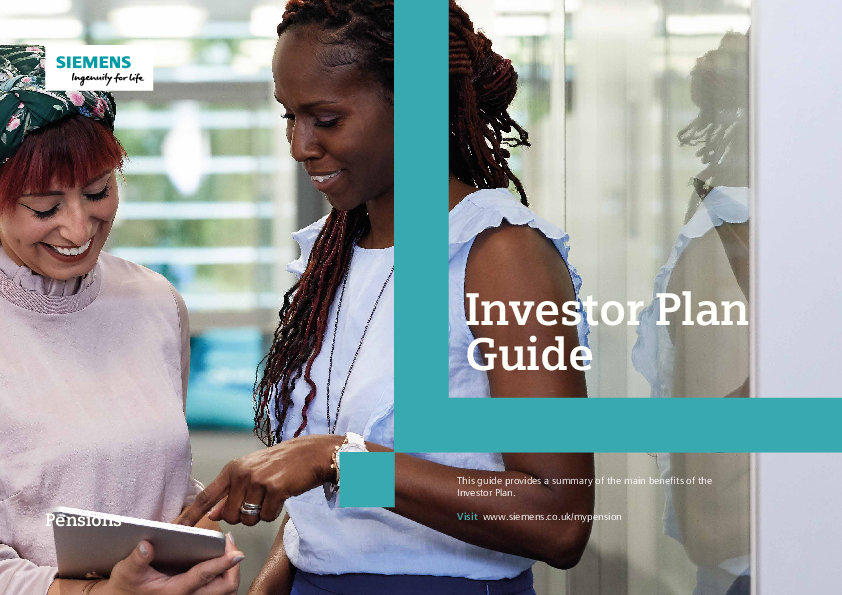 Pensions Investor Plan Guide This guide provides a summary of the main benefits of the Investor Plan. Visit www.siemens.co.uk/mypension #2 Investor Plan Guide What is the Investor Plan Guide? This guide provides a summary of the main benefits of the Investor Plan, however it does not cover every aspect. Full details are contained in the Trust Deed and Rules, which is the legal document governing the Siemens Benefits Scheme, and would override this guide if there are any inconsistencies. This guide is based on the Trustees' understanding of the current tax rules for pension schemes these rules have been subject to much change recently and may change again in the future. Please also note that neither the Trustees, nor Siemens, are able to provide you with financial advice and this guide should not be treated as such. Please see the last page for details of how to get additional help and financial advice. Some of the terms used in this guide are explained in further detail on page 22. Contents 03 Introducing the Investor Plan 04 Key Features 05 Contributions 08 Investments 14 Retirement options 17 Death benefits 19 Change in circumstances 20 Frequently Asked Questions 22 Where to get help #3 Investor Plan Guide Introducing the Investor Plan People are now living longer, healthier lives than ever before, meaning they have the opportunity in retirement to do the things they've always wanted to do. This also means, of course, that they need a comfortable income to be able to afford to live the life they want. As a member of the Investor Plan (the Plan) you can build up retirement savings while you're working at Siemens, to help you live the life you want in retirement. Membership also gives you, and your dependants, financial protection while you're still working. Here's a summary of how the Plan works Joining Most employees automatically join when joining Siemens. Contributing You pay in contributions. Siemens also pays in to your account. Accessing You can currently access your savings from age 55. The normal retirement age is 65. Here's how to activate your account online When joining the Plan, you will receive a letter containing a validation code to activate your account. If you have not received this letter or you joined the Plan some time ago contact Trafalgar House, who will be able to provide you with your activation details. Once you have completed the online activation, as an active member you have the option to access your account using your PKI. Alternatively, if you would like to access your account outside of the Siemens network or you no longer work for Siemens you can access your account using a username and password. For any issues with logging on to your account or for password resets please contact Trafalgar House at www.myworkpension.co.uk/ContactUs. #4 Investor Plan Guide Key Features Contributions · The minimum contribution is 4% from each of the member which is matched by Siemens. · Your contributions are normally deducted before tax and National Insurance. The maximum contribution from Siemens is 10% of your pensionable salary. · You can pay more than 10% of your pensionable salary if you choose (although this won't be matched by Siemens). > More information on page 5 Investments · Your contributions are automatically invested in the default option (Flexi Access Lifestyle) chosen by the Trustees. · The Trustees have designed three Lifestyle approaches to cater for different retirement options. · If you want to choose your own funds, there are 12 Freestyle funds you can invest in. > More information on page 8 Retirement Options · You don't have to stop work to access your pension savings. · You can currently draw money from your fund from age 55. · You can normally take a quarter of your fund as a tax free lump sum. · Pension Freedoms give you far more retirement options than ever before: Flexible Access, Traditional Annuity, Cash Out or a combination. · If you die before accessing your fund, your family and dependants can receive a lump sum (normally paid free of tax) and/or income. > More information on page 14 #5 Investor Plan Guide Key Features Siemens Contributions The minimum Siemens contribution is 4%. However, if you are able to pay more Siemens will pay more, as detailed in the table. Siemens contributes up to 10% of your pensionable salary. From time to time Siemens may agree to pay enhanced contributions to certain members to compensate for changes to their benefits from previous pension arrangements. If this applies to you, contact the Member Services Team for more information. Your Contribution (%) 4 5 6 7 8 9 *10+ (AVCs & EDCs) The Company Contributions (%) 4 7.5 9 10 10 10 10 Total Amount Credited to your Account 8 12.5 15 17 18 19 20 *More information on page 6 Contribution Modeller The My Pension online contribution modeller helps you understand the breakdown of your contributions, how much it costs you and how much your employer will add to your savings. > Open Contribution Modeller Things to consider · How much you should put in depends on what you would like to take out at retirement. When setting a target make sure you factor in pensions from previous jobs. · You can set a target by going to the Investor Plan page, logging in and selecting the `Change Investments' section. · You can also factor in the State Pension, which currently starts between 65 and 68 depending on your age. · Once you have a target, you need to make sure that your chosen contribution is affordable. #6 Investor Plan Guide Contribution considerations How much will I need in retirement? If you are already a member of the Investor Plan, use the Pension Planner tool and the Contribution Modeller to see how your chosen contributions affect your net pay and may impact on your benefits at retirement by visiting the Investor Plan page of the My Pension website then logging in. Then you can factor in your pensions benefits from outside the Siemens Benefit Scheme: Get a Sta