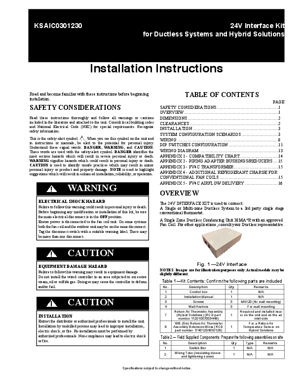 KSAIC0301230 24V Interface Kit for Ductless Systems and Hybrid Solutions Installation Instructions Read and become familiar with these instructions before beginning installation. SAFETY CONSIDERATIONS Read these instructions thoroughly and follow all warnings or cautions included in the literature and attached to the unit. Consult local building codes and National Electrical Code (NEC) for special requirements. Recognize safety information. This is the safety-alert symbol . When you see this symbol on the unit and in instructions or manuals, be alert to the potential for personal injury. Understand these signal words: DANGER, WARNING, and CAUTION. These words are used with the safety-alert symbol. DANGER identifies the most serious hazards which will result in severe personal injury or death. WARNING signifies hazards which could result in personal injury or death. CAUTION is used to identify unsafe practices which may result in minor personal injury or product and property damage. NOTE is used to highlight suggestions which will result in enhanced installation, reliability, or operation. WARNING ELECTRICAL SHOCK HAZARD Failure to follow this warning could result in personal injury or death. Before beginning any modification or installation of this kit, be sure the main electrical disconnect is in the OFF position. Ensure power is disconnected to the fan coil unit. On some systems both the fan coil and the outdoor unit may be on the same disconnect. Tag the disconnect switch with a suitable warning label. There may be more than one disconnect. TABLE OF CONTENTS PAGE SAFETY CONSIDERATIONS........................................................1 OVERVIEW .....................................................................................1 DIMENSIONS..................................................................................2 CLEARANCES ................................................................................2 INSTALLATION .............................................................................3 SYSTEM CONFIGURATION SCENARIOS .................................3 WIRING ...........................................................................................8 DIP SWITCHES CONFIGURATION .............................................11 WIRING DIAGRAM .......................................................................13 APPENDIX 1 - COMPATIBILITY CHART...................................14 APPENDIX 2 - PIPING ADAPTER BUSHINGS/REDUCERS.....15 APPENDIX 3 - FV4C TRANSFORMER........................................15 APPENDIX 4 - ADDITIONAL REFRIGERANT CHARGE FOR CONVENTIONAL FAN COILS .....................................................15 APPENDIX 5 - FV4C AIRFLOW DELIVERY ..............................16 OVERVIEW The 24V INTERFACE KIT is used to connect: A Single or Multi-zone Ductless System to a 3rd party single stage conventional thermostat. A Single Zone Ductless Condensing Unit 38MA*R with an approved Fan Coil. For other applications, consult your Ductless representative. CAUTION EQUIPMENT DAMAGE HAZARD Failure to follow this warning may result in equipment damage. Do not install the wired controller in an area subjected to excessive steam, oil or sulfide gas. Doing so may cause the controller to deform and/or fail. CAUTION INSTALLATION Entrust the distributor or authorized professionals to install the unit. Installation by unskilled persons may lead to improper installation, electric shock, or fire. Re-installation must be performed by authorized professionals. Non-compliance may lead to electric shock or fire. Fig. 1 --24V Interface NOTES: Images are for illustration purposes only. Actual models may be slightly different. Table 1 --Kit Contents: Confirm the following parts are included No. Description Qty Remarks 1 Control box 1 N/A 2 Installation Manual 1 N/A 3 Screws 3 M4X20 (for wall mounting) 4 Wall Anchors 3 For wall mounting Return Air Thermistor Assembly Required and installed near 7 (Hybrid Solutions) (RCD part 1 or on the unit and on the air number 11201007003448) inlet side 16ft. (5m) Return Air Thermistor 8 Assembly Extension Wires (RCD 1 part number 17401204010126) For a Return Air Temperature Sensor on Hybrid Solutions Table 2 -- Field Supplied Components: Prepare the following assemblies on site No. Description 1 Switch Box 2 Wiring Tube (insulating sleeve and tightening screw) Qty Type Remarks 1 N/A N/A 1 N/A N/A Specifications subject to change without notice. WARNING The wiring should adapt to the wire control current. Otherwise, electric leakage or overheating may occur and result in a fire. The specified cables shall be used in the wiring. No external force may be applied to the terminal. Otherwise, the wire may be damaged and heating may occur and result in a fire. CAUTION The shielded wire must be grounded. Sensor connecting cable should not be longer than 23ft. (7m). The control box operates on low voltage circuit loops. DO NOT connect a 220V or 380V cable to the circuit loop. DIMENSIONS 1.3" (32mm) 8.7" (220mm) 0.6" (15mm) 7.8" (200mm) 6.9" (176mm) CLEARANCES 11.1" (283mm) 2.5" (63mm) Fig. 2 --24V Interface Structure Size Table 3 -- 24V Interface Clearance Dimensions Clearances Unit Minimum Value In (mm) Sides 5.9 (150) Front 24 (610)* Top and Bottom 3 (76.2) >5.9 (150) >5.9 (150) Fig. 3 --Clearances 2 Specifications subject to change without notice. IM-KSAIC03-02 INSTALLATION Installation Location The 24V INTERFACE KIT is rated for outdoor and indoor mounting (depending on the application). It is recommended to install as close as possible to the indoor unit and thermostat. IMPORTANT: Follow the recommended clearances and install in an area above the ground away from locations where water could enter. Back plate Screws (M4×20) Right Fig. 4 --Installation Floor Mount View (right way) Wrong Fig. 7 --24V Interface Kit NOTE: Place the unit on a flat surface. Be careful not to distort the back plate of the 24V INTERFACE KIT by over tightening the sc