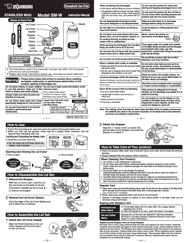 Instruction Manual for ZOJIRUSHI models including: SM-W, Stainless Mug, SM-W Stainless Mug, Mug