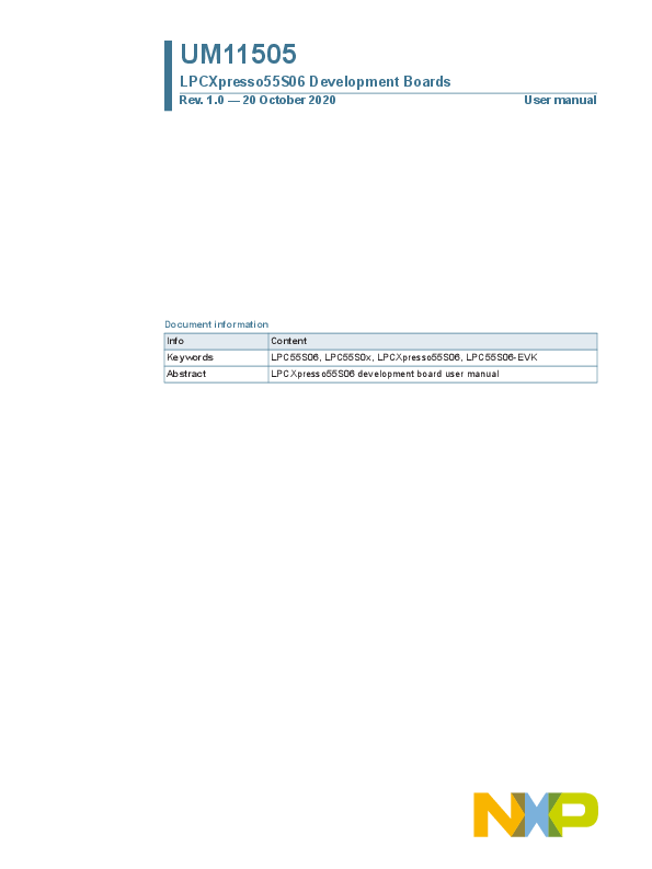 User manual. Rev. 1.0 — 20 October 2020. 3 of 17. NXP Semiconductors. UM11505. LPCXpresso55S06 Development Boards. 1. Introduction.