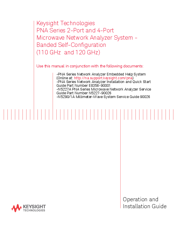Keysight Technologies PNA Series 2-Port and 4-Port Microwave Network Analyzer System Banded Self-Configuration (110 GHz and 120 GHz) Use this manual in conjunction with the following documents: -PNA Series Network Analyzer Embedded Help System (Online at: http://na.support.keysight.com/pna) -PNA Series Network Analyzer Installation and Quick Start Guide Part Number E8356-90001 -N5227A PNA Series Microwave Network Analyzer Service Guide Part Number N5227-90026 -N5290/1A Millimeter-Wave System Service Guide 90026 Operation and Installation Guide Notices © Keysight Technologies, Inc. 2009-2021 No part of this manual may be reproduced in any form or by any means (including electronic storage and retrieval or translation into a foreign language) without prior agreement and written consent from Keysight Technologies, Inc. as governed by United States and international copyright laws. Trademark Acknowledgments Manual Part Number N5292-90001 Edition Edition 1, January 2021 Printed in USA/Malaysia Published by: Keysight Technologies 1400 Fountaingrove Parkway Santa Rosa, CA 95403 Warranty THE MATERIAL CONTAINED IN THIS DOCUMENT IS PROVIDED "AS IS," AND IS SUBJECT TO BEING CHANGED, WITHOUT NOTICE, IN FUTURE EDITIONS. FURTHER, TO THE MAXIMUM EXTENT PERMITTED BY APPLICABLE LAW, KEYSIGHT DISCLAIMS ALL WARRANTIES, EITHER EXPRESS OR IMPLIED WITH REGARD TO THIS MANUAL AND ANY INFORMATION CONTAINED HEREIN, INCLUDING BUT NOT LIMITED TO THE IMPLIED WARRANTIES OF MERCHANTABILITY AND FITNESS FOR A PARTICULAR PURPOSE. KEYSIGHT SHALL NOT BE LIABLE FOR ERRORS OR FOR INCIDENTAL OR CONSEQUENTIAL DAMAGES IN CONNECTION WITH THE FURNISHING, USE, OR PERFORMANCE OF THIS DOCUMENT OR ANY INFORMATION CONTAINED HEREIN. SHOULD KEYSIGHT AND THE USER HAVE A SEPARATE WRITTEN AGREEMENT WITH WARRANTY TERMS COVERING THE MATERIAL IN THIS DOCUMENT THAT CONFLICT WITH THESE TERMS, THE WARRANTY TERMS IN THE SEPARATE AGREEMENT WILL CONTROL. Technology Licenses The hardware and/or software described in this document are furnished under a license and may be used or copied only in accordance with the terms of such license. U.S. Government Rights The Software is "commercial computer software," as defined by Federal Acquisition Regulation ("FAR") 2.101. Pursuant to FAR 12.212 and 27.405-3 and Department of Defense FAR Supplement ("DFARS") 227.7202, the U.S. government acquires commercial computer software under the same terms by which the software is customarily provided to the public. Accordingly, Keysight provides the Software to U.S. government customers under its standard commercial license, which is embodied in its End User License Agreement (EULA), a copy of which can be found at http://www.keysight.com/find/sweula The license set forth in the EULA represents the exclusive authority by which the U.S. government may use, modify, distribute, or disclose the Software. The EULA and the license set forth therein, does not require or permit, among other things, that Keysight: (1) Furnish technical information related to commercial computer software or commercial computer software documentation that is not customarily provided to the public; or (2) Relinquish to, or otherwise provide, the government rights in excess of these rights customarily provided to the public to use, modify, reproduce, release, perform, display, or disclose commercial computer software or commercial computer software documentation. No additional government requirements beyond those set forth in the EULA shall apply, except to the extent that those terms, rights, or licenses are explicitly required from all providers of commercial computer software pursuant to the FAR and the DFARS and are set forth specifically in writing elsewhere in the EULA. Keysight shall be under no obligation to update, revise or otherwise modify the Software. With respect to any technical data as defined by FAR 2.101, pursuant to FAR 12.211 and 27.404.2 and DFARS 227.7102, the U.S. government acquires no greater than Limited Rights as defined in FAR 27.401 or DFAR 227.7103-5 (c), as applicable in any technical data. Safety Notices A CAUTION notice denotes a hazard. It calls attention to an operating procedure, practice, or the like that, if not correctly performed or adhered to, could result in damage to the product or loss of important data. Do not proceed beyond a CAUTION notice until the indicated conditions are fully understood and met. A WARNING notice denotes a hazard. It calls attention to an operating procedure, practice, or the like that, if not correctly performed or adhered to, could result in personal injury or death. Do not proceed beyond a WARNING notice until the indicated conditions are fully understood and met. 1. Safety and Regulatory Information Information in This Chapter . . . . . . . . . . . . . . . . . . . . . . . . . . . . . . . . . . . . . . . . . . . . . . . . . . 1-1 Chapter One at-a-Glance . . . . . . . . . . . . . . . . . . . . . . . . . . . . . . . . . . . . . . . . . . . . . . . . 1-2 Safety Symbols . . . . . . . . . . . . . . . . . . . . . . . . . . . . . . . . . . . . . . . . . . . . . . . . . . . . . . . . . . . 1-3 General Safety Considerations . . . . . . . . . . . . . . . . . . . . . . . . . . . . . . . . . . . . . . . . . . . . . . . 1-4 Safety Earth Ground . . . . . . . . . . . . . . . . . . . . . . . . . . . . . . . . . . . . . . . . . . . . . . . . . . . . 1-4 Before Applying Power . . . . . . . . . . . . . . . . . . . . . . . . . . . . . . . . . . . . . . . . . . . . . . . . . . 1-4 Servicing . . . . . . . . . . . . . . . . . . . . . . . . . . . . . . . . . . . . . . . . . . . . . . . . . . . . . . . . . . . . . 1-5 Electrostatic Discharge Protection . . . . . . . . . . . . . . . . . . . . . . . . . . . . . . . . . . . . . . . . . . . . . 1-6 ESD Equipment Required for the Installation . . . . . . . . . . . . . . . . . . . . . . . . . . . . . . . . . 1-7 Regulatory Information. . . . . . . . . . . . . . . . . . . . . . . . . . . . . . . . . . . . . . 