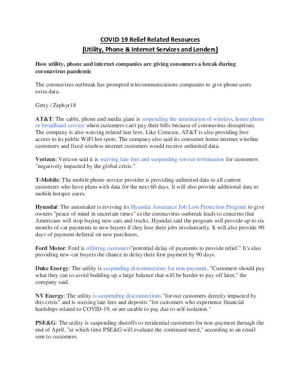 COVID-19 Relief Related Resources (Utility, Phone & Internet Services and Lenders) How utility, phone and internet companies are giving consumers a break during coronavirus pandemic The coronavirus outbreak has prompted telecommunications companies to give phone users extra data. Getty / Zephyr18 AT&T: The cable, phone and media giant is suspending the termination of wireless, home phone or broadband service when customers can't pay their bills because of coronavirus disruptions. The company is also waiving related late fees. Like Comcast, AT&T is also providing free access to its public WiFi hot spots. The company also said its consumer home internet wireline customers and fixed wireless internet customers would receive unlimited data. Verizon: Verizon said it is waiving late fees and suspending service termination for customers "negatively impacted by the global crisis." T-Mobile: The mobile phone service provider is providing unlimited data to all current customers who have plans with data for the next 60 days. It will also provide additional data to mobile hotspot users. Hyundai: The automaker is reviving its Hyundai Assurance Job Loss Protection Program to give owners "peace of mind in uncertain times" as the coronavirus outbreak leads to concerns that Americans will stop buying new cars and trucks. Hyundai said the program will provide up to six months of car payments to new buyers if they lose their jobs involuntarily. It will also provide 90 days of payment deferral on new purchases. Ford Motor: Ford is offering customers"potential delay of payments to provide relief." It's also providing new-car buyers the chance to delay their first payment by 90 days. Duke Energy: The utility is suspending disconnections for non-payment. "Customers should pay what they can to avoid building up a large balance that will be harder to pay off later," the company said. NV Energy: The utility is suspending disconnections "for our customers directly impacted by this crisis" and is waiving late fees and deposits "for customers who experience financial hardships related to COVID-19, or are unable to pay due to self-isolation." PSE&G: The utility is suspending shutoffs to residential customers for non-payment through the end of April, "at which time PSE&G will evaluate the continued need," according to an email sent to customers. Charter Communications: The telecommunications company is providing free Spectrum broadband and Wi-Fi internetfor the next 60 days to households with K-12 students or college students who don't already have a subscription. Like Comcast and AT&T, it's also offering its Wi-Fi hot spots for free to the public. Atlanta Gas Light: The utility has suspended shutoffs for seven days while it evaluates its options. Dominion Energy: The utility has suspended disconnections for nonpayment. National Grid: The company is suspending service disconnections and other "collections-related activities" through the end of April, after which the policy will be reevaluated. Atlantic Broadband: The company will not terminate service for residential or small business customers due to nonpayment if they've faced "disruptions caused by the coronavirus pandemic." It is also waiving late fees that customers "might normally incur because of their economic circumstances related to the coronavirus pandemic." Enterprise: The rental car company is reducing the minimum age for renting a car to 18 through May 31 "to make it easier for students to get home to their families" due to the suspension of college courses. Hertz: The rental car company has also reduced the minimum age for renting a car to 18 through May 31 and is waiving the associated "young renter fee." Northern Indiana Public Service Company: NIPSCO is suspending shutoffs for nonpayment until further notice. Green Mountain Power: The utility is suspending shutoffs and is deferring bill collection in recognition of financial hardships some customers may face due to the coronavirus outbreak. Contributing: Kelly Tyko, USA TODAY; Aki Soga, Burlington Free Press Lenders: 22 lenders that will help you with auto loan and lease payments in response to COVID-19 Ally Bank Ally is allowing customers to defer auto loan payments for up to 120 days. You won't pay late fees, but finance charges will continue to accrue. If you choose to defer, remember to cancel auto-pay through Ally. Learn more about Ally's response to COVID-19 here. Bank of America Bank of America is offering assistance with auto loans on a case-by-case basis. If you have a Bank of America account, you can apply for deferral online. Learn more about Bank of America's response to COVID-19 here. BMW Financial Services BMW hasn't provided details about how it will help customers who have been affected by the coronavirus, but you can contact customer service to ask about payment assistance. Learn more about BMW's response to COVID-19 here. Capital One Capital One encourages customers who are facing financial hardship due to call 1 (800) 9460332 to discuss payment options. Learn more about Capital One's response to COVID-19 here. CarMax If you've been financially impacted by the coronavirus, you can call CarMax at 1 (800) 9253612. Learn more about CarMax's response to COVID-19 here. Chase If you've leased a car through Chase and your term is coming to an end, Chase will automatically extend your lease for up to six months, so you don't need to call to confirm your extension. The company is offering a variety of payment assistance programs for car owners and lessees. If you have a Chase auto loan, you can call 1 (800)336-6675. If you have a lease, call 1 (800) 2275151. Learn more about Chase's response to COVID-19 here. Chrysler Capital Chrysler Capital has programs to help customers affected by the coronavirus, but it doesn't provide details on its website. The company encourages people to call 1 (855) 563-5635 to discuss payment assistance. Learn more about Chrysler Capital's response to COVID-19 her