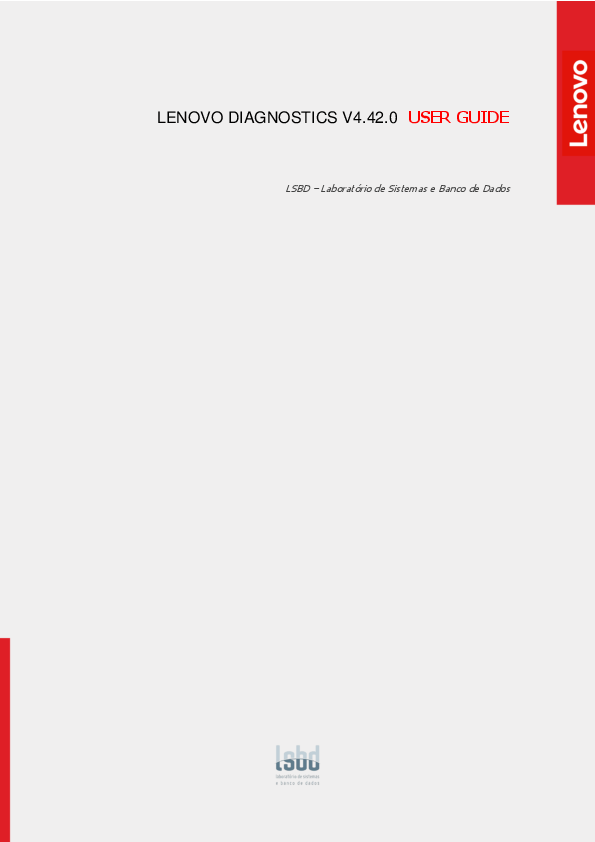 LENOVO DIAGNOSTICS V4.42.0 USER GUIDE LSBD Laboratório de Sistemas e Banco de Dados 1 LENOVO DIAGNOSTICS USER GUIDE Title: Author: E-mail: Date: Platform: Lenovo Diagnostics User Guide Júlio Oliveira julio.oliveira@lsbd.ufc.br November 26th, 2021 Windows 2 REVISION HISTORY Revision Author 1.0 Elsa Martins 1.1 Elsa Martins 1.2 Helano Rocha 1.3 Helano Rocha 1.4 Helano Rocha 1.5 Geisiane Almeida 1.6 Júlio Oliveira 1.7 Geisiane Almeida 1.8 Geisiane Almeida 1.9 Geisiane Almeida 1.10 Geisiane Almeida 1.11 Júlio Oliveira 1.12 Júlio Oliveira 1.13 Júlio Oliveira 1.14 Nielly Lima 1.15 Júlio Oliveira 1.16 Júlio Oliveira Revision History Created according to Lenovo Diagnostics 4.29 Updated according to Lenovo Diagnostics 4.30 Updated according to Lenovo Diagnostics 4.31 Updated according to Lenovo Diagnostics 4.32 Updated according to Lenovo Diagnostics 4.33 Updated according to Lenovo Diagnostics 4.34 Updated according to Lenovo Diagnostics 4.35 Updated according to Lenovo Diagnostics 4.35.1 Updated according to Lenovo Diagnostics 4.36 Updated according to Lenovo Diagnostics 4.37 Updated according to Lenovo Diagnostics 4.38 Updated according to Lenovo Diagnostics 4.39 Updated according to Lenovo Diagnostics 4.40 Updated according to Lenovo Diagnostics 4.40.1 Updated according to Lenovo Diagnostics 4.40.2 Updated according to Lenovo Diagnostics 4.41.0 Added: Section 3.25 SIM Card Updated according to Lenovo Diagnostics 4.42.0 Date Mar 15, 2019 May 23, 2019 Jul 30, 2019 Oct 15, 2019 Jan 17, 2020 Feb 20, 2020 Apr 29, 2020 Jun 08, 2020 Jun 29, 2020 Oct 20, 2020 Dec 14, 2020 Mar 05, 2021 Jun 24, 2021 Jul 27, 2021 Aug 05, 2021 Sep 17, 2021 Nov 26, 2021 3 TABLE OF CONTENTS LENOVO DIAGNOSTICS V4.42.0 USER GUIDE 1 Lenovo Diagnostics User Guide 2 Revision History 3 TABLE OF Contents 4 LENOVO DIAGNOSTICS V4.42.0 USER GUIDE 6 1. Lenovo Diagnostics overview 7 1.1 What is Lenovo Diagnostics? 7 1.2 Understanding the diagnostics 7 1.3 Data Collection 8 2. Performing diagnostics in Lenovo Diagnostics 9 2.1 Lenovo Diagnostics Main screen 9 2.2 Run diagnostic for a module 10 2.2.1 Select Devices and Tests 10 2.2.2 Run Tests 12 2.3 See Execution Log 14 3. Lenovo Diagnostics Modules and Tests 16 3.1 Audio 16 3.2 Audio Controller 17 3.3 Battery 18 3.4 Camera 19 3.5 Fan 19 3.6 Processor 20 3.7 Display 21 3.8 Display Interface 22 3.9 Keyboard 23 3.10 Memory 24 3.11 Motherboard 26 3.12 Optical Drive 27 3.13 PCI Express 28 3.14 Mouse Devices 29 3.15 RAID 30 3.16 Storage 31 4 3.17 Touchscreen 33 3.18 Video Card 35 3.19 Wired Ethernet 37 3.20 Wireless 37 3.21 Sensors 38 3.22 Bluetooth 41 3.23 Fingerprint 42 3.24 Touchpad Devices 43 3.25 SIM Card 44 4. EXPLORING LENOVO RUN ALL OPTION 45 4.1 Quick tests 45 4.2 Quick tests (customized option) 45 4.3 Full tests 46 4.4 Full tests (customized option) 46 5. EXPLORING LENOVO DIAGNOSTICS TOOLS 47 5. 1 Diagnostic Script 47 5.1.1 Create a diagnostic script 48 5.1.2 Edit a diagnostic script 49 5.1.3 Execute a diagnostic script 50 5.2 System Information 52 5.3 Log History 53 5.4 Recover Bad Sectors 53 5.5 SMART Tool 54 5.6 eGather Report 55 5.7 Powercfg Reports 55 5.8 Network Speed Tool 55 5.9 Temperature Tool 56 5.10 Battery Charge Graph 56 6. System Events supported 57 7. Glossary 57 5 LENOVO DIAGNOSTICS V4.42.0 USER GUIDE Note Before using this information, be sure to read and understand the Lenovo Privacy Statement. 6 Lenovo Diagnostics v4.42.0 User Guide 1. LENOVO DIAGNOSTICS OVERVIEW 1.1 What is Lenovo Diagnostics? Lenovo Diagnostics is a diagnostic tool that tests various devices in Lenovo computers providing feedback to the users about their machines health. Lenovo Diagnostics is composed by Modules that allows performing diagnostics for a group of devices and by Tools to create custom executions (diagnostic script), see detailed information about each device (system information) and consult the results for the tests performed in a machine (Log History). 1.2 Understanding the diagnostics Each module contains one or more tests that may be performed under one or more devices resulting in a diagnostic. This structure is displayed in the image below: When a diagnostic is finished, Lenovo Diagnostics displays the results for each performed test and create two results codes resuming the test execution. 7 Lenovo Diagnostics v4.42.0 User Guide The tests on Lenovo Diagnostics may have the following statuses: Passed Failed Warning Canceled Not Applicable When the test algorithm is executed, and no failure is found. When the test identifies the diagnosed device is defective. When the test indicates the diagnosed device may have some defect, but the result is not conclusive. When the test is canceled in the middle of test execution. When the test is not applicable for the selected device. The generated codes are: Result Code Contains information about the machine serial number, system platform and test execution status and date. This code is generated for each tested device. Final Result Code Contains information about the machine serial number, system platform and execution date. This code reports also the module where the tests were performed and the tests with failed status. On the next section, you will learn how to use Lenovo Diagnostics to perform the diagnostics. 1.3 Data Collection Lenovo Diagnostics tool perform collect anonymous data regarding tests execution for the purpose of improve hardware's diagnostics. You are able to enable or disable that function in accordance with your preferences. By opening the Lenovo Diagnostics tool for the first time, the application will display a message asking if you agree or not with Lenovo Product Privacy Statement. 8 Lenovo Diagnostics v4.42.0 User Guide You also may change this option at any time by clicking at the Settings icon 2. PERFORMING DIAGNOSTICS IN LENOVO DIAGNOSTICS 2.1 Lenovo Diagnostics Main screen By opening the Lenovo Diagnostics, you will see the main screen with the tabs Diagnostics and Tools. Diagnostics: here, you can