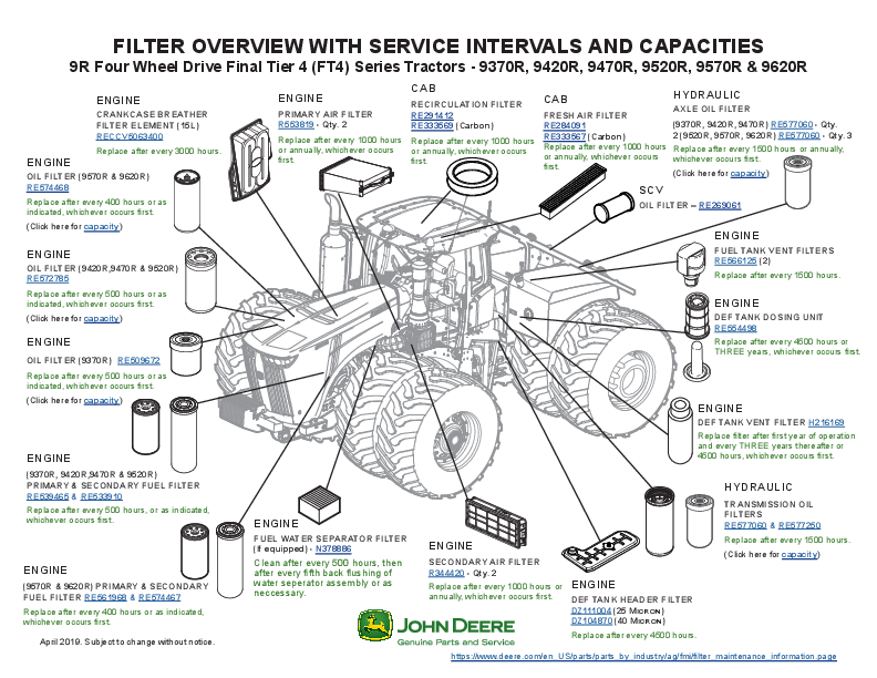 FILTER OVERVIEW WITH SERVICE INTERVALS AND CAPACITIES. 9R Four Wheel Drive Final Tier 4 (FT4) Series Tractors - 9370R, 9420R, 9470R, 9520R, ...