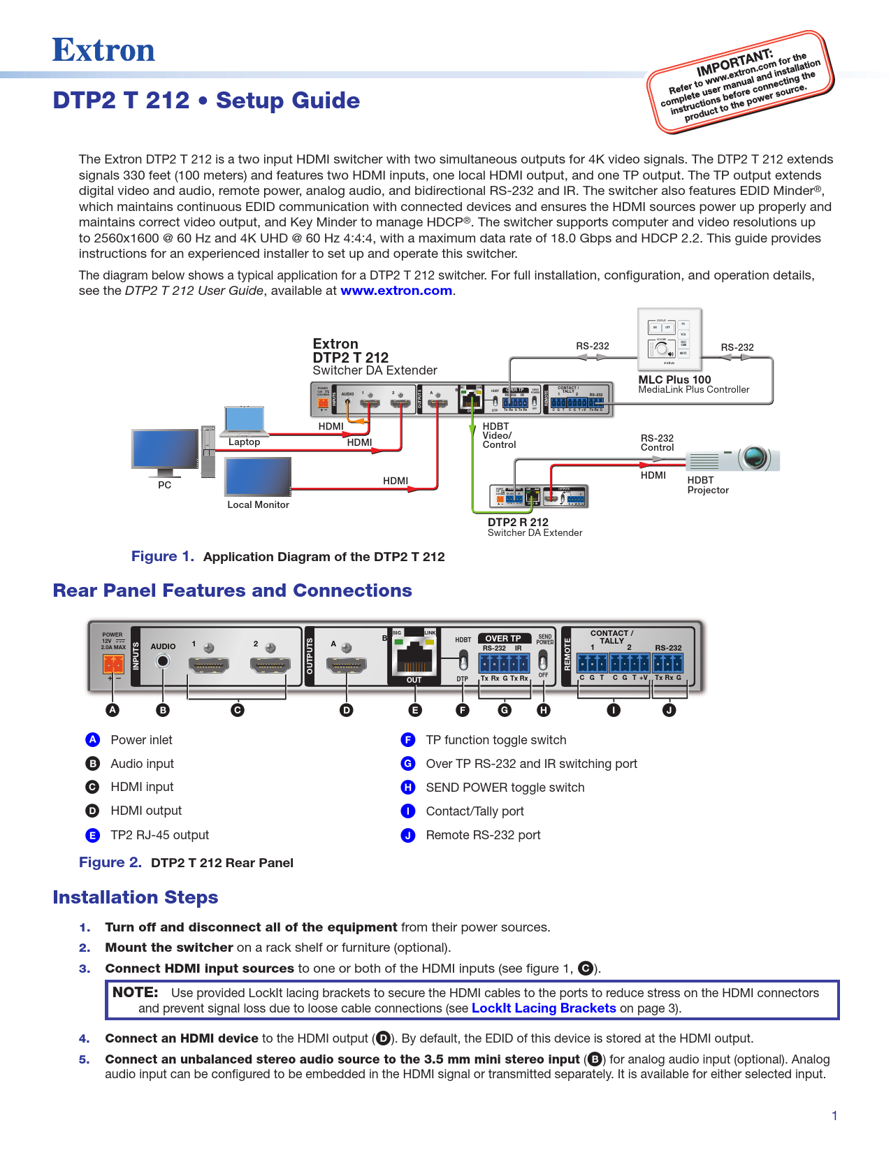 DTP2 T 212 · Setup Guide The Extron DTP2 T 212 is a two input HDMI switcher with two simultaneous outputs for 4K video signals. The DTP2 T 212 extends signals 330 feet (100 meters) and features two HDMI inputs, one local HDMI output, and one TP output. The TP output extends digital video and audio, remote power, analog audio, and bidirectional RS-232 and IR. The switcher also features EDID Minder®, which maintains continuous EDID communication with connected devices and ensures the HDMI sources power up properly and maintains correct video output, and Key Minder to manage HDCP®. The switcher supports computer and video resolutions up to 2560x1600 @ 60 Hz and 4K UHD @ 60 Hz 4:4:4, with a maximum data rate of 18.0 Gbps and HDCP 2.2. This guide provides instructions for an experienced installer to set up and operate this switcher. The diagram below shows a typical application for a DTP2 T 212 switcher. For full installation, configuration, and operation details, see the DTP2 T 212 User Guide, available at www.extron.com. WiFi 1 2 3 4 Laptop INPUTS OUTPUTS REMOTE Extron DTP2 T 212 Switcher DA Extender POWER 12V 2.0A MAX AUDIO 1 2 A HDMI HDMI RS-232 SIG B LINK HDBT OVER TP SEND POWER RS-232 IR OUT DTP Tx Rx G Tx Rx OFF HDBT Video/ Control CONTACT / TALLY 1 2 RS-232 C G T C G T +V Tx Rx G PC Local Monitor HDMI Figure 1. Application Diagram of the DTP2 T 212 Rear Panel Features and Connections POWER OVER DTP2 12V 0.8A MAX RS-232 IR SIG LINK Tx Rx G Tx Rx DTP2 IN OUTPUTS AUDIO L R DTP2 R 212 Switcher DA Extender DISPLAY ON OFF VOLUME PC VGA DOC CAM MUTE Extron RS-232 MLC Plus 100 MediaLink Plus Controller RS-232 Control HDMI HDBT Projector INPUTS OUTPUTS REMOTE POWER 12V 2.0A MAX AUDIO 1 2 A SIG B LINK HDBT OVER TP SEND POWER RS-232 IR CONTACT / TALLY 1 2 RS-232 OUT DTP Tx Rx G Tx Rx OFF C G T C G T +V Tx Rx G AB C D E F GH I JJ A Power inlet B Audio input C HDMI input D HDMI output E TP2 RJ-45 output F TP function toggle switch G Over TP RS-232 and IR switching port H SEND POWER toggle switch I Contact/Tally port J Remote RS-232 port Figure 2. DTP2 T 212 Rear Panel Installation Steps 1. Turn off and disconnect all of the equipment from their power sources. 2. Mount the switcher on a rack shelf or furniture (optional). 3. Connect HDMI input sources to one or both of the HDMI inputs (see figure 1, C). NOTE: Use provided LockIt lacing brackets to secure the HDMI cables to the ports to reduce stress on the HDMI connectors and prevent signal loss due to loose cable connections (see LockIt Lacing Brackets on page 3). 4. Connect an HDMI device to the HDMI output (D). By default, the EDID of this device is stored at the HDMI output. 5. Connect an unbalanced stereo audio source to the 3.5 mm mini stereo input (B) for analog audio input (optional). Analog audio input can be configured to be embedded in the HDMI signal or transmitted separately. It is available for either selected input. 1 DTP2 T 212 · Setup Guide (Continued) 6. Connect an RJ45 DTP or HDBT receiving device to the output (see figure 2, E on the previous page) for either DTP or HDBT mode (see image to the right to properly wire the RJ-45 connector). · If the receiver is in the Extron DTP2 series, set the DTP/HDBT toggle switch (F) to DTP and the SEND POWER switch (H) to the UP (SEND POWER) position. On the receiver, set the SEND POWER switch to the DOWN (OFF) position. · If the receiver is in the Extron Legacy DTP series, set the DTP/HDBT toggle switch (F) to DTP and the SEND POWER switch (H) to the DOWN (OFF) position. · If the receiver is HDBaseT enabled, set the DTP/HDBT toggle switch (F) to HDBT, and the SEND POWER switch (H) to the DOWN (OFF) position. Pins: 12345678 TP Wires TIA/EIA T 568B Pin Wire color 1 White-orange 2 Orange 3 White-green 4 Blue 5 White-blue 6 Green 7 White-brown 8 Brown ATTENTION: · Position these toggle switches (see figure 2, F and H) BEFORE connecting the appropriate device to the TP connector. Failure to comply can damage the endpoint. · Positionnez ces sélecteurs (voir figure 2, F et H) AVANT de connecter l'appareil approprié au connecteur TP. Ne pas respecter cette procédure pourrait endommager le point de connexion. · The DTP2 T 212 is configured to output power to DTP2 models only. If connected to a Legacy DTP or HDBT device, set the SEND POWER toggle switch to the "DOWN" position (OFF). Failure to turn the power OFF will damage the connected Legacy DTP device. · Le DTP2 T 212 est configuré pour fournir une alimentation aux modèles DTP2 uniquement. S'il est connecté à un autre appareil, veuillez positionner l'interrupteur à bascule sur « DOWN » (OFF). Si l'interrupteur n'est pas positionné sur OFF, vous risquez d'entraîner la défaillance de l'appareil Legacy DTP connecté. NOTE: When the output is configured for DTP mode, remote power is available for Extron DTP2 devices only. When the output is configured for HDBT mode, remote power is disabled and both the switching transmitter and receiver require their own 12 VDC powerDsTuPpEpnldyp. oint Connected to a DTP2 Endpoint OFF Extron DTP2 T 212 Transmitter INPUTS POWER Extron 12V 2.0A MAX AUDIO 1 2 DTP2 T 212 Transmitter POWER 12V 2.0A MAX AUDIO 1 2 OUTPUTS SEND DTP Endpoint CPoOWnERnected to a DTP2 EndpointExtron OFF OFF SEND A SIG B LINK HDBT OVER TP SEND POWER RS-232 IR POCWONETARCT / TALLY 1 2 RS-232 No Remote Power DTP HDMI 4K 330 Rx Receiver Extron OVER DTP RS-232 IR REMOTE OUT DTP Tx Rx G Tx Rx OFF C G T C G T +V Tx Rx G OFF A SIG B LINK HDBT OVER TP SEND POWER RS-232 IR CONTACT / TALLY 1 2 RS-232 CATx Cable up to 330' (100 m) No Remote Power DTP HDMI 4K 330 Rx TxRx G Tx Rx DTP HDMI 330 Rx Receiver OVER DTP RS-232 IR REMOTE OUTPUTS INPUTS Local Power Supply OUT DTP Tx Rx G Tx Rx OFF C G T C G T +V Tx Rx G CATx Cable up to 330' (100 m) Tx Rx G Tx Rx DTP HDMI 330 Rx Local Power Supply Local Power Supply Local Power Supply INPUTS Extron DTP2 T 212 Transmitter INPUTS POWER Extron 12V 2.0A MAX AUDIO 1 2 DTP2 T 212 Transmitter POWER 1
