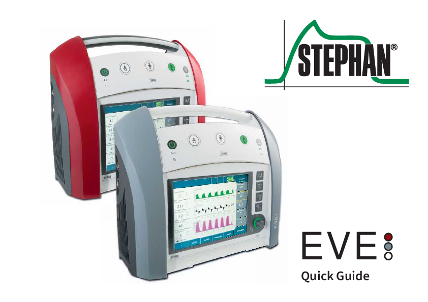 EVE Quick Guide Please read the detailed operating manual carefully. The Quick Guide does not replace the operating manual. Equipment is subject to technical modification Valid as of: 04/2020 Version: V1.0 From Software version: 2.3 Artikel-Nr.: 107090078 Fritz Stephan GmbH Medizintechnik · Kirchstraße 19 · 56412 Gackenbach · Germany Tel. +49 6439-91 25-0 · Fax +49 6439-91 25-111 · info@stephan-gmbh.com · www.stephan-gmbh.com Design and functional description Control panel 1 On/Off-Button 2 Mains power indicator 3 O2 supply indicator 4 Fast tracking key ,,Preterm infants and newborns" 5 Fast tracking key ,,Child" 6 Fast tracking key ,,Adult" 7 Charge indicator ,,Battery 2" 8 Charge indicator ,,Battery 1" 9 Acoustic alarm suppression Design and functional description On/Off/Standby-Button Press this button to switch the EVE on/off or, in the case of ongoing ventilation, to switch it to Standby mode. Fast tracking keys To prevent operator errors, the desired fast tracking key must be pressed for 0.5 s, after which it starts to flash green. Pressing the key again for 0.5 s will then start or switch to the selected ventilation mode. Acoustic alarm suppression If the key is pressed again within 5 s, the alarm suppression is canceled. Pressing the key again after 5 s has passed will start an new 2 minute countdown. Battery charge indicator : Capacity: 75 - 100% : Capacity: 40 - 75% : Capacity: 1 - 39% , flashing: 0% or Error Mains power indicator When connected to the energy supply, the mains power indicator is green. The internal batteries are charged automatically as needed. The battery charge indicators tell you the current battery level. O2 Oxygen supply indicator The indicator is green when an oxygen source with sufficient fill pressure is connected. Design and functional description Function buttons 1 Button ,,Preoxy" 2 Button ,,Inspiration Hold" 3 Button ,,Aerosol" 4 Toggle button ,,Day/Night" 5 Control knob ,,IGR" 6 Lock/Unlock touchscreen Functional description Button ,,Preoxy" Press the ,,Preoxy" button to administer a pre-adjustable inspiratory oxygen concentration for a certain preset interval. These settings can be configured in the ,,System Settings/Function" menu. At the same time, the display of the set oxygen concentration changes to the pre-set ,,preoxy" value. The alarm limits for oxygen concentration are adjusted automatically. The button is green while pre-oxygenation is in progress. Button ,,Inspiration Hold" Pressing this button during inspiration will hold inspiration at the end of the normal inspiration phase for the duration for which the button is pressed (maximum 15 s). Pressing the button during expiration will trigger a mandatory inspiration using the set ventilation parameters. Button ,,Day/Night" Toggle This button lets you toggle the display, alarm indicator and patient/function buttons between day and night mode. Functional description Button ,,Aerosol" Press the ,,Aerosol" button to switch on aerosol nebulization. The medication nebulization duration can be set to between 5 and 30 min in the ,,System Settings/Function" menu. The nebulization ends automatically at the end of the set time or when the button is pressed again. The button is green while nebulization is in progress. Aerosol nebulization is only possible if O2 is connected to the ventilator. Lock/Unlock Touchscreen Pressing the control knob for three seconds will lock the touchscreen. Press the control knob again for three seconds to unlock the touchscreen. When you tap the locked touchscreen, a lock icon appears in the ,,System Settings" field. Control knob ,,IGR" Use the control knob to select and activate all indirect functions. The control knob has the following functions: · Switching within the menus · Selecting and executing menu functions · Selecting and confirming parameter settings Design and functional description Right side view 1 Connection Inspiration tube 2 Connection Exspiration tube 3 Connection SpO2 Sensor 4 Connection CO2 Sensor 5 Connection Flow Sensor 6 Connection Aerosol nebulizer Design and functional description Rear view 1 Docking station interface 2 O2 Sensor cover Use only original Stephan O2 sensors 3 Internal battery 1 4 External battery 2 (optional) 5 External battery charge level indicator Lets you check the battery even when the device is switched off (LEDs). 6 Power supply input 7 Reset button (no reset to factory settings) 8 Docking station bracket 9 Adjustable bracket Preparation for use To connect the oxygen cylinder: · Fit the oxygen cylinder to the bracket on the mobile stand and secure. · Connect the pressure regulator · Connect the O2 hose to the O2 input on the left side of the EVE. · Slowly open the valve and then slowly release it completely. Note safety instructions Changing the oxygen cylinder · Hand-tighten the valve on the gas cylinder · Drain any residual gas from the pressure regulator via the output until the pressure gauge on the pressure regulator shows ,,0". · Loosen the O2 nist screw connector from the O2 input · Loosen the fastening buckles on the support frame and carefully remove the oxygen cylinder · Remove the pressure regulator from the valve by turning the screw connector counter-clockwise and connect to the new cylinder · Place the new cylinder in the support frame and close the fastening buckles · Fit the O2 nist screw connector to the O2 input · Open the pressurized gas cylinder`s valve Preparation for use Connection to the central gas supply If the device is not operated with an oxygen source, it must be connected to the CGS. Connect the O2 hose to the O2 connector on the left side of the EVE and to the CGS wall outlet. Connection to a low pressure oxygen concentrator When using oxygen with a concentration of 93% an adapter must be screwed on to EVE`s oxygen inlet and the ,,LPO" option must be activated. ,,LPO" adapter, Art.-No. 107061187 The input flow must be at least 3 l/min. The Fio2 setting on the device is de