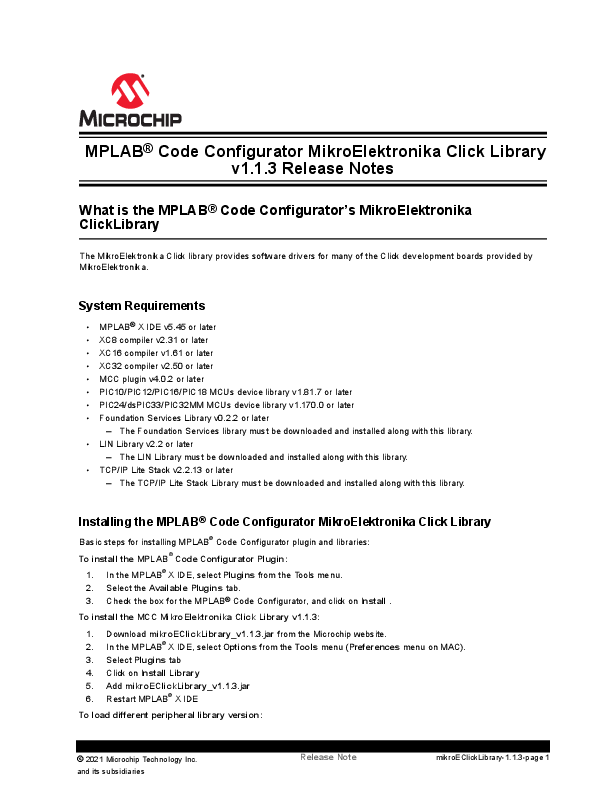 MPLAB® Code Configurator MikroElektronika Click Library v1.1.3 Release Notes What is the MPLAB® Code Configurator's MikroElektronika ClickLibrary The MikroElektronika Click library provides software drivers for many of the Click development boards provided by MikroElektronika. System Requirements · MPLAB® X IDE v5.45 or later · XC8 compiler v2.31 or later · XC16 compiler v1.61 or later · XC32 compiler v2.50 or later · MCC plugin v4.0.2 or later · PIC10/PIC12/PIC16/PIC18 MCUs device library v1.81.7 or later · PIC24/dsPIC33/PIC32MM MCUs device library v1.170.0 or later · Foundation Services Library v0.2.2 or later The Foundation Services library must be downloaded and installed along with this library. · LIN Library v2.2 or later The LIN Library must be downloaded and installed along with this library. · TCP/IP Lite Stack v2.2.13 or later The TCP/IP Lite Stack Library must be downloaded and installed along with this library. Installing the MPLAB® Code Configurator MikroElektronika Click Library Basic steps for installing MPLAB® Code Configurator plugin and libraries: To install the MPLAB® Code Configurator Plugin: 1. In the MPLAB® X IDE, select Plugins from the Tools menu. 2. Select the Available Plugins tab. 3. Check the box for the MPLAB® Code Configurator, and click on Install . To install the MCC MikroElektronika Click Library v1.1.3: 1. Download mikroEClickLibrary_v1.1.3.jar from the Microchip website. 2. In the MPLAB® X IDE, select Options from the Tools menu (Preferences menu on MAC). 3. Select Plugins tab 4. Click on Install Library 5. Add mikroEClickLibrary_v1.1.3.jar 6. Restart MPLAB® X IDE To load different peripheral library version: © 2021 Microchip Technology Inc. and its subsidiaries Release Note mikroEClickLibrary-1.1.3-page 1 1. Open Embedded > MPLAB® Code Configurator v4 from the Tools menu. 2. In the Versions tab under MikroElektronika Click Library, find the multiple library version (loaded version is indicated by the green check). 3. Right-click on the required version of the library and select Mark for load. 4. Click on Load Selected Libraries button to load the library. Running the Examples Examples are provided in each click module. To use these examples, make sure you include the example header into your main file, and then call the example function provided. Many of these examples use printf. If the Xpress Evaluation Board is used, note that it has a CDC device implementation and will enumerate as a COM port on your machine. Follow the steps below in order to enable printf commands to write to the COM port. 1. UART Pins on Xpress Evaluation Board The Xpress Evaluation board, which uses the PIC16F18855, is capable of writing to the serial port as long as the following settings are configured: Figure 1. Setting the EUSART's RX and TX pins to RC1 and RC0 respectively Figure 2. Redirecting STDIO to USART in the Hardware Settings tab of the EUSART module 2. I2C and SPI Pins on Xpress Evaluation Board Figure 3. Setting the I2C Pins © 2021 Microchip Technology Inc. and its subsidiaries Release Note mikroEClickLibrary-1.1.3-page 2 Figure 4. Setting the SPI Pins 3. Analog Pin on Xpress Evaluation Board Figure 5. Setting the Analog Pins What's New? · 1.1.3 Removed support for AVR devices. · 1.1.2 Compatibility update with MCC Plugin v4.0.2 and MCC Core v5.0.2 Fixed XC8 build failures on 8-bit devices · 1.1.1 Extended the below listed MikroElektronika clicks support to AVR, PIC24/dsPIC, and PIC32MM devices · OLED C, Thumbstick, Accel 3, Weather, EEPROM 2, LCD mini, Heart rate, 8x8 G, and 7seg Bug fixes and improvements Repairs and Enhancements None. © 2021 Microchip Technology Inc. and its subsidiaries Release Note mikroEClickLibrary-1.1.3-page 3 Known Issues # ID Description 1 MCC_CLICK-239 Clicks using ADC: Code generation failure after reload 2 MCCV3XX-8601 WiFly Click Not Working with Xpress Eval Board 3 MCC_CLICK-482 USB I2C click build failure 4 MCC_CLICK-487 GPS3 and Nano GPS clicks - Hardcoded INTCON register Device(s) Affected All All All PIC18FxxK42, PIC18FxxK83, PIC18FxxQ43, PIC18FxxQ83/84, PIC18FxxQ40/41 FAQ For frequently asked questions, please refer to the FAQ post on the MCC Forum (http://www.microchip.com/forums/ f293.aspx) Supported Clicks · ACCEL3 · Air Quality · Alcohol · Altitude · CO · Compass 2 · Current · Diff Pressure · Gyro · Hydrogen · HDC1000 · LPG · Methane · Noise · Ozone · Weather · Counter · EEPROM · EEPROM 2 · EEPROM 3 · FLASH 2 · RTCC 5 · Thumb stick · Touchpad · ADC · ADC2 · ADC3 · Ammeter · DAC · DAC3 · DigiPot · Relay · 4-20 mA R · 4-20 mA T · ETH · Expand · MCP2003B · RS232 · RS485 · USBI2C · USBSPI · USBUART · RN2483 LoRa · RN2903 Lora 2 · GPSNano · RFid · WiFi Plus · WiFly · RN4020 BLE 2 · RN41 Bluetooth · GPS 3 · GSM · GSM 2 · MCP25625 · CANSPI · Proximity 2 · nRFC · LED8X8G · Thermo 5 · Fan · eInk · LCD Mini · OLED C · LED 7 Seg · AC Current · Stereo Amp · SRAM · Audio Amp · 7x10R · Line Follower · MIC24045 · RTC 6 · BT Audio · Light Ranger Supported Devices and Families The MCC MikroElektronika Click Library v1.1.3 supports the following families: · 8 bit Families Devices supported by latest pic10-pic12-pic16-pic18 MCU library · 16 bit Families 16-bit devices supported by latest pic24-dspic33-pic32mm library · 32 bit Families © 2021 Microchip Technology Inc. and its subsidiaries Release Note mikroEClickLibrary-1.1.3-page 4 PIC32MM family of devices supported by latest pic24-dspic33-pic32mm library © 2021 Microchip Technology Inc. and its subsidiaries Release Note mikroEClickLibrary-1.1.3-page 5 Table of Contents What is the MPLAB® Code Configurator's MikroElektronika ClickLibrary......................................................1 1. System Requirements.................................................................................................................. 1 2. Installing the MPLAB® Code Configurator MikroElektron