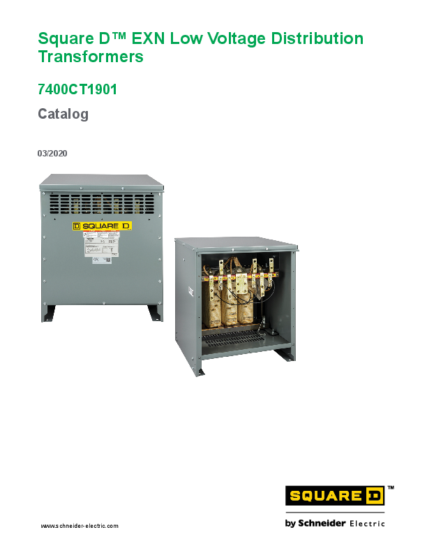 Square DTM EXN Low Voltage Distribution Transformers 7400CT1901 Catalog 03/2020 www.schneider-electric.com Legal Information The Schneider Electric brand and any trademarks of Schneider Electric SE and its subsidiaries referred to in this guide are the property of Schneider Electric SE or its subsidiaries. All other brands may be trademarks of their respective owners. This guide and its content are protected under applicable copyright laws and furnished for informational use only. No part of this guide may be reproduced or transmitted in any form or by any means (electronic, mechanical, photocopying, recording, or otherwise), for any purpose, without the prior written permission of Schneider Electric. Schneider Electric does not grant any right or license for commercial use of the guide or its content, except for a non-exclusive and personal license to consult it on an "as is" basis. Schneider Electric products and equipment should be installed, operated, serviced, and maintained only by qualified personnel. As standards, specifications, and designs change from time to time, information contained in this guide may be subject to change without notice. To the extent permitted by applicable law, no responsibility or liability is assumed by Schneider Electric and its subsidiaries for any errors or omissions in the informational content of this material or consequences arising out of or resulting from the use of the information contained herein. Product Description 7400CT1901 The Square DTM Distribution Transformer is designed to supply power throughout the building. The transformer permits the use of multiple voltages in the design of the system. Some advantages to designing a system with low voltage transformers: · Distributes a voltage higher than required by the load to limit wire losses and voltage drop · Addition of source impedance to the system, reducing common overcurrent at normal voltages · Mitigates harmonics through an internal magnetic circuit · Allows system grounding closer to the load, reducing capacitive noise · Can be designed for any output voltage that is required. A few disadvantages to designing a system with low voltage distribution transformers: · Reduces overall efficiency of the system due to internal losses within the transformer · Added heat to the building if installed indoors and in the HVAC system. The impact on the efficiency of the system and the concerns for improvements in the market for energy consumption have led to low voltage distribution transformers being regulated through the Energy Policy and Conservation Act (United States) and Natural Resources (Canada). Below are the efficiency ratings of Three-Phase Low Voltage Dry-Type Distribution Transformers: Three-Phase kVA 15 30 45 75 112.5 150 225 300 500 750 1000 Efficiency (%) 97.89 98.23 98.40 98.60 98.74 98.83 98.94 99.02 99.14 99.23 99.28 NOTE: All efficiency values are at 35% of nameplaterated load, determined according to the U.S. Department of Energy (DOE) Test Method for Measuring the Energy Consumption of Distribution Transformers under Appendix A to Subpart K of 10 CFR part 431. 7400CT1901 3 7400CT1901 EXN Energy Efficient Transformer Family Square D transformers manufactured by Schneider ElectricTM are optimized for performance, including the following components: · Coil--Designed to reduce the losses with customized wire configurations used exclusively by Schneider Electric. Computer-controlled winding equipment minimizes variability during the winding process. Aluminum conductors are standard with copper conductors available as a factory option. · Insulation System--The system consists of a conductor wrap or coating, layer insulation, air gap spacing, and varnish material. The system is UL listed for a specific maximum temperature for average temperature rise, hot spot, and ambient temperature. Schneider Electric's EXN family of transformers have a 428°F (220°C) insulation system, with an average temperature rise maximum of 302°F (150°C). · Core--EXN Transformers are designed with high-grade grain oriented, nonaging silicon steel laminations with high magnetic permeability, low hysteresis, and low eddy current losses. The computer-aided process allows the design to keep the magnetic flux densities well below the saturation point. The laminations are carefully and evenly stacked via distributive gap laminations, then clamped together to ensure an efficient magnetic circuit while providing a quiet quality offering of low voltage transformers. · Terminals--Sized to allow the lugs to align with all corresponding Schneider Electric equipment (such as circuit breakers, switches, panelboards, switchboards, etc.). The terminal positioning separates the Primary and Secondary terminals and meets the National Electrical Code® (NEC®) minimum wire bending requirements. Lugs are not shipped with the transformer. This allows the installer the flexibility to order what is needed to meet any distribution system requirements. NOTE: Both mechanical and compression lug kits are available from Schneider Electric. Terminals are standardized to National Electrical Manufacturers Association® (NEMA®) two-pole pad dimensions. Codes and Standards NEMA ST-20--100% routine testing prior to shipment; other ST-20 testing available at time of order, to be included when shipped. UL1561 and CSA22.2 No. 47--Third party Certified by UL File E6868; cULus Labeled Energy Efficient Registration--Department of Energy 10 CFR 429; Natural Resources Canada via UL Manufactured in ISO 9001 Facilities--Product Environmental Profile RoHS/ REACH 4 7400CT1901 EXN -- Enclosure 17M 7400CT1901 Cat. No. DOE 2016 Efficiency Winding Material Temp. Rise 220°C Insulation Core Loss Coil Loss %IZ %IX X/R Weight (lbs.) 15 kVA, 480 Delta 6-2.5%2+4- Pri Taps, 208Y/120, Sound Level 39 dB EXN15T3H 97.96% Al 150°C 50 592 4.03 1.79 0.53 188 EXN15T3HCU 98.05% Cu 150°C 48 562 4.06 1.72 0.47 222 EXN15T3HF 98.00% Al 115°C 50 538 3.98 1.79
