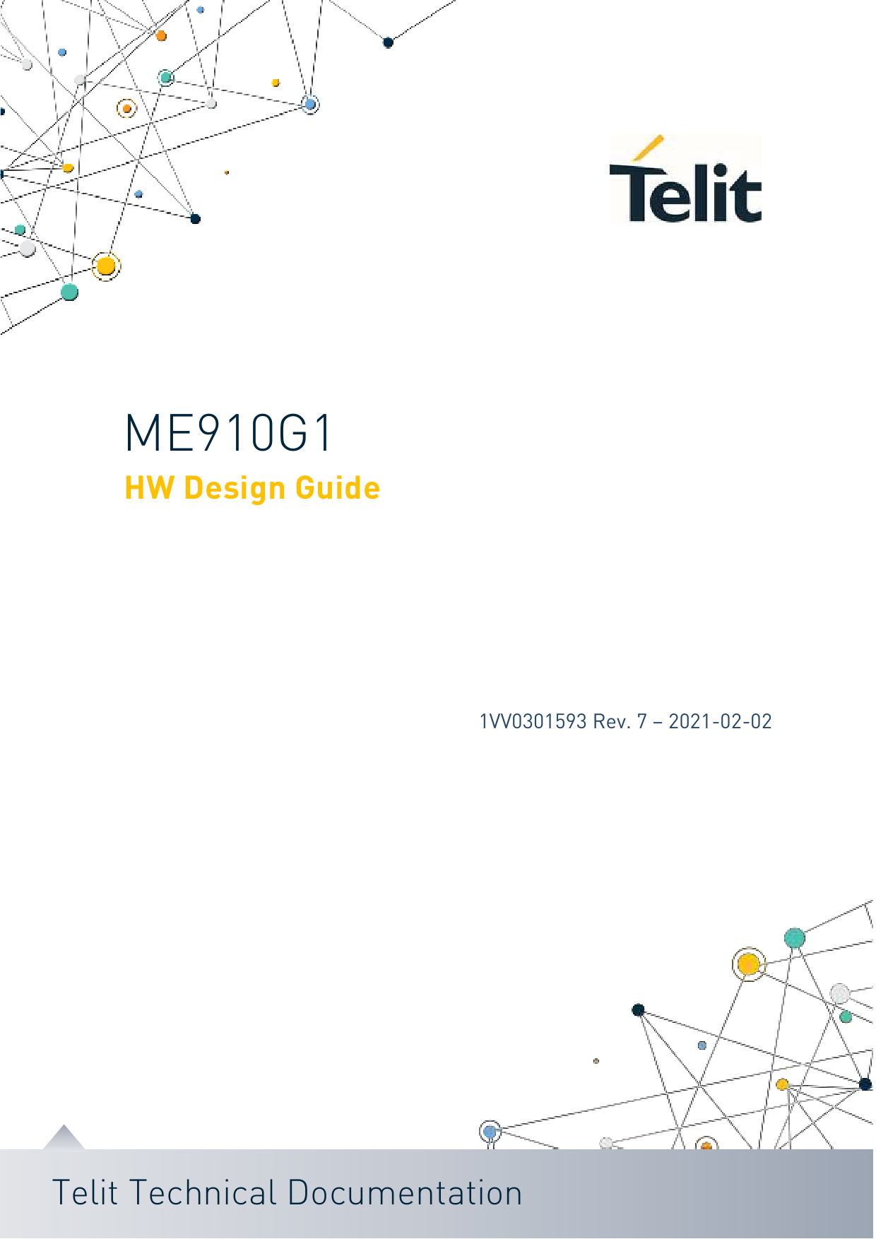 ME910G1 HW Design Guide 1VV0301593 Rev. 7 2021-02-02 Telit Technical Documentation ME910G1 HW Design Guide APPLICABILITY TABLE ME910G1-W1 ME910G1-WW ME910G1-WWV PRODUCTS 1VV0301593 Rev.7 Page 2 of 98 2021-02-02 ME910G1 HW Design Guide CONTENTS APPLICABILITY TABLE CONTENTS 1. INTRODUCTION Scope Audience Contact Information, Support Symbol Convention Related Documents 2. GENERAL PRODUCT DESCRIPTION Overview Product Variants and Frequency Bands Target Market Main features TX Output Power ME910G1-W1 ME910G1-WW and ME910G1-WWV RX Sensitivity ME910G1-W1 ME910G1-WW and ME910G1-WWV Mechanical Specifications Dimensions Weight Temperature Range 3. PINS ALLOCATION Pin-out LGA Pads Layout 4. POWER SUPPLY Power Supply Requirements Power Consumption 1VV0301593 Rev.7 Page 3 of 98 2 3 8 8 8 8 9 9 10 10 10 11 11 12 12 12 13 13 15 17 17 17 17 18 18 24 25 25 26 2021-02-02 ME910G1 HW Design Guide Idle mode ME910G1-W1 Connected Mode ME910G1-WW and ME910G1-WWV Connected Mode General Design Rules Electrical Design Guidelines of the power supply +5V Source Power Supply Design Guidelines +12V Source Power Supply Design Guidelines Battery Source Power Supply Design Guidelines Thermal Design Guidelines Power Supply PCB layout Guidelines VAUX Power Output RTC Supply 5. DIGITAL SECTION Logic Levels Power On Power Off Wake from deep sleep mode Unconditional Shutdown Fast shut down Fast Shut Down by Hardware Fast Shut Down by Software Communication ports USB 2.0 HS SPI SPI Connections Serial Ports Modem serial port 1 (USIF0) Modem serial port 2 (USIF1) RS232 level translation General purpose I/O Using a GPIO as INPUT Using a GPIO as OUTPUT 1VV0301593 Rev.7 Page 4 of 98 26 27 28 29 29 29 30 31 31 32 34 34 35 35 36 40 42 42 45 45 46 47 47 48 48 49 49 50 51 53 53 54 2021-02-02 ME910G1 HW Design Guide Indication of network service availability External SIM Holder ADC Converter 6. RF SECTION Antenna requirements PCB Design guidelines PCB Guidelines in case of FCC Certification Transmission line design Transmission Line Measurements Antenna Installation Guidelines 7. AUDIO SECTION Electrical Characteristics 8. GNSS SECTION GNSS Signals Pin-out RF Front End Design Guidelines of PCB line for GNSS Antenna Hardware-based solution for GNSS and LTE coexistence GNSS Antenna Requirements GNSS Antenna specification GNSS Antenna Installation Guidelines Powering the External LNA (active antenna) GNSS Characteristics 9. MECHANICAL DESIGN Drawing 10. APPLICATION PCB DESIGN Recommended footprint for the application PCB pad design Recommendations for PCB pad dimensions Thermal performance Stencil Solder paste 1VV0301593 Rev.7 Page 5 of 98 54 55 55 57 57 58 59 60 60 62 63 63 64 64 64 64 65 66 66 66 66 68 69 69 70 70 72 73 73 74 75 2021-02-02 ME910G1 HW Design Guide Solder Reflow 75 Inspection 76 11. PACKAGING 77 Tray 77 Reel 79 Carrier Tape detail 79 Reel detail 80 Packaging detail 81 Moisture sensitivity 81 12. CONFORMITY ASSESSMENT ISSUES 82 Approvals summary 82 RED approval 82 RED Declaration of Conformity 82 Antennas 82 FCC and ISED approval/FCC et ISDE approbation 83 FCC certificates 83 ISED Certificate/ISDE certificates 83 Applicable FCC and ISED rules/Liste des règles FCC et ISDE applicables 83 FCC and ISED Regulatory notices/Avis réglementaires de FCC et ISDE 84 Antennas/Antennes 85 FCC label and compliance information 87 ISED label and compliance information/ Étiquette et informations de conformité ISDE 88 Information on test modes and additional testing requirements / Informations sur les modes de test et les exigences de test supplémentaires 88 FCC Additional testing, Part 15 Subpart B disclaimer 89 ANATEL Regulatory Notices 89 NCC Regulatory Notices 90 13. PRODUCT AND SAFETY INFORMATION Copyrights and Other Notices 1VV0301593 Rev.7 Page 6 of 98 91 91 2021-02-02 ME910G1 HW Design Guide Copyrights 91 Computer Software Copyrights 91 Usage and Disclosure Restrictions 92 License Agreements 92 Copyrighted Materials 92 High Risk Materials 92 Trademarks 93 3rd Party Rights 93 Waiwer of Liability 93 Safety Recommendations 94 14. GLOSSARY 95 15. DOCUMENT HISTORY 96 1VV0301593 Rev.7 Page 7 of 98 2021-02-02 ME910G1 HW Design Guide 1. INTRODUCTION Scope Scope of this document is to give a description of some hardware solutions useful for developing a product with the Telit ME910G1 module. Audience This document is intended for Telit customers, in particular system integrators, who are going to implement their applications using our ME910G1 modules. Contact Information, Support For general contact, technical support services, technical questions and report documentation errors contact Telit Technical Support at: · TS-EMEA@telit.com · TS-AMERICAS@telit.com · TS-APAC@telit.com Alternatively, use: http://www.telit.com/support For detailed information about where you can buy the Telit modules or for recommendations on accessories and components visit: http://www.telit.com Our aim is to make this guide as helpful as possible. Keep us informed of your comments and suggestions for improvements. Telit appreciates feedback from the users on our information. 1VV0301593 Rev.7 Page 8 of 98 2021-02-02 ME910G1 HW Design Guide Symbol Convention Danger: This information MUST be followed, or catastrophic equipment failure or personal injury may occur. Warning: Alerts the user on important steps about the module integration. Note/Tip: Provides advice and suggestions that may be useful when integrating the module. Electro-static Discharge: Notifies the user to take proper grounding precautions before handling the product. Table 1: Symbol Conventions All dates are in ISO 8601 format, i.e. YYYY-MM-DD. Related Documents · 80000NT10001A - SIM INTEGRATION DESIGN GUIDES Application Note · 80000NT10060A - xE910 Global Form Factor Application Note · 80000NT10002A - ANTENNA DETECTION · 80000NT10003A - Rework procedure for BGA modules · 80000NT10028A - Event Monitor Application Note 1VV0301593 Rev.7 Page 9 of 98 2021-02-02 ME910G1 HW Design Guide 2. GENERAL