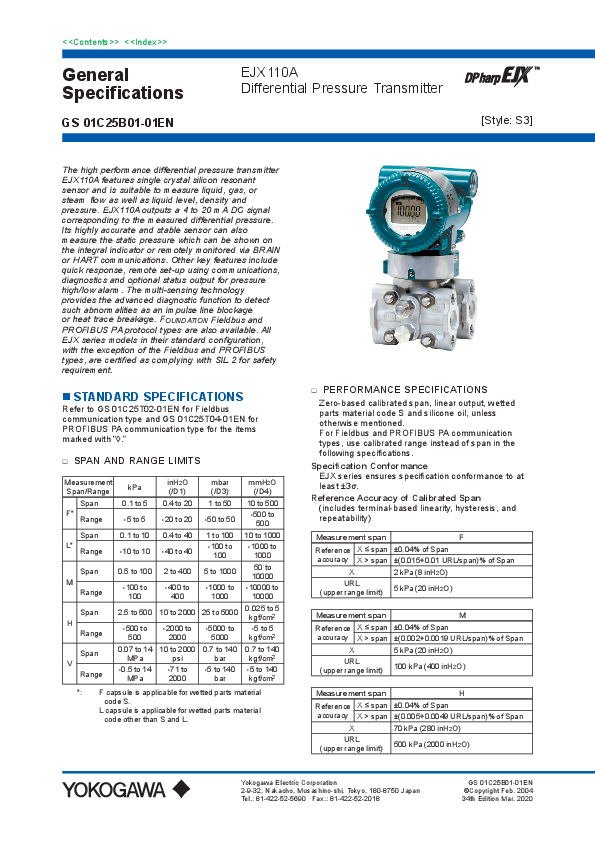 General Specifi cations <<Contents>> <<Index>> EJX110A Differential Pressure Transmitter Yokogawa Electric Corporation 2-9-32, Nakacho, Musashino-shi, Tokyo, 180-8750 Japan