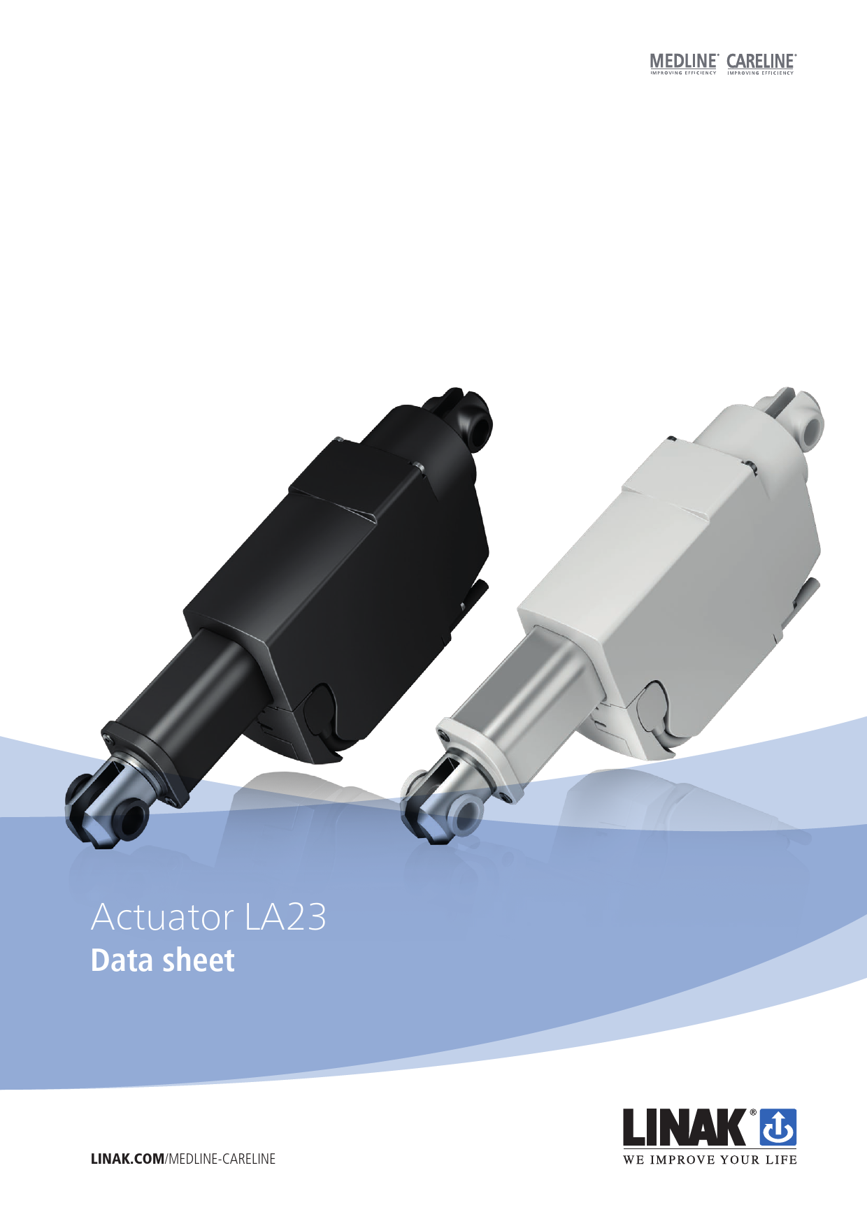 Actuator LA23 Data sheet LINAK.COM/MEDLINE-CARELINE LA23 The LA23 actuator is a small and strong push/pull actuator (up to 2,500 N). The LA23 can be used in various applications where size is important. Some of the benefits the LA23 offers you are: · Compact design · High lifting force · Exchangeable cables Features and options: · Load in push: 2,500 N, 1,800 N, 1,500 N, 1,200 N, 900 N or 300 N · Load in pull: 2,500 N, 1,800 N, 1,500 N, 1,200 N, 900 N or 300 N · Housing colour: Black (RAL 9005), outer tube steel or black Light grey (RAL 7035), outer tube steel · Protection class: IPX4, IPX6 · Motor: 12 V DC, 24 V DC · Stroke length: 20 - 500 mm (for stroke 300-500 mm max. load is 1,000 N for pitch 3, 5, 6 and 9) Pitch 12 mm (for stroke 300-500 mm max. load is 900 N) Pitch 20 mm (for stroke 300-500 mm max. load is 300 N) · Built-in dimensions: 110 - 146 mm + stroke length · Positioning options: Potential free end stop signals Hall potentiometer or Hall PWM position Single Hall, Dual Hall · Back fixture material: Plastic or steel · Nut: Guided · Safety nut: In push or pull (2,500 N and 1,800 N version only safety nut in push) · Mechanical spline: Yes · Built-in electrical end-stop: Yes · Exchangeable cable: Yes · Static safety factor: 2.5 · Noise level: Max. 58.5 dB(A) (At nominal voltage and with no load, according to EN ISO 3743-1) · Mechanical end stop: Yes · Integrated Control: Yes Usage: · Duty cycle: 10%, 2 minutes continuous use followed by 18 minutes not in use · Usage temperature: +5° - +40° normal operating temp. -30° - +50° according to test conditions: ISO 7176-9 · Storage temperature: -45°C to +70°C (according to ISO 7176-9) · Compatibility: Compatible with LINAK control boxes. Please contact LINAK. · Approvals: IEC60601-1, ANSI/AAMI ES60601-1, CAN/CSA 22.2 No 60601-01. LA23IC is not approved according to the above. LA23 in combination with CBD4, CBD5 & CBD6 has no approvals. · Flammability rating: Enclosure UL94-V0 LINAK.COM/MEDLINE-CARELINE LA23 Ordering example: 23 6 1 A 0 1 0 00 250 A 4 IP degree: 4 = IPX4 6 = IPX6 Motortype: A = 12 V B = 24 V (Running mainly with battery (CBJ1, CBJ2, CBJH, CBJC, wheelchairs)) G = 24 V (For OpenBus (CB20, CB16, CB6s)) not available with LA23IC Stroke: XXX = mm Min. 020 mm, Max. 300 mm in steps of 5 mm Recommended versions: 020 mm , 050 mm , 100 mm, 150 mm, 200 mm, 250 mm, 300 mm Positioning: 00 = No positioning 01 = Potential free end stop signals 02 = Dual Hall digital positioning 03 = Dual Hall PNP positioning 1x = Hall potentiometer feedback 2x = Hall potentiometer feedback and potential free endstop 3x = Hall PWM position feedback 4x = Hall PWM position and potential free endstop 50 = IC with standard electrical endstop - no positioning 52 = IC with Standard Single Hall Positioning 6x = IC with Hall potentiometer feedback. 7x = IC with Hall PWM position feedback Xx for more information please call LINAK Safety option: 0 = No safety options 1 = Safety nut for push 2 = Safety nut for pull 3 = Mechanical spline without safety nut 4 = Mechanical spline with safety nut (pitch 3, 5, 6, 9, 12 or 20) (pitch 3, 5, 6, 9 or 12) (pitch 6, 9 or 12) (pitch 3, 5, 6, 9 or 12) (pitch 3, 5, 6, 9 or 12)) Housing colour: 1 = Black (RAL 9005) 2 = Light grey (RAL 7035) 3 = Black (RAL 9005) + black outer tube Piston rod eye: 0 = Standard (steel) with slot (6.1 mm), eye Ø10.2 mm, incl. plastic bushings 1 = Standard (steel) with slot (6.1 mm), eye Ø10.2 mm (0231033) 2 = Standard (steel) with slot (6.1 mm), eye Ø12.3 mm (0231016) Back fixture rotation: 0 = 0° clockwise A = 7.5° clockwise B = 15° clockwise C = 22.5° clockwise D = 30° clockwise E = 37.5° clockwise F = 45° clockwise G = 52.5° clockwise H = 60° clockwise J = 67.5° clockwise K = 75° clockwise L = 82.5° clockwise 1 = 90° clockwise M = 97.5° clockwise N = 105° clockwise P = 112.5° clockwise Q = 120° clockwise R = 127.5° clockwise S = 135° clockwise T = 142.5° clockwise U = 150° clockwise V = 157.5° clockwise W = 165° clockwise Z = 172.5° clockwise Back fixture: 1 = Plastic with slot (6.1 mm), eye Ø10.2 mm (only for Standard push load) (0231017) (only for pitch 6, 9 or 12 and safety option 0 or 1 (push)) 2 = Steel with slot (6.1 mm), eye Ø10.2 mm, incl. plastic bushings 3 = Steel with slot (6.1 mm), eye Ø10.2 mm (0231034) 4 = Steel with slot (6.1 mm), eye Ø12.3 mm (0231020) Spindle type: 2 = 20 mm pitch (300 N) for stroke 200-500 mm max. load = 300N 3 = 3 mm pitch (2,500 N) for stroke 300-500 mm max. load = 1,000 N 5 = 5 mm pitch (1,800 N) for stroke 300-500 mm max. load = 1,000 N 6 = 6 mm pitch (1,500 N) for stroke 300-500 mm max. load = 1,000 N 9 = 9 mm pitch (1,200 N) for stroke 300-500 mm max. load = 1,000 N 0 = 12 mm pitch (900 N) for stroke 300-500 mm max. load = 900 N Actuator type: 23 = LA23 Dimensions: Back fixture orientation Option 1 Back fixture orientation Option 0 Drawing number: 0234024 The built-in dimension depends upon the chosen safety option and stroke length. Please see the table below to decide upon the built-in dimension. Safety option 0 = No safety option 0 = No safety option 1 = Safety nut for push 1 = Safety nut for push 2 = Safety nut for pull 3 = Mechanical Spline for push 3 = Mechanical Spline for push 4 = Mechanical Spline & safety nut for push 4 = Mechanical Spline & safety nut for push 0 = No safety option 0 = No safety option 1 = Safety nut for push 1 = Safety nut for push 2 = Safety nut for pull 3 = Mechanical Spline for push 3 = Mechanical Spline for push 4 = Mechanical Spline & safety nut for push 4 = Mechanical Spline & safety nut for push 0 = No safety option 0 = No safety option 1 = Safety nut for push 1 = Safety nut for push 2 = Safety nut for pull 3 = Mechanical Spline for push 3 = Mechanical Spline for push 4 = Mechanical Spline & safety nut for push 4 = Mechanical Spline & safety nut for push Stroke length 20 - 49 20 - 49 20 - 49 20 - 49 20 - 49 20 - 49 20 - 49 20 - 49 20 - 49 50 - 200 50 - 200 50