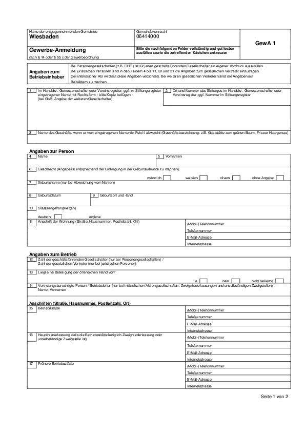 Felder 4 bis 11 Die Felder sind (außer bei inländischen Aktiengesellschaften) immer vollständig auszufüllen. Bei Einzelunternehmen sind hier die Privatdaten des Inhabers / der Inhaberin anzugeben, bei Personengesellschaften (GbR, KG, OHG) die aller Gesellschafter / Gesellschafterinnen und bei juristischen Personen (GmbH, etc.) die aller gesetzlichen Vertreter / Vertreterinnen. Gewerbetreibende ohne Wohnsitz in Wiesbaden fügen bitte als Nachweis ihrer Wohnanschrift eine Kopie des Personalausweises (Vorder- und Rückseite) oder des Reisepasses mit Meldebescheinigung bei.