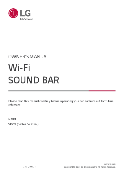 Owner's Manual for LG models including: SP9YA, SPP8-W, 5.1.2 Channel WiFi Soundbar, SP9YA 5.1.2 Channel WiFi Soundbar, WiFi Soundbar, Soundbar