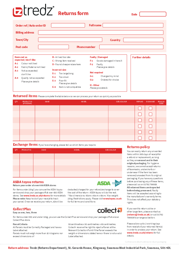 Returns form Date Order ref / Auto order ID Billing address Town/City Post code Full name Phone number Country Items not as expected / don't like A-1 Colour not liked A-2 Fabric/Material not liked A-3 Not as expected/ don't like A-4 Quality not as expected Please give details B - Arrived too late C - Wrong item received D - Found cheaper elsewhere Incorrect size E-1 Too large/long E-2 Too small E-3 Poor fit Please give details E-4 Item is not compatible Faulty / Damaged F-1 Goods damaged in transit F-2 Faulty Please give details Not required G-1 Changed my mind G-2 Ordered for choice H - Other Please give details Further details Returned items Please complete the table below so we can process your return as quickly as possible QTY PRODUCT ID (IF KNOWN) MAKE MODEL SIZE/COLOUR REFUND EXCHANGE REASON CODE Exchange items If you're exchanging, please tell us which items you require QTY PRODUCT ID MAKE MODEL SIZE/COLOUR ASDA toyou returns Return your order at over 600 ASDA stores For items under 25kg* you can use the ASDA toyou deducted/charged for your refund/exchange to cover service and drop your package off at over 600 ASDA the cost of the return - ASDA toyou will do the rest. stores. See www.tredz.co.uk/returns for more details *Max dimensions: 60cm x 60cm x 90cm. Max weight: Please note: Keep hold of your receipt to track 25kg. Restrictions apply. Please visit www.toyou.co.uk your parcel. Once we receive your return, £3 will be for full terms and conditions Returns policy You can easily return any unwanted items within 365 days of receipt for a refund or replacement, as long as they are unused and in their original packaging. For hygiene reasons, we cannot accept returns of facemasks, undershorts or underwear if the item has been removed/unsealed from its original packaging. If you have any questions before purchasing any of these items, please call us on 01792 799508. All returned items are inspected before being processed. Faulty items will be accepted according to the manufacturer's warranty terms. This does not affect your statutory rights. CollectPlus Easy as one, two, three For items under £50 and under 10kg, you can use the Collect Plus service and drop your package off at a local Collect Plus store. Parcel Criteria All Parcels must be Correctly Packaged and have a Label attached. Parcels must not weigh more than 10 kilograms nor exceed dimensions of 50 centimetres x 50 centimetres x 60 centimetres. Collect+ reserve the right to reject a Parcel at the Relevant Collection Point if the Parcel exceeds the weight or dimensions stated here or there is not a valid Label attached. If you want to return a bike or other large item, please contact us (returns@tredz.co.uk) or call 01792 799508 to arrange collection. Please allow up to 2 working days from receipt of your returned item(s) in order to process your return. See www.tredz.co.uk/returns for full details. Cut here and attach address to return packaging Return address: Tredz (Returns Department), St. Gerards House, Kingsway, Swansea West Industrial Park, Swansea, SA5 4DLAdobe PDF Library 15.0 Adobe InDesign 15.1 (Macintosh)