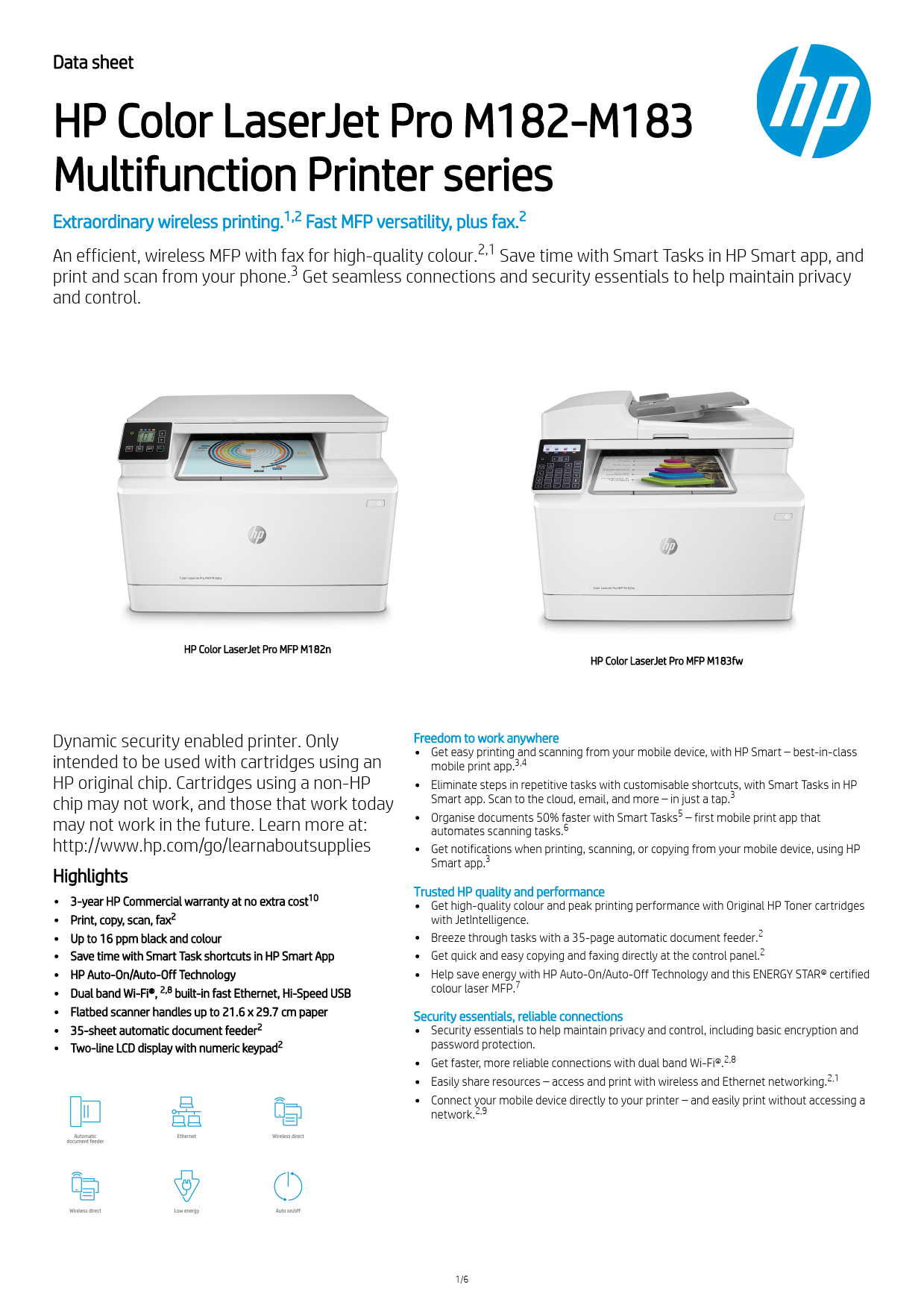 Data sheet HP Color LaserJet Pro M182-M183 Multifunction Printer series Extraordinary wireless printing.1,2 Fast MFP versatility, plus fax.2 An efficient, wireless MFP with fax for high-quality colour.2,1 Save time with Smart Tasks in HP Smart app, and print and scan from your phone.3 Get seamless connections and security essentials to help maintain privacy and control. HP Color LaserJet Pro MFP M182n HP Color LaserJet Pro MFP M183fw Dynamic security enabled printer. Only intended to be used with cartridges using an HP original chip. Cartridges using a non-HP chip may not work, and those that work today may not work in the future. Learn more at: http://www.hp.com/go/learnaboutsupplies Highlights 3-year HP Commercial warranty at no extra cost10 Print, copy, scan, fax2 Up to 16 ppm black and colour Save time with Smart Task shortcuts in HP Smart App HP Auto-On/Auto-Off Technology Dual band Wi-Fi®, 2,8 built-in fast Ethernet, Hi-Speed USB Flatbed scanner handles up to 21.6 x 29.7 cm paper 35-sheet automatic document feeder2 Two-line LCD display with numeric keypad2 Freedom to work anywhere Get easy printing and scanning from your mobile device, with HP Smart best-in-class mobile print app.3,4 Eliminate steps in repetitive tasks with customisable shortcuts, with Smart Tasks in HP Smart app. Scan to the cloud, email, and more in just a tap.3 Organise documents 50% faster with Smart Tasks5 first mobile print app that automates scanning tasks.6 Get notifications when printing, scanning, or copying from your mobile device, using HP Smart app.3 Trusted HP quality and performance Get high-quality colour and peak printing performance with Original HP Toner cartridges with JetIntelligence. Breeze through tasks with a 35-page automatic document feeder.2 Get quick and easy copying and faxing directly at the control panel.2 Help save energy with HP Auto-On/Auto-Off Technology and this ENERGY STAR® certified colour laser MFP.7 Security essentials, reliable connections Security essentials to help maintain privacy and control, including basic encryption and password protection. Get faster, more reliable connections with dual band Wi-Fi®.2,8 Easily share resources access and print with wireless and Ethernet networking.2,1 Connect your mobile device directly to your printer and easily print without accessing a network.2,9 1/6 Data sheet | HP Color LaserJet Pro M182-M183 Multifunction Printer series Product walkaround HP Color LaserJet Pro MFP M183fw shown 1. Fax 2. Intuitive 2-line LCD control panel with 26 buttons (M183fw only) 3. 16 ppm, A4 4. 150 sheet input tray 5. 35 sheet Automatic Document Feeder 6. Flatbed scanner handles up to 21.6 x 29.7 cm paper 7. Dual band Wi-Fi® (M183fw), built-in fast Ethernet, Hi-Speed USB 8. HP Auto-On/Auto-Off Technology 9. HP Smart - best in class mobile print app Series at a glance Model Product number Functions Print speed First page out from ready mode, black Media capacity Control panel Connectivity Wireless capability Essential security ADF scanning Cartridge yield, black/colour (in pages) HP Color LaserJet Pro MFP M182n HP Color LaserJet Pro MFP M183fw 7KW54A 7KW56A Print, copy, scan Print, copy, scan, fax Up to 16 ppm (black and colour) 11.8 seconds Input/Output:150 sheet/100 sheet 7 segment icon LCD with 6 buttons 2-line LCD with 26 buttons USB connectivity, built-in fast Ethernet USB connectivity, built-in fast Ethernet, Dual band Wi-Fi None Wi-Fi Direct® printing Yes No 35 sheet In-box: ~800/700 A: ~1,050/850 2/6 Data sheet | HP Color LaserJet Pro M182-M183 Multifunction Printer series Accessories, Supplies and Support Supplies Service and Support W2410A HP 216A Black Original LaserJet Toner Cartridge (1,050 pages) W2411A HP 216A Cyan Original LaserJet Toner Cartridge (850 pages) W2412A HP 216A Yellow Original LaserJet Toner Cartridge (850 pages) W2413A HP 216A Magenta Original LaserJet Toner Cartridge (850 pages) UH761E 3 years Standard Exchange for HP Color LaserJet Pro M182-M183 Multifunction Printer series UH757E 3 years Next Business Day exchange for HP Color LaserJet Pro M182-M183 Multifunction Printer series UH764E 3 years Return to Depot for HP Color LaserJet Pro M182-M183 Multifunction Printer series (UH761E - available in all EMEA countries except ME, Adriatic, Africa, South Africa, Israel, Slovenia, Turkey, UH757E - available in Austria, Belgium, Finland, France, Germany, Ireland, Italy, Netherlands, Norway, Portugal, Spain, Sweden, Switzerland, UK, UH764E - available in Adriatic, Africa, EEM, Israel, ME, Moldovia, Romania, South Africa, Slovenia, Turkey) Technical specifications Model Product number Functions Control panel Print Print technology Print speed First page out Print resolution Monthly duty cycle Printer smart software features Standard print languages Fonts and typefaces Print area Duplex printing Copy Copy speed1 Copier specifications Scan Scan speed Scan file format Scanner specifications Scanner advanced features HP Color LaserJet Pro MFP M182n HP Color LaserJet Pro MFP M183fw 7KW54A 7KW56A Print, copy, scan Print, copy, scan, fax 2-line LCD with 26 buttons (0~9 digitals, Star, Pound, Left, Right, OK, 7 segment ICON LCD with 6 buttons (Up, Down, Colour Copy, Monochrome Cancel, Back, Main Setup, Wireless, Colour copy, Monochrome copy, Copy Copy, Setting, Cancel) and 6 indicator light (Ready, Error, CMYK toner low) amount, Dark/light, Copy setup, Start Fax, Redial) and 3 indicator light (Ready, Error, Wireless) Laser Black (A4, normal) Up to 16 ppm; Colour (A4, normal): Up to 16 ppm; Black (A4, ready): As fast as 11.8 sec; Colour (A4, ready): As fast as 13.8 sec; Black (A4, sleep): As fast as 13.4 sec; Colour (A4, sleep): As fast as 14.8 sec; Black (best): Up to 600 x 600 dpi; Colour (best): Up to 600 x 600 dpi; Technology: HP ImageREt 3600; Up to 30,000 pages A4; Recommended monthly page volume: 150 to 1,500 Ethernet networking, HP ePrint, Apple AirPrintTM, Mopria-certified, Google Cloud Print, HP Auto-On/Auto-Off technology, HP Sm