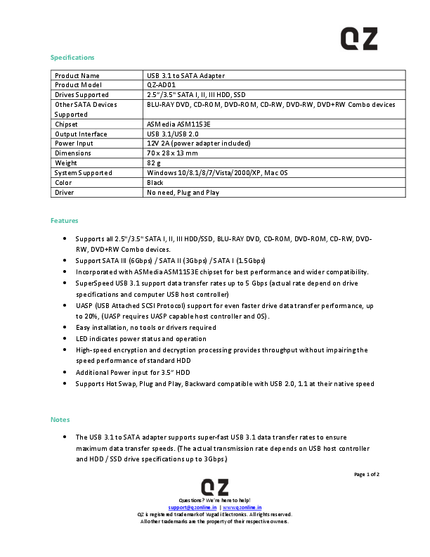 Specifications Product Name Product Model Drives Supported Other SATA Devices Supported Chipset Output Interface Power Input Dimensions Weight System Supported Color Driver USB 3.1 to SATA Adapter QZ-AD01 2.5"/3.5" SATA I, II, III HDD, SSD BLU-RAY DVD, CD-ROM, DVD-ROM, CD-RW, DVD-RW, DVD+RW Combo devices ASMedia ASM1153E USB 3.1/USB 2.0 12V 2A (power adapter included) 70 x 28 x 13 mm 82 g Windows 10/8.1/8/7/Vista/2000/XP, Mac OS Black No need, Plug and Play Features Supports all 2.5"/3.5" SATA I, II, III HDD/SSD, BLU-RAY DVD, CD-ROM, DVD-ROM, CD-RW, DVDRW, DVD+RW Combo devices. Support SATA III (6Gbps) / SATA II (3Gbps) / SATA I (1.5Gbps) Incorporated with ASMedia ASM1153E chipset for best performance and wider compatibility. SuperSpeed USB 3.1 support data transfer rates up to 5 Gbps (actual rate depend on drive specifications and computer USB host controller) UASP (USB Attached SCSI Protocol) support for even faster drive data transfer performance, up to 20%, (UASP requires UASP capable host controller and OS). Easy installation, no tools or drivers required LED indicates power status and operation High-speed encryption and decryption processing provides throughput without impairing the speed performance of standard HDD Additional Power input for 3.5" HDD Supports Hot Swap, Plug and Play, Backward compatible with USB 2.0, 1.1 at their native speed Notes The USB 3.1 to SATA adapter supports super-fast USB 3.1 data transfer rates to ensure maximum data transfer speeds. (The actual transmission rate depends on USB host controller and HDD / SSD drive specifications up to 3Gbps.) Page 1 of 2 Questions? We're here to help! support@qzonline.in | www.qzonline.in QZ is registered trademark of Yugadi Electronics. All rights reserved. All other trademarks are the property of their respective owners. Connect the product to a USB 3.1 port on your computer to achieve maximum transfer speed. The USB 3.1 standard specifies that port connectors will be blue, so it's easy to identify them. Several variables could affect the USB transfer rate - drive specifications and computer USB host controller. With all the reasonable usage environments considered USB 3.1 can achieve average transfer speeds about 3 times faster than that of USB 2.0. Microsoft Windows systems should install latest manufacturer USB 3.1 host controller drivers and Windows Updates for best results. Apple Mac OS X latest operating system updates for best compatibility. The product, however, is backward compatible with USB 2.0, USB 1.1 so you can use the product with any USB-capable computer, and have it work at full function, just at their native speeds. Consider it is normal for the hard disk exterior to reach up to 50 C in temperature during use. The following Seagate SATA drive models may require a firmware upgrade, downloadable from the Seagate official site, before use: ST3000DM001/9YN166/3TB ST2500DM001/9YN16L/2.5TB ST2000DM001/9YN164/2TB ST1000DM003/9YN162/1TB ST500DM005 Please always follow safe ejection procedure to prevent data corruption. Click the `Eject' icon from the tool list at the lower corner of the computer screen. Select `delete HDD safely'. You may now safely unplug the adapter. Questions? We're here to help! support@qzonline.in | www.qzonline.in QZ is registered trademark of Yugadi Electronics. All rights reserved. All other trademarks are the property of their respective owners. Page 2 of 2