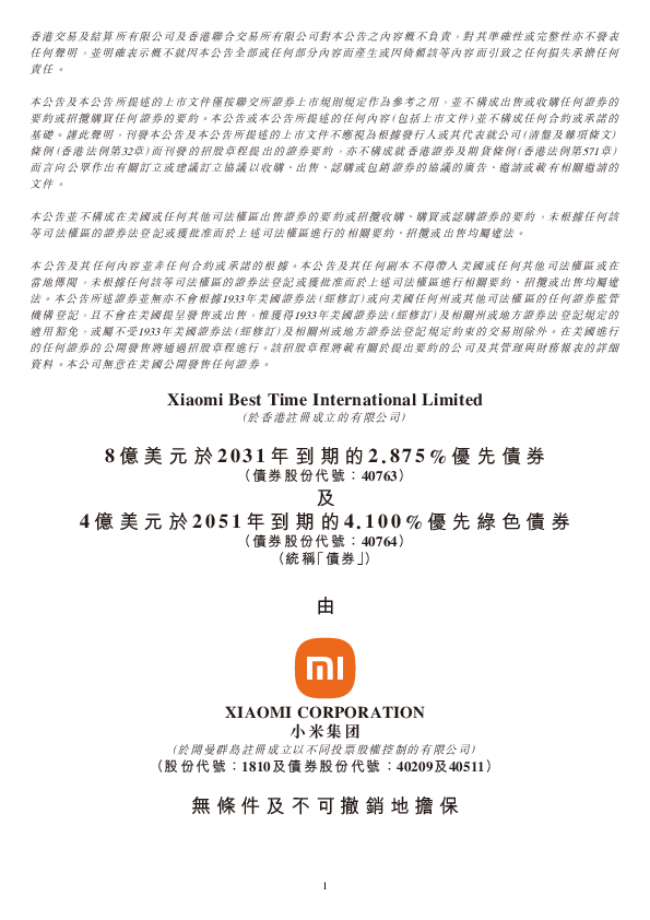 The Bonds will be unconditionally and irrevocably guaranteed (the "Guarantee") by Xiaomi Corporation  (the "Company" or the "Guarantor").