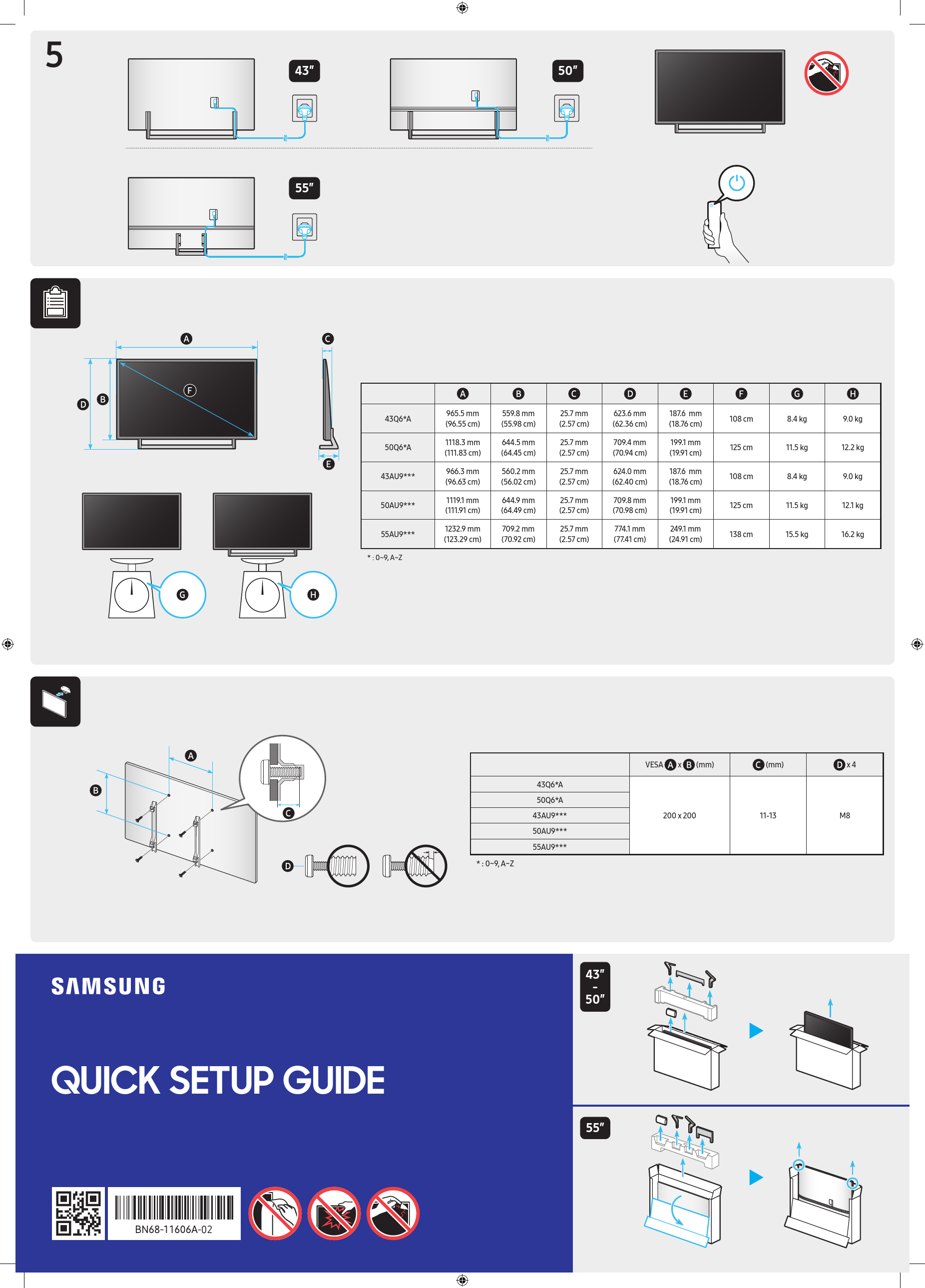 5 43 50 55 43Q6*A 50Q6*A 43AU9*** 50AU9*** 55AU9*** * : 0~9, A~Z 965.5 mm (96.55 cm) 1118.3 mm (111.83 cm) 966.3 mm (96.63 cm) 1119.1 mm (111.91 cm) 1232.9 mm (123.29 cm) 559.8 mm (55.98 cm) 644.5 mm (64.45 cm) 560.2 mm (56.02 cm) 644.9 mm (64.49 cm) 709.2 mm (70.92 cm) 25.7 mm (2.57 cm) 25.7 mm (2.57 cm) 25.7 mm (2.57 cm) 25.7 mm (2.57 cm) 25.7 mm (2.57 cm) 623.6 mm (62.36 cm) 709.4 mm (70.94 cm) 624.0 mm (62.40 cm) 709.8 mm (70.98 cm) 774.1 mm (77.41 cm) 187.6 mm (18.76 cm) 199.1 mm (19.91 cm) 187.6 mm (18.76 cm) 199.1 mm (19.91 cm) 249.1 mm (24.91 cm) 108 cm 125 cm 108 cm 125 cm 138 cm 8.4 kg 11.5 kg 8.4 kg 11.5 kg 15.5 kg 9.0 kg 12.2 kg 9.0 kg 12.1 kg 16.2 kg * : 0~9, A~Z 43Q6*A 50Q6*A 43AU9*** 50AU9*** 55AU9*** VESA x (mm) (mm) 200 x 200 11-13 x 4 M8 43 - 50 QUICK SETUP GUIDE 55 -02 55 x 4 (M4 x L14) 43- 50 1 43-50 55 2 43 - 50 L L R L 2 55 x 2 (M4 x L14) 3 43-50 55 4 43- 50 L R x 2 (M4 x L14) 55
