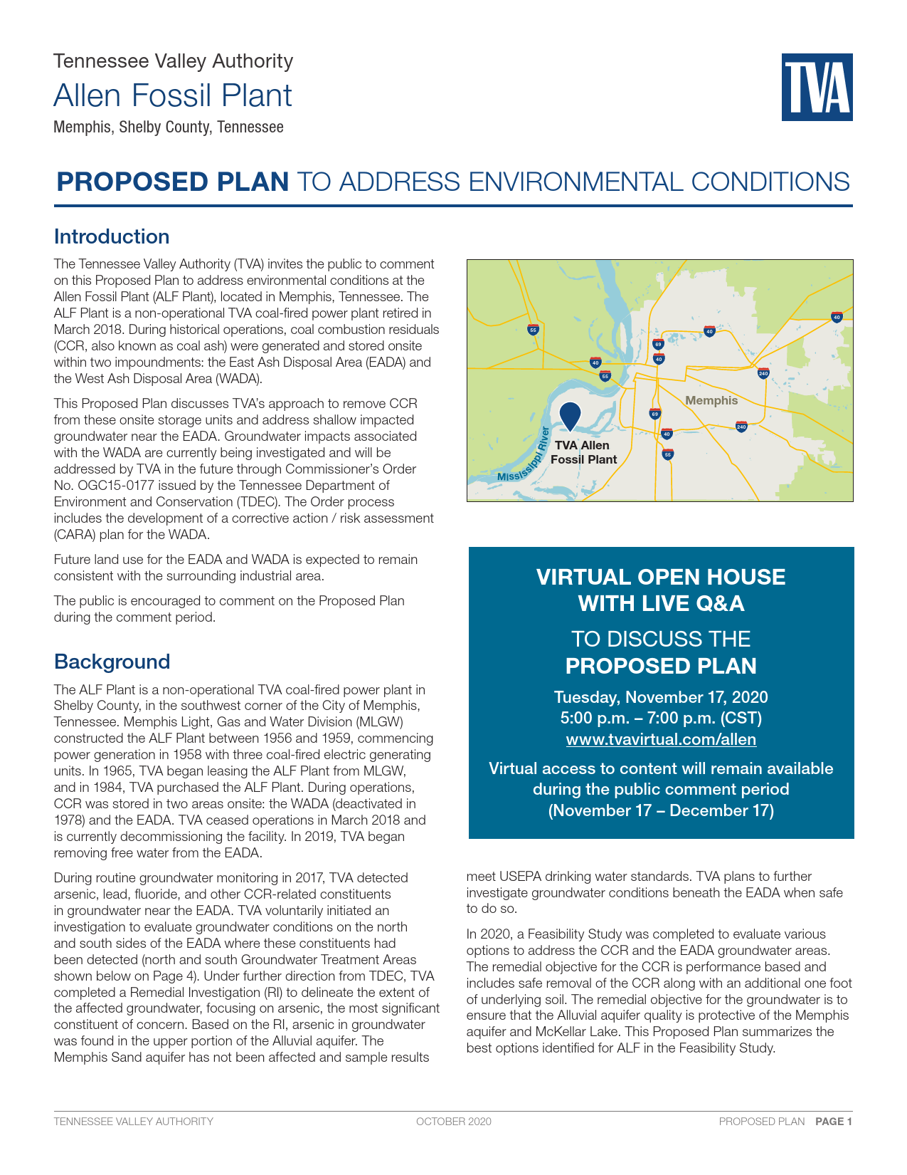 Tennessee Valley Authority Allen Fossil Plant Memphis, Shelby County, Tennessee PROPOSED PLAN TO ADDRESS ENVIRONMENTAL CONDITIONS Introduction The Tennessee Valley Authority (TVA) invites the public to comment on this Proposed Plan to address environmental conditions at the Allen Fossil Plant (ALF Plant), located in Memphis, Tennessee. The ALF Plant is a non-operational TVA coal-fired power plant retired in March 2018. During historical operations, coal combustion residuals (CCR, also known as coal ash) were generated and stored onsite within two impoundments: the East Ash Disposal Area (EADA) and the West Ash Disposal Area (WADA). This Proposed Plan discusses TVA's approach to remove CCR from these onsite storage units and address shallow impacted groundwater near the EADA. Groundwater impacts associated with the WADA are currently being investigated and will be addressed by TVA in the future through Commissioner's Order No. OGC15-0177 issued by the Tennessee Department of Environment and Conservation (TDEC). The Order process includes the development of a corrective action / risk assessment (CARA) plan for the WADA. Future land use for the EADA and WADA is expected to remain consistent with the surrounding industrial area. The public is encouraged to comment on the Proposed Plan during the comment period. Background The ALF Plant is a non-operational TVA coal-fired power plant in Shelby County, in the southwest corner of the City of Memphis, Tennessee. Memphis Light, Gas and Water Division (MLGW) constructed the ALF Plant between 1956 and 1959, commencing power generation in 1958 with three coal-fired electric generating units. In 1965, TVA began leasing the ALF Plant from MLGW, and in 1984, TVA purchased the ALF Plant. During operations, CCR was stored in two areas onsite: the WADA (deactivated in 1978) and the EADA. TVA ceased operations in March 2018 and is currently decommissioning the facility. In 2019, TVA began removing free water from the EADA. During routine groundwater monitoring in 2017, TVA detected arsenic, lead, fluoride, and other CCR-related constituents in groundwater near the EADA. TVA voluntarily initiated an investigation to evaluate groundwater conditions on the north and south sides of the EADA where these constituents had been detected (north and south Groundwater Treatment Areas shown below on Page 4). Under further direction from TDEC, TVA completed a Remedial Investigation (RI) to delineate the extent of the affected groundwater, focusing on arsenic, the most significant constituent of concern. Based on the RI, arsenic in groundwater was found in the upper portion of the Alluvial aquifer. The Memphis Sand aquifer has not been affected and sample results 40 55 40 69 40 40 55 240 ippi River Miss i ss TVA Allen Fossil Plant 69 40 Memphis 240 55 VIRTUAL OPEN HOUSE WITH LIVE Q&A TO DISCUSS THE PROPOSED PLAN Tuesday, November 17, 2020 5:00 p.m. 7:00 p.m. (CST) www.tvavirtual.com/allen Virtual access to content will remain available during the public comment period (November 17 December 17) meet USEPA drinking water standards. TVA plans to further investigate groundwater conditions beneath the EADA when safe to do so. In 2020, a Feasibility Study was completed to evaluate various options to address the CCR and the EADA groundwater areas. The remedial objective for the CCR is performance based and includes safe removal of the CCR along with an additional one foot of underlying soil. The remedial objective for the groundwater is to ensure that the Alluvial aquifer quality is protective of the Memphis aquifer and McKellar Lake. This Proposed Plan summarizes the best options identified for ALF in the Feasibility Study. TENNESSEE VALLEY AUTHORITY OCTOBER 2020 PROPOSED PLAN PAGE 1 Proposed Plan CCR materials are currently stored within the EADA and WADA impoundments. Collectively, 3.5 million cubic yards of CCR are present onsite. Shallow groundwater impacts have been identified at two areas near the EADA: the north area and the south area. Groundwater impacts consist of CCR-related constituents (e.g., arsenic, lead, and fluoride) in the upper portion of the underlying Alluvial aquifer. Although the concentrations of some of these constituents are above groundwater protection standards, impacts to the underlying Memphis aquifer have not been observed. West Ash Disposal Area (WADA) City of Memphis Wastewater Treatment Plant TVA Allen Fossil Plant (retired) McKellar Lake East Ash Disposal Area (EADA) Proposed Plan Summary Approximate Boundary CCR IMPOUNDMENTS: REMOVAL AND OFFSITE DISPOSAL Conducted in accordance with federal and state requirements, this process would include removal of CCR from the EADA and WADA and disposal at an offsite landfill(s). The removal of CCR from the EADA will be performed as the final selected remedy, whereas the removal of the CCR from the WADA will be conducted concurrently to meet TVA's long-standing commitment to environmental stewardship and to support future site re-use. TVA would stabilize residual ponded areas to provide safe working conditions and then remove CCR material, underlying impacted soil, and support structures within the impoundment footprints. CCR removed from the CCR impoundments would be transported by rail or truck to an offsite existing permitted landfill(s) owned and operated by a third party. The potential landfills for this project include South Shelby Landfill (Memphis, TN) and Tunica Landfill (Tunica, MS). Potential haul routes from the ALF Plant to these landfills are shown on Page 3. Following CCR material removal, the areas would be backfilled to grade with clean borrow material to support future site re-use. Several borrow sites have been identified to provide backfill for the CCR excavations. The locations of the borrow sites and haul routes to the ALF Plant are shown on Page 3. To minimize potential traffic effects, a traffic management plan will be developed to manage truck ingress/egress, avoid local low vol