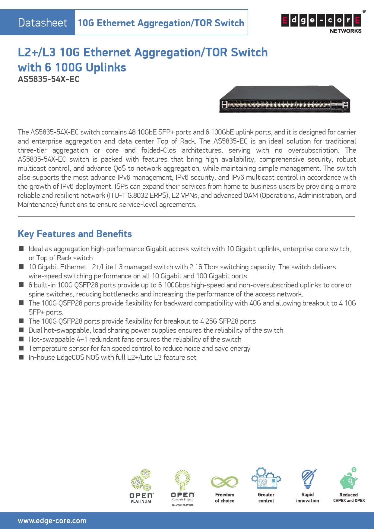 The AS5835-54X-EC switch contains 48 10GbE SFP ports and 6 100GbE uplink ports, and it is designed for carrier and enterprise aggregation and data center ...