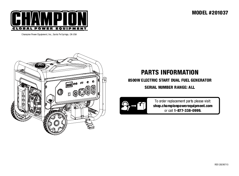 Champion Power Equipment, Inc., Santa Fe Springs, CA USA MODEL #201037 PARTS INFORMATION 8500W ELECTRIC START DUAL FUEL GENERATOR SERIAL NUMBER RANGE: ALL To order replacement parts please visit: shop.championpowerequipment.com or call 1-877-338-0999. REV 20210713 TABLE OF CONTENTS Generator Parts Diagram. . . . . . . . . . . . . . . . . . .. . . . . . . . . . . . . . . . . . . . . . . . . . 3 Generator Parts List . . . . . . . . . . . . . . . . . . . . . . . . . . . . . . . . . . . . . . . . . . . . . . . . . . 4 Engine Parts Diagram . . . . . . . . . . . . . . . . . . . . . . . . . . . . . . . . . . . . . . . . . . . . . . . . 5 Engine Parts Part List . . . . . . . . . . . . . . . . . . . . . . . . . . . . . . . . . . . . . . . . . . . . . . . . 6 Cylinder Head Part Diagram . . . . . . . . . . . . . . .. . . . . . . . . . . . . . . . . . . . . . . . . . 8 Cylinder Head Part List. . . . . . . . . . . . . . . . . . . . . . . . . . . . . . . . . . . . . . . . . . . . . . . 9 Carburetor Part Diagram . . . . . . . . . . . . . . . . . . . . . . . . . . . . . . . . . . . . . . . . . . . . 10 Carburetor Part List . . . . . . . . . . . . . . . . . . . . . . . .. . . . . . . . . . . . . . . . . . . . . . . . . 11 Alternator Part Diagram. . . . . . . . . . . . . . . . . . . . . . . . . . . . . . . . . . . . . . . . . . . . . 12 Alternator Part List . . . . . . . . . . . . . . . . . . . . . . . . . . . . . . . . . . . . . . . . . . . . . . . . . . 13 Fuel Tank Part Diagram . . . . . . . . . . . . . . . . . . . . . . . . . . . . . . . . . . . . . . . . . . . . . 14 Fuel Tank Part List . . . . . . . . . . . . . . . . . . . . . . . . . .. . . . . . . . . . . . . . . . . . . . . . . . . 15 Outlet Panel Part Diagram . . . . . . . . . . . . . . . . .. . . . . . . . . . . . . . . . . . . . . . . . . 16 Outlet Panel Part List. . . . . . . . . . . . . . . . . . . . . . . . . . . . . . . . . . . . . . . . . . . . . . . . 17 Frame Part Diagram . . . . . . . . . . . . . . . . . . . . . . . . . . . . . . . . . . . . . . . . . . . . . . . . . 18 Frame Part List. . . . . . . . . . . . . . . . . . . . . . . . . . . . . . . . . . . . . . . . . . . . . . . . . . . . . . . 19 Wiring Diagram .. . . . . . . . . . . . . . . . . . . . . . . . . . . . . . . . . . . . . . . . . . . . . . . . . . . . . 20 2 201037 - 8500W ELECTRIC START DUAL FUEL GENERATOR GENERATOR PARTS DIAGRAM 1 2 3 See Figure F 4 5 See Figure H 6 78 7 9 12 10 11 13 14 15 16 17 18 19 20 54 21 22 See Figure B 23 24 See Figure E 25 26 7 27 28 29 30 31 32 33 34 35 36 37 38 See Figure G 39 40 41 42 43 44 45 27 46 47 48 49 50 25 51 52 53 Figure A 3 201037 - 8500W ELECTRIC START DUAL FUEL GENERATOR GENERATOR PARTS LIST # Part Number 1 90007-0625-0301 2 90408-Y020110-0005 3 ELYL3Q-YXZJ-F000 4 90698-Y1Z0110-0002 5 ELYL3Q-JJZJ-H000 6 90305-0600-3301 7 90685-D090-0EA0 8 16805-YJ90110-0000 9 90685-D080-0EA0 10 16801-YDK0110-00A1 11 82153-YGM0110-00A0 12 90685-YJ30110-Q200 13 18101-Z0D0310-00A0 14 90008-0410-53 15 18250-YGM0110 16 90007-0612-A301 17 80019-YJP0210-H7A0 18 90001-0816-0305 19 18030-Y730110-000C 20 90001-0816-0109 21 90303-0800-0301 22 R460DNV00FB-CMP310 23 18100-YGM0210-H7A0 24 ELYL3Q-DJZJ-E000 25 90254-0416-51A0 26 16750-YJ30110-0000 27 90124-Y9T0510-00A0 28 16757-YJ30110-0000 29 35190-YJ70210-0000 30 35190-YJ70110-0000 Description Hexagon Flange Bolt, M6 x 25, Black Zinc Flat Washer, Ø6, Black Zinc Fuel Tank Assembly - See Figure F Protective Rubber Sleeve Frame Assembly - See Figure H Hexagon Flange Nut, M6,Black Zinc Clamp, Ø9 × Ø0.8 × 8 Tube, Vent, Air Cleaner, Ø4.5 x Ø8.5 x 100 Clamp, Ø8 × Ø0.6 × 7 Carbon Canister, 750cc Heat Film Clamp, Ø9.5ר8 Muffler Outlet Gasket Hexagon Bolt, M4×10, Black Zinc Spark Arrestor Hexagon Flange Bolt, M6 x 12, Black Zinc Guide Hood, Muffler Hexagon Flange Bolt, M8 x 16, Black Zinc Muffler Support White Zinc Hexagon Flange Bolt, M8 x 16, White Zinc Hexagon Nut, M8, Black Zinc Engine - See Figure B Muffler Alternator Assembly - See Figure E Screw Assembly, M4×16, White Zinc Fuel Valve Assembly Self Tapping Screw, PT5×16 Seat, Fuel Valve Micro Switch 2, Engine Stop Micro Switch 1, Engine Stop Qty. # Part Number 4 31 90001-0625-0305 4 32 90415-0600-Z301 1 33 30009-Y910110-0000 2 34 90303-0600-3305 1 35 90408-0600-E305 2 36 90403-0600-0305 4 37 90312-0600-0301 1 38 35610-YJ80110-H200 1 39 17003-YJ70110-0100 1 40 90001-0612-0305 1 41 31114HYGM0110-0001 1 42 31112HYGM0210-0000 1 43 31110-Y9X0110-00A0 4 44 31115-Y6D0110-0001 1 45 77100-Z6D0110-0000 4 46 90748-1016-00A0 1 47 90729-YJ90110-0000 2 48 90134-YB00110-00A0 1 2 49 16287-YJ30110-0000 2 50 35643-YJ70110-Q2A0 1 51 82007-YJ70110-L400 1 52 90007-0616-A305 1 53 77300-YJ70110-0000 4 54 ELYL3Q-XSQ-0000 1 6 1 1 1 4 Description Qty. Hexagon Flange Bolt, M6 x 25, Black Zinc 1 Lock Washer, Toothed, Black Zinc 1 Grounding Wire 1 Hexagon Nut, M6, Black Zinc 1 Flat Washer, Black Zinc 3 Spring Washer, Black Zinc 2 Wing Nut, M6, Black Zinc 1 Control Panel Assembly - See Figure G 1 Air Cleaner Support, White Zinc 1 Hexagon Flange Bolt, M6 x 12, Black Zinc 1 DC Wire Harness, Engine 1 DC Wire Harness, Barttery 1 Battery 1 Band, 246×20×3.5, Battery 1 Gas Pressure Reducing Valve 1 Clamp, Ø10×16 3 LPG Hose, 9.5×16.8×250 1 Bolt, Cross Hexagon Pan Head, M5 x 12, Black Zinc 3 Dust Cap 1 Knob, Switch Dial, Engine 1 Decorative Cover, PMS 109C 1 Hexagon Flange Bolt, M6 x 16, Black Zinc 4 LPG Hose With Regulator 1 Muffler Assembly 1 201037 - 8500W ELECTRIC START DUAL FUEL GENERATOR ENGINE PARTS DIAGRAM 2 1 67 34 62 66 61 65 60 28 27 26 25 24 70 64 63 59 58 57 68 23 22 69 21 20 18 19 18 17 See Figure C 6 5 4 3 29 11 10 89 7 1516 14 34 30 31 32 73 33 34 35 36 41 43 42 44 28 40 34 37 38 39 45 74 13 12 72 51 52 46 47 48 49 50 71 53 See Figure D 54 55 56 61 Figure B 5 201037 - 8500W ELECTRIC START DUAL FUEL GENERATOR ENGINE PARTS PART LIST # Part Number 1 90001-0612-0101 2 12410-Z0D0110-01A0 3 12004-Z0J0510-0000 4 12003-Z0N0110-0100 5 R460DNV-QGT-C000 6 30010-Z010110-00A0 7 9