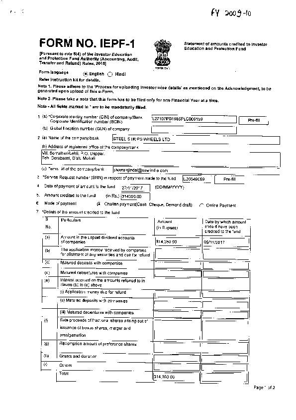 FY :oog -to FORM NO. IEPF-I [Pursuant to rule 5(4) ol tho lnvestor Educadon and Protection Fund Authority (Accounflng, Audit, Transfer and Relund) Rules, 2Oi6I Statemont ol amounts crsdlted to lnvestor Education and Protgction Fund Form language OEng[sh O Htndt Rfr instruction kit for details. l Note Please adhere to the'Process for uploading lnvestor-wise details'as generated upon upload of this e-Form, mon oned on the Acknowledgment, to b Noto 2, Ploase take a note that this form has to be filed only tor one Financiat year at a flme. Notg . All fields marked in * are to be mandatorily fllled. (a)'Corporate identity number (CtN) of company/Bank Corporate ldentification number (BCIN) (b) Global Location number (GLN) of company 1271 07P81 985P1C0061 59 Pre-fill 2 (a) Name of the company/bank STEEL STRIPS WHEELS LTD (b)Address of registered offic of the compa nylbank ll. Somalheri/Lehli, P.O. Dappar, eh. Derabassi, Distt Mohali (c) 'email id of the company/bank shamanJindal@sswlindia.com 3 .Service Request number (SRN) in respecl of payment made to the fu nd u20649059 4. Date of payment of amount to the fund 7tl1t2017 (DD/MMffYYY) Pre-fill 5. fund Amount credited to the (in Rs.) 14350.00 6 Mode ofpayment (a Chatlan payment(Cash, Cheque, Demand draft) C Ontine payment 7.'Oetails of the amount credited to the tund Particulars No (a) Amount in the unpaid dividend accounts of companies Amount (in Rupees) 314.350.00 Date by which amount should have been cred,ted to the fund 05111t2017 (b) The applictron money recetved by companles for allotment of any securities and due for refund (c) Matu.ed deposits with companies (d) Matured debentures with companies (e) lnterest accrued on the amounts referred to tn clause (b) to (d) above (i) Application money due for refund (ii) Matured deposib with companies (ir) lratured debentures wrth companies (f) Sale proceeds of fractional shares arising out of issuance of bonus shares, merger and amalgamation (s) Redemption amount of preference shares (h) Grants and donation (i) Others Totat 314,350.00 Page 1 of 2 8. 'Financialyear to which the amount relates 2009-2010 Attachments 1. Optional attachments, if any Attach List oI attachments SRN u20649059 and DD No ( Remove attachment ' DeclaraUon I have been authorized by the Board of directors' resolution number 4 Dated 23t10t2015 to sign t to- and submit this form. To the best of my knowledge and belief, t declare ttmhhaaettreearulilantldhehear srinnbforeeremsnpaetsicuotPnoPgfrietvhseesnesdhuebrjeei"n-"irUiiotr".ioi"t a trr". that all the requirements of Companies Act, 20'13 and the rules made ma ers incidental thereto have been comptred with I also declare "ndand complete inctuding tho attachments to this form and nothing "o,r"ct *To be digitally signed bY *-- .Designation Company Secretary "DlN of the director; or Membership number PAN of of the the manager or CEO company secretary; or or CFO; PAN or ot Authorized Person of the bank Note: Attention lg also drawn to provisions of Section 448 and section 449 ol companiss Act, 2013 which provide for punishment for false statement and false evidencs' Modity chck Form: P.resirutiny Thiseformhasb6entakenonlilemaintalnedby|EPFAuthoritythroughelectronlcmo of correctnesa glvgn by the company. Submit de and on ths basis of statement Page 2 of 2 MTNISTRY OF CORPORATE AFFAIRS RECEIPT G. A. R.7 SRN: G67613729 Payment made irto: HDFC Bank Received From : Service Request Date | 29/ll/2\lj Name : Address Sushil Kumar Sikka House No. 5441 Sector 38 West Chandi garh, Chandigarh India - 160014 Entity on whose behalfmoncy is paid CIN: Nsme i Address: L27l 07PB I 985PLC006159 STEEL STRIPS WHEELS LTD Vill. Somalheri/Lehli, P.O. Dappar, Teh. Derabassi, Disr!. Mohali. , Punjab India - 140506 Full Particulars of Remittance Service Type: eFiling Service Description Fee For Form IEPF-l Mode ofPayment: Intemet Banking - HDFC Bank Received Payment Rupees: Six Hundred Only Type of Fee Normal Total Amount(Rs.) 600.00 600.00 Note The Registrar may examine this eForm any time after the same is processed by the system under Straight Through process (STp). In case an)' defects the eForm shall hoarveinctoombeplefilteedneasfsreisnhawnyithretshpeecfet eisannodtiacdedditbioyntahlefeRee,-gaissiraaprpi,icthaebnle.th(isPleeaFsoermrefsehraRll ubleetrl0eaoteftjhaend-olmabpeaiendieass defective and (Registration olllces ol]jces and Fees) Rules, 20l4) Uscr lD For Uploading Investor Wise Details : lEPF676t3',729c Password For Uploading Investor Wise Details : 3@EDt!6rDw Page 1 of 2 Important Note : Process for uploadiDg itrvestor wise details f I ou are requested to up oad al I the Investor SE deta s o un cIaimed and un pa d amounts on IEPF Ponal within 7 day s of fi I Forln IEPF 1 The parh fot uploading the lnvestor detai ls s given below :MCA Portal >> lnvestor Services >> Upload lnvestor Details 2. The excel template for the same can be downloaded from IEPF portal itself. 3. you are also requesred to confirm the same on the IEPF Portal within l4 days o l' li ling Form-l EPF- I . Path lbr the same is mentionei below :- MCA Portal >> lnvestor Services >> Confirm Uploaded Files 4. Kindly note that il within t 4 days of fi Iing of Form-tEPF- I Details are not uploaded and confirmed, then the Form will he marked as'Defective'. 5. Ifuploaded details are not confirmed wirhin time limit, then the system will automatically conllrm it, Page 2 of 2 ChalIan No. : U20649059 Challan Da te i 2L/l\/207'7 challan money Paid intso MINISTRY OF CORPORATE AFFAI RS CHAI.LAN .." q.A.-8. ? Expily Dite: 28 / 1'./ 207'1 xn-tie--'-^-1. [x"-"'- (BANK ) (BRANCH) By whoft tendered Nahe: Sushil Kumar Si kl'.a AddreBe House No. 5441 SecLo! 38 l'le6 E Chandigarh , Chand igarh India - CC160C14 roti cy on whose beha If Eonsy i6 Pa d CIN: L2?rO7PB1985PLCo06i59 Name STEEL STRIPS WHEELS LT) 1dre6E : Viil SonaIherl/Lehli' PO Dappar' ' '!eh. Derabassi, Disrt I'lohaLi' rllC-ia 140506 ,r"ri Particutara of Renitt'ance ser.,i-'ifpe, DeposiEs co. in