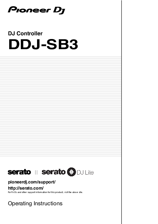 DJ Controller DDJ-SB3 pioneerdj.com/support/ http://serato.com/ For FAQs and other support information for this product, visit the above site. Operating Instructions Contents How to read this manual ! Thank you for buying this Pioneer DJ product. Be sure to read both this guide and the Operating Instructions (Quick Start Guide). Both documents include important information that you must understand before using this product. After reading the instructions, store them in a safe place for future reference. -- For instructions on acquiring the Operating Instructions, see "Acquiring the manual" (page 20). ! In this guide, names of screens and menus displayed on the unit and on the computer screen, as well as names of buttons and terminals, etc., are indicated with brackets. (e.g. [f] button, [Files] panel, [MASTER] output terminals) ! Please note that the screens and specifications of the software described in this guide as well as the external appearance and specifications of the hardware are currently under development and may differ from the final specifications. ! Please note that depending on the operating system version, web browser settings, etc., operation may differ from the procedures described in this guide. This manual consists mainly of explanations of functions of this unit as hardware. For detailed instructions on operating Serato DJ Lite, refer to the Serato DJ Lite Manual. ! The software manual for Serato DJ Lite can be downloaded from "Serato.com". For details, see "Downloading the Serato DJ Lite software manual" (page 20). ! The latest Operating Instructions (this guide) can be downloaded from the Pioneer DJ support site. For details, see "Viewing the latest version of the operating instructions" (page 20). Before start What's in the box ......................................................................................... 3 About Serato DJ Lite.................................................................................... 3 Installing Serato DJ Lite Before installing Serato DJ Lite.................................................................. 4 Installing Serato DJ Lite .............................................................................. 4 Part names and functions Top panel ...................................................................................................... 6 Rear panel .................................................................................................... 9 Front panel ................................................................................................... 9 Connections Connecting input/output terminals ......................................................... 10 Connecting your computer to the unit .................................................... 10 Basic operation Connections ............................................................................................... 11 Starting the system.................................................................................... 12 Quitting the system ................................................................................... 14 Advanced operation Using effects .............................................................................................. 16 Mixing the sound of the microphone....................................................... 17 Analyzing tracks......................................................................................... 17 Utilities mode Launching the utilities mode.................................................................... 18 Changing the settings............................................................................... 18 Additional information Troubleshooting......................................................................................... 19 Acquiring the manual ............................................................................... 20 Using as a controller for other DJ software............................................. 20 About trademarks and registered trademarks ....................................... 21 2 En Cautions on copyrights ............................................................................. 21 Before start English Français Deutsch Italiano Nederlands Español What's in the box ! USB cable ! Warranty (for some regions) ! Operating Instructions (Quick Start Guide) The included warranty is for the European region. DDJ-SB3 DJ Controller Contrôleur pour DJ DJ Controller DJ Controller DJ Controller Controlador DJ Controlador para DJ DJ %+ pioneerdj.com/support/ http://serato.com/ For FAQs and other support information for this product, visit the above site. Concernant les questions les plus fréquemment posées et les autres informations de support à propos de ce produit, veuillez vous rendre sur le site ci-dessus. Besuchen Sie für FAQs und andere Support-Informationen die oben aufgeführte Website. Per FAQ e altre informazioni di supporto per questo prodotto, visitare il sito sopra indicato. Voor FAQ's en andere supportinformatie voor dit product, bezoek de bovengenoemde website. Para consultar las preguntas frecuentes y otra información de soporte de este producto, visite el sitio de arriba. Relativamente às FAQ e outras informações de apoio relacionadas com este produto, visite o site em cima. . -. '"2 Operating Instructions (Quick Start Guide) Mode d'emploi (Guide de démarrage rapide) Bedienungsanleitung (Kurzanleitung) Istruzioni per l'uso (Guida di avvio veloce) Handleiding (Snelstartgids) Manual de instrucciones (Guía de inicio rápido) Manual de instruções (Guia de início rápido) ( ) Português -- For the North American region, the corresponding information is provided on the last page of both the English and French versions of the "Operating Instructions (Quick Start Guide)." -- For the Japanese region, the corresponding information is provided on the back cover of the "Operating Instructions (Quick Start Guide)." About Serato DJ Lite Serato DJ