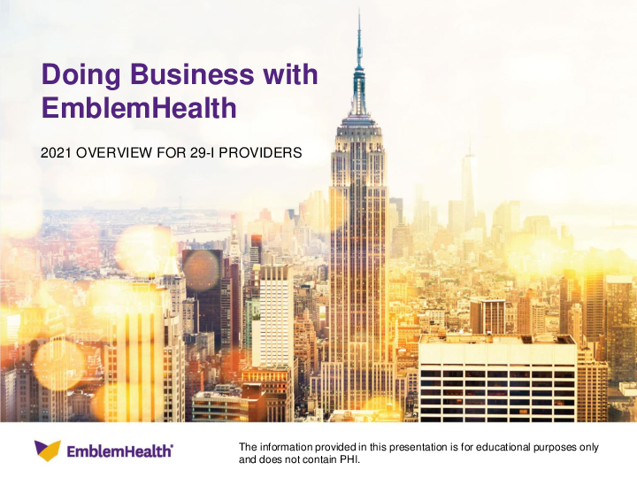 Doing Business with EmblemHealth 2021 OVERVIEW FOR 29-I PROVIDERS The information provided in this presentation is for educational purposes only and does not contain PHI. WELCOME 29-I PROVIDERS During this presentation, we will share information about: · Who we are · Resources for you · How to read our member ID cards · The importance of following access and availability standards · Our managed care partners · Using our secure provider website · Transactions you need to know · Resources to share with members 2 EmblemHealth Legacy, Mission and Values 3 WHO WE ARE · EmblemHealth is one of the nation's largest nonprofit health plans, serving more than 3 million Medical, Dental, and Vision members who live and work across the New York tristate area. · To our members, prospects, and partners, EmblemHealth helps to guide hardworking individuals navigate the medical system, offering straightforward solutions, and making better health more achievable. 4 OUR MISSION Create healthier futures for our customers and communities as an enterprise. 5 Resources for Our Providers 6 EMBLEMHEALTH.COM/PROVIDERS Provider Resources 7 PROVIDER RESOURCES Provider Toolkit 8 PROVIDER RESOURCES Provider Toolkit Tools to Note Send completed Transmittal Forms to Medicaid_Care_Coordination_@emblemhealth.com 9 PROVIDER RESOURCES Join Our Network · Complete Organizational Credentialing application · Provide current and valid 29-I license to operate (if applicable) · Provide valid NPI (National Provider Identifier) · Provide proof of current Professional and General Liability coverage with minimum limits of $1 million per occurrence and $3 million aggregate · Confirmation by primary source that the provider is free of regulatory exclusion, preclusion, or debarment · Confirmation of Medicaid Enrollment (if contracted for Medicaid) · Confirmation of Annual Certification Statement for provider billing Medicaid · Disclosure of Ownership for Medicaid · Accreditation (if mentioned on application) 10 EMBLEMHEALTH.COM/PROVIDERS Clinical Corner 11 EMBLEMHEALTH.COM/PROVIDERS Claims Corner 12 HOW TO READ OUR ID CARDS Generic ID card with each part explained. · Pay attention to logos and instructions on back of ID card. · Referrals and pre-authorizations are not a guarantee of payment. Member must be eligible for coverage on the date of service. Member name CARD FRONT Plan name CARD BACK Member ID number Network name PCP name Copays Customer service phone number Claims address- This address is where all 29-I's will send their Core health related Claims and Medical OLHRS claims. 13 ID CARDS (Continued) The card below shows when a PCP has not been selected, and unless provided will be auto-assigned to member. 14 ID CARDS (Continued) Managing entities (Healthcare Partners, Montefiore or SOMOS) 15 Access to Care 16 FOLLOW ACCESS AND AVAILABILITY STANDARDS · Keep your 29-I address information and contact's current. · Know your network participation. Have you contracted (in-network/par) with EmblemHealth and/or Beacon Health Options for behavioral health services? · If your member requires clinical care after office hours, please contact the Nurse Triage line at 877-444-7988. Foster Care Initial Health Services and Ongoing Assessment and Treatment Time Frame 24 Hours 5 Days 10 Days 30 Days 30 Days 30 Days Activity Mandated Activity Initial screening/screening for X abuse/neglect For children under the age of 13, conduct X HIV risk assessment * Request consent for release of medical X records & treatment Initial medical assessment X Initial dental assessment X Initial mental health assessment X Mandated Who Performs Time Frame X Health practitioner (preferred) or child welfare caseworker X Child welfare caseworker or designated staff X Child welfare caseworker or health staff X Health practitioner X Health practitioner R Mental health practitioner 30 Days 45 Days Family Planning Education and X X Health practitioner Counseling and follow-up health care for youth age 12 and older (or younger as appropriate) Initial developmental assessment X R Health practitioner 45 Days Initial substance abuse assessment R R Health practitioner 60 Days Follow-up health evaluation R R Health practitioner 17 Managing Entities and Special Programs 18 MANAGING ENTITIES AND SPECIAL PROGRAMS EmblemHealth contracts with several delegated entities to provide care to it's members (in addition to other providers). The delegated entity is listed on the member's ID card. When a member is assigned or chooses a PCP associated with one of the delegated entities, the delegated entity will be responsible for coordinating care, as well as, utilization management and case management. Montefiore CMO HealthCare Partners (HCP) SOMOS Reminder: As a 29-I health facility, you will never send CLHRS/OLHRS claims to any of the managing entities listed above 19 MANAGING ENTITIES AND SPECIAL PROGRAMS EmblemHealth also contracts with provider/vendors to provide special programs for members. These provider/vendors are considered network providers. Preauthorization, if required, must be obtained directly from these vendors. · Core Limited Services (VFCA/ Foster Care population only) · Other Limited Health-Related Services (VFCA/Foster Care population only) · Behavioral Health (Beacon) · Vision (EyeMed) · Dental (DentaQuest) · Physical and Occupational Therapy (Palladian) · Pharmacy/Specialty Pharmacy (Express Scripts and Accredo) · Cardiology, DME, Inpatient Rehab, Home Health, LTC, Radiology, Radiation Therapy, SNF (eviCore) · Spine surgery and pain management (OrthoNet) · Laboratory services (Quest Diagnostics) 20 VOLUNTARY FOSTER CARE AGENCY (29-I)/FOSTER CARE POPULATION ONLY Beginning July 1, 2021, EmblemHealth will be responsible for covering the following 29-I Health Facility services for eligible Medicaid members in NY State: 1. Core Limited Health-Related Services (CLHRS) on a per diem basis, inclusive of: Nursing Services, Skill Building Licensed