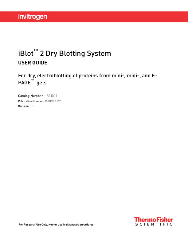 iBlotTM 2 Dry Blotting System USER GUIDE For dry, electroblotting of proteins from mini-, midi-, and EPAGETM gels Catalog Number IB21001 Publication Number MAN0009112 Revision E.0 For Research Use Only. Not for use in diagnostic procedures. Life Technologies Corporation | 5781 Van Allen Way | Carlsbad, CA 92008 For descriptions of symbols on product labels or product documents, go to thermofisher.com/symbols-definition. The information in this guide is subject to change without notice. DISCLAIMER: TO THE EXTENT ALLOWED BY LAW, THERMO FISHER SCIENTIFIC INC. AND/OR ITS AFFILIATE(S) WILL NOT BE LIABLE FOR SPECIAL, INCIDENTAL, INDIRECT, PUNITIVE, MULTIPLE, OR CONSEQUENTIAL DAMAGES IN CONNECTION WITH OR ARISING FROM THIS DOCUMENT, INCLUDING YOUR USE OF IT. Revision history: Pub. No. MAN0009112 Revision E.0 D.0 Date 10 January 2019 15 March 2017 Description Replacing pictures in the "Replacing electrical contacts" section. Converted to CCMS. Addition of detailed information on proper method of closing device lid. Important Licensing Information: These products may be covered by one or more Limited Use Label Licenses. By use of these products, you accept the terms and conditions of all applicable Limited Use Label Licenses. NOTICE TO PURCHASER: DISCLAIMER OF LICENSE: Purchase of this software product alone does not imply any license under any process, instrument or other apparatus, system, composition, reagent or kit rights under patent claims owned or otherwise controlled by Life Technologies Corporation, either expressly, or by estoppel. TRADEMARKS: All trademarks are the property of Thermo Fisher Scientific and its subsidiaries unless otherwise specified. ©2019 Thermo Fisher Scientific Inc. All rights reserved. Contents CHAPTER 1 Product information . . . . . . . . . . . . . . . . . . . . . . . . . . . . . . . . . . . . . . . 6 Product contents . . . . . . . . . . . . . . . . . . . . . . . . . . . . . . . . . . . . . . . . . . . . . . . . . . . . . . . . . . . . . . . . 6 Types of products . . . . . . . . . . . . . . . . . . . . . . . . . . . . . . . . . . . . . . . . . . . . . . . . . . . . . . . . . . . 6 iBlotTM 2 Gel Transfer Device contents . . . . . . . . . . . . . . . . . . . . . . . . . . . . . . . . . . . . . . . . . . 6 Before starting . . . . . . . . . . . . . . . . . . . . . . . . . . . . . . . . . . . . . . . . . . . . . . . . . . . . . . . . . . . . . 6 Installing the instrument . . . . . . . . . . . . . . . . . . . . . . . . . . . . . . . . . . . . . . . . . . . . . . . . . . . . 7 Service operation requirements . . . . . . . . . . . . . . . . . . . . . . . . . . . . . . . . . . . . . . . . . . . . . . 8 Unpacking instructions . . . . . . . . . . . . . . . . . . . . . . . . . . . . . . . . . . . . . . . . . . . . . . . . . . . . . . . . . . 8 Upon receiving the instrument . . . . . . . . . . . . . . . . . . . . . . . . . . . . . . . . . . . . . . . . . . . . . . . . 8 Unpacking the iBlotTM 2 Gel Transfer Device . . . . . . . . . . . . . . . . . . . . . . . . . . . . . . . . . . . . 8 iBlotTM 2 Gel Transfer Device . . . . . . . . . . . . . . . . . . . . . . . . . . . . . . . . . . . . . . . . . . . . . . . . . . . . . . 8 Front view . . . . . . . . . . . . . . . . . . . . . . . . . . . . . . . . . . . . . . . . . . . . . . . . . . . . . . . . . . . . . . . . . 8 Rear view . . . . . . . . . . . . . . . . . . . . . . . . . . . . . . . . . . . . . . . . . . . . . . . . . . . . . . . . . . . . . . . . . . 9 Side view . . . . . . . . . . . . . . . . . . . . . . . . . . . . . . . . . . . . . . . . . . . . . . . . . . . . . . . . . . . . . . . . . . 9 About the system . . . . . . . . . . . . . . . . . . . . . . . . . . . . . . . . . . . . . . . . . . . . . . . . . . . . . . . . . . . . . . . 9 iBlotTM 2 Dry Blotting System . . . . . . . . . . . . . . . . . . . . . . . . . . . . . . . . . . . . . . . . . . . . . . . . . 9 Features . . . . . . . . . . . . . . . . . . . . . . . . . . . . . . . . . . . . . . . . . . . . . . . . . . . . . . . . . . . . . . . . . . 10 System components . . . . . . . . . . . . . . . . . . . . . . . . . . . . . . . . . . . . . . . . . . . . . . . . . . . . . . . . 10 System overview . . . . . . . . . . . . . . . . . . . . . . . . . . . . . . . . . . . . . . . . . . . . . . . . . . . . . . . . . . . 10 Description of parts . . . . . . . . . . . . . . . . . . . . . . . . . . . . . . . . . . . . . . . . . . . . . . . . . . . . . . . . . . . . 12 iBlotTM 2 Gel Transfer Device . . . . . . . . . . . . . . . . . . . . . . . . . . . . . . . . . . . . . . . . . . . . . . . . . 12 Blotting roller . . . . . . . . . . . . . . . . . . . . . . . . . . . . . . . . . . . . . . . . . . . . . . . . . . . . . . . . . . . . . 13 Stylus . . . . . . . . . . . . . . . . . . . . . . . . . . . . . . . . . . . . . . . . . . . . . . . . . . . . . . . . . . . . . . . . . . . . 14 Power cord . . . . . . . . . . . . . . . . . . . . . . . . . . . . . . . . . . . . . . . . . . . . . . . . . . . . . . . . . . . . . . . 14 Power adapters . . . . . . . . . . . . . . . . . . . . . . . . . . . . . . . . . . . . . . . . . . . . . . . . . . . . . . . . . . . 14 iBlotTM 2 Transfer Stacks . . . . . . . . . . . . . . . . . . . . . . . . . . . . . . . . . . . . . . . . . . . . . . . . . . . . 15 Guidelines for iBlotTM 2 Transfer Stacks . . . . . . . . . . . . . . . . . . . . . . . . . . . . . . . . . . . . . . . 15 Top stack . . . . . . . . . . . . . . . . . . . . . . . . . . . . . . . . . . . . . . . . . . . . . . . . . . . . . . . . . . . . . . . . . 16 Bottom stack . . . . . . . . . . . . . . . . . . . . . . . . . . . . . . . . . . . . . . . . . . . . . . . . . . . . . . . . . . . . . . 16 Transfer membrane . . . . . . . . . . . . . . . . . . . . . . . . . . . . . . . . . . . . . . . . . . . . . . . . . . . . . . . . 16 iBlotTM Filter Paper . . . . . . . . . . . . . . . . . . . . . . . . . . . . . . . . . . . . . . . . . . . . . . . . . . . . . . . . . 17 iBlotTM 2 absorbent pad . . . . . . . . . 