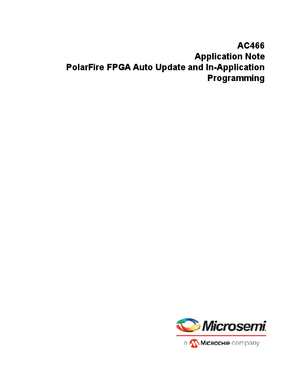 AC466 Application Note PolarFire FPGA Auto Update and In-Application Programming Microsemi Headquarters One Enterprise, Aliso Viejo, CA 92656 USA Within the USA: +1 (800) 713-4113 Outside the USA: +1 (949) 380-6100 Sales: +1 (949) 380-6136 Fax: +1 (949) 215-4996 Email: sales.support@microsemi.com www.microsemi.com ©2021 Microsemi, a wholly owned subsidiary of Microchip Technology Inc. All rights reserved. Microsemi and the Microsemi logo are registered trademarks of Microsemi Corporation. All other trademarks and service marks are the property of their respective owners. Microsemi makes no warranty, representation, or guarantee regarding the information contained herein or the suitability of its products and services for any particular purpose, nor does Microsemi assume any liability whatsoever arising out of the application or use of any product or circuit. The products sold hereunder and any other products sold by Microsemi have been subject to limited testing and should not be used in conjunction with mission-critical equipment or applications. Any performance specifications are believed to be reliable but are not verified, and Buyer must conduct and complete all performance and other testing of the products, alone and together with, or installed in, any end-products. Buyer shall not rely on any data and performance specifications or parameters provided by Microsemi. It is the Buyer's responsibility to independently determine suitability of any products and to test and verify the same. The information provided by Microsemi hereunder is provided "as is, where is" and with all faults, and the entire risk associated with such information is entirely with the Buyer. Microsemi does not grant, explicitly or implicitly, to any party any patent rights, licenses, or any other IP rights, whether with regard to such information itself or anything described by such information. Information provided in this document is proprietary to Microsemi, and Microsemi reserves the right to make any changes to the information in this document or to any products and services at any time without notice. About Microsemi Microsemi, a wholly owned subsidiary of Microchip Technology Inc. (Nasdaq: MCHP), offers a comprehensive portfolio of semiconductor and system solutions for aerospace & defense, communications, data center and industrial markets. Products include high-performance and radiation-hardened analog mixed-signal integrated circuits, FPGAs, SoCs and ASICs; power management products; timing and synchronization devices and precise time solutions, setting the world's standard for time; voice processing devices; RF solutions; discrete components; enterprise storage and communication solutions, security technologies and scalable anti-tamper products; Ethernet solutions; Power-over-Ethernet ICs and midspans; as well as custom design capabilities and services. Learn more at www.microsemi.com. 51900466. 7.0 3/21 Contents 1 Revision History . . . . . . . . . . . . . . . . . . . . . . . . . . . . . . . . . . . . . . . . . . . . . . . . . . . . . 1 1.1 Revision 7.0 . . . . . . . . . . . . . . . . . . . . . . . . . . . . . . . . . . . . . . . . . . . . . . . . . . . . . . . . . . . . . . . . . . . . . . . 1 1.2 Revision 6.0 . . . . . . . . . . . . . . . . . . . . . . . . . . . . . . . . . . . . . . . . . . . . . . . . . . . . . . . . . . . . . . . . . . . . . . . 1 1.3 Revision 5.0 . . . . . . . . . . . . . . . . . . . . . . . . . . . . . . . . . . . . . . . . . . . . . . . . . . . . . . . . . . . . . . . . . . . . . . . 1 1.4 Revision 4.0 . . . . . . . . . . . . . . . . . . . . . . . . . . . . . . . . . . . . . . . . . . . . . . . . . . . . . . . . . . . . . . . . . . . . . . . 1 1.5 Revision 3.0 . . . . . . . . . . . . . . . . . . . . . . . . . . . . . . . . . . . . . . . . . . . . . . . . . . . . . . . . . . . . . . . . . . . . . . . 1 1.6 Revision 2.0 . . . . . . . . . . . . . . . . . . . . . . . . . . . . . . . . . . . . . . . . . . . . . . . . . . . . . . . . . . . . . . . . . . . . . . . 1 1.7 Revision 1.0 . . . . . . . . . . . . . . . . . . . . . . . . . . . . . . . . . . . . . . . . . . . . . . . . . . . . . . . . . . . . . . . . . . . . . . . 1 2 PolarFire FPGA Auto Update and In-Application Programming . . . . . . . . . . . . . . . . . . . . . . . . . . . . . . . . . . . . . . . . . . . 2 2.1 PF_SYSTEM_SERVICES Overview . . . . . . . . . . . . . . . . . . . . . . . . . . . . . . . . . . . . . . . . . . . . . . . . . . . . 3 2.2 Design Requirements . . . . . . . . . . . . . . . . . . . . . . . . . . . . . . . . . . . . . . . . . . . . . . . . . . . . . . . . . . . . . . . 5 2.3 Prerequisites . . . . . . . . . . . . . . . . . . . . . . . . . . . . . . . . . . . . . . . . . . . . . . . . . . . . . . . . . . . . . . . . . . . . . . 5 2.4 Demo Design . . . . . . . . . . . . . . . . . . . . . . . . . . . . . . . . . . . . . . . . . . . . . . . . . . . . . . . . . . . . . . . . . . . . . . 6 2.4.1 Design Implementation . . . . . . . . . . . . . . . . . . . . . . . . . . . . . . . . . . . . . . . . . . . . . . . . . . . . . . . 8 2.5 Clocking Structure . . . . . . . . . . . . . . . . . . . . . . . . . . . . . . . . . . . . . . . . . . . . . . . . . . . . . . . . . . . . . . . . . 18 3 Libero Design Flow . . . . . . . . . . . . . . . . . . . . . . . . . . . . . . . . . . . . . . . . . . . . . . . . . 19 3.1 Synthesis . . . . . . . . . . . . . . . . . . . . . . . . . . . . . . . . . . . . . . . . . . . . . . . . . . . . . . . . . . . . . . . . . . . . . . . . 20 3.2 Place and Route . . . . . . . . . . . . . . . . . . . . . . . . . . . . . . . . . . . . . . . . . . . . . . . . . . . . . . . . . . . . . . . . . . 20 3.2.1 Resource Utilization . . . . . . . . . . . . . . . . . . . . . . . . . . . . . . . . . . . . . . . . . . . . . . . . . . . . . . . . . 20 3.3 Verify Timing . . . . . . . . . . . . . . . . . . . . . . . . . . . . . . . . . . . . . . . . . . . . . . . . . . . . . . . . . . . . . . . . . . . . . 21 3